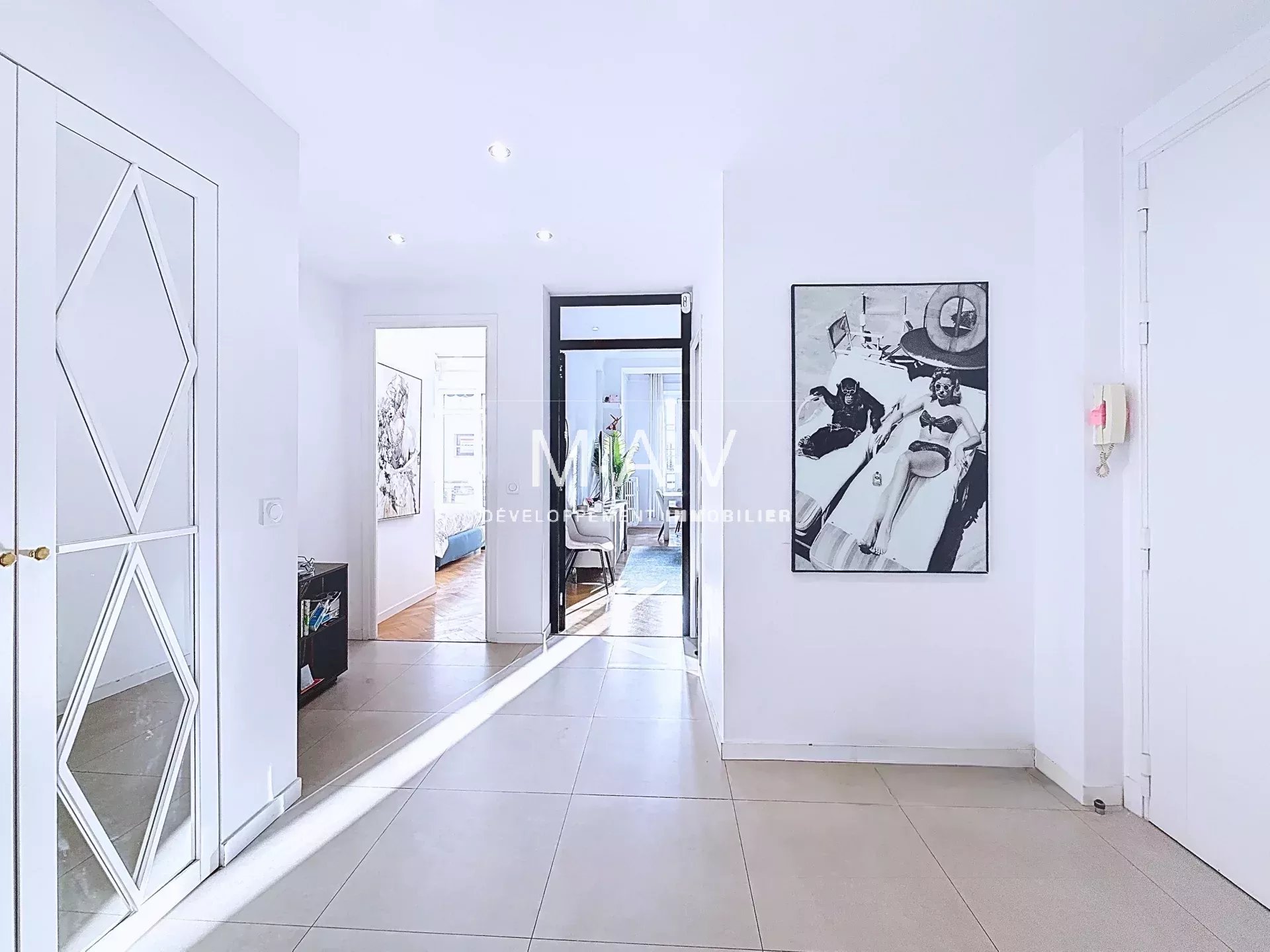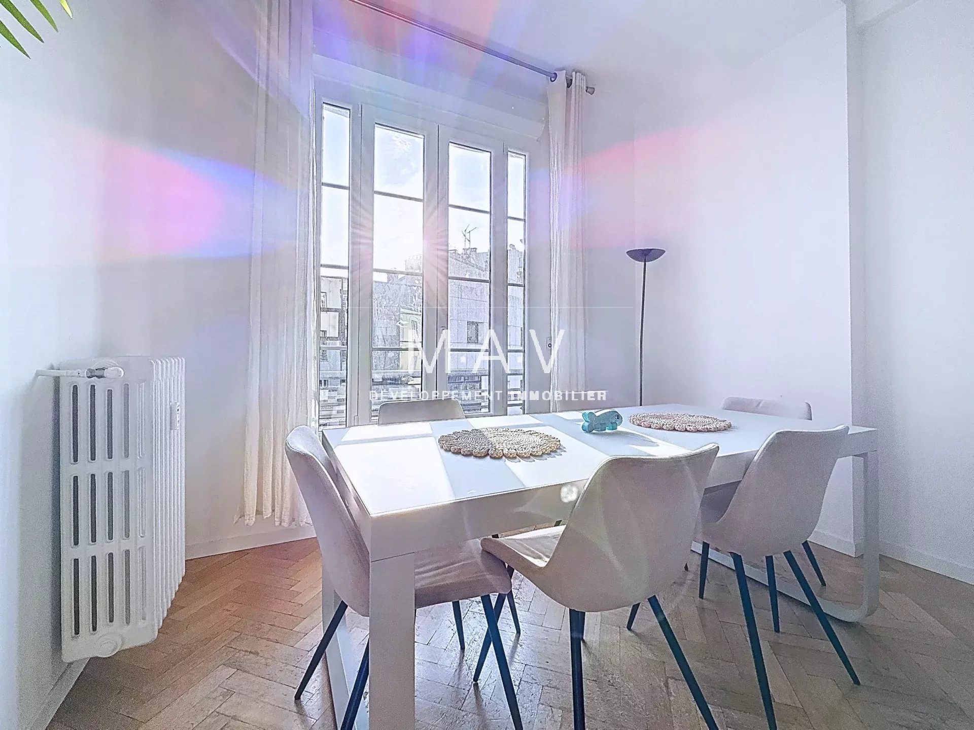 Situé au cœur du Carré d'Or, rue Alphonse Karr, au sein d' un immeuble moderne avec ascenseur. Son emplacement est idéal : à deux pas des commerces de prestige et parfaitement desservi par les lignes 1 et 2 du tramway, assurant une connexion directe entre le Port et l'Aéroport. Nous vous présentons un superbe 4 pièces de 100 m², niché en étage élevé au 4ème étage. Baigné de lumière grâce à sa double exposition Est/Ouest, cet appartement traversant a été rénové avec un souci du détail, offrant des prestations de qualité. Ses Atouts Majeurs : Confort et Esthétisme : Climatisation réversible intégrée dans les faux-plafonds, parquet massif et doubles vitrages. Agencement Optimal : Une entrée accueillante mène à un confortable séjour prolongé par une cuisine ouverte, moderne et entièrement équipée, formant un espace de vie convivial et lumineux. Il se compose d'une élégante suite parentale ouvrant sur un balcon, avec son dressing attenant et sa salle de bain privative avec toilettes. Deux autres chambres avec placards intégrés, ainsi qu'une salle de douche avec WC, complètent l'espace nuit. Le bien est complété par une spacieuse cave de 8 m2 en sous-sol, parking public à seulement 30 mètres de la résidence. Dossier de présentation avec vidéo disponible sur demande.