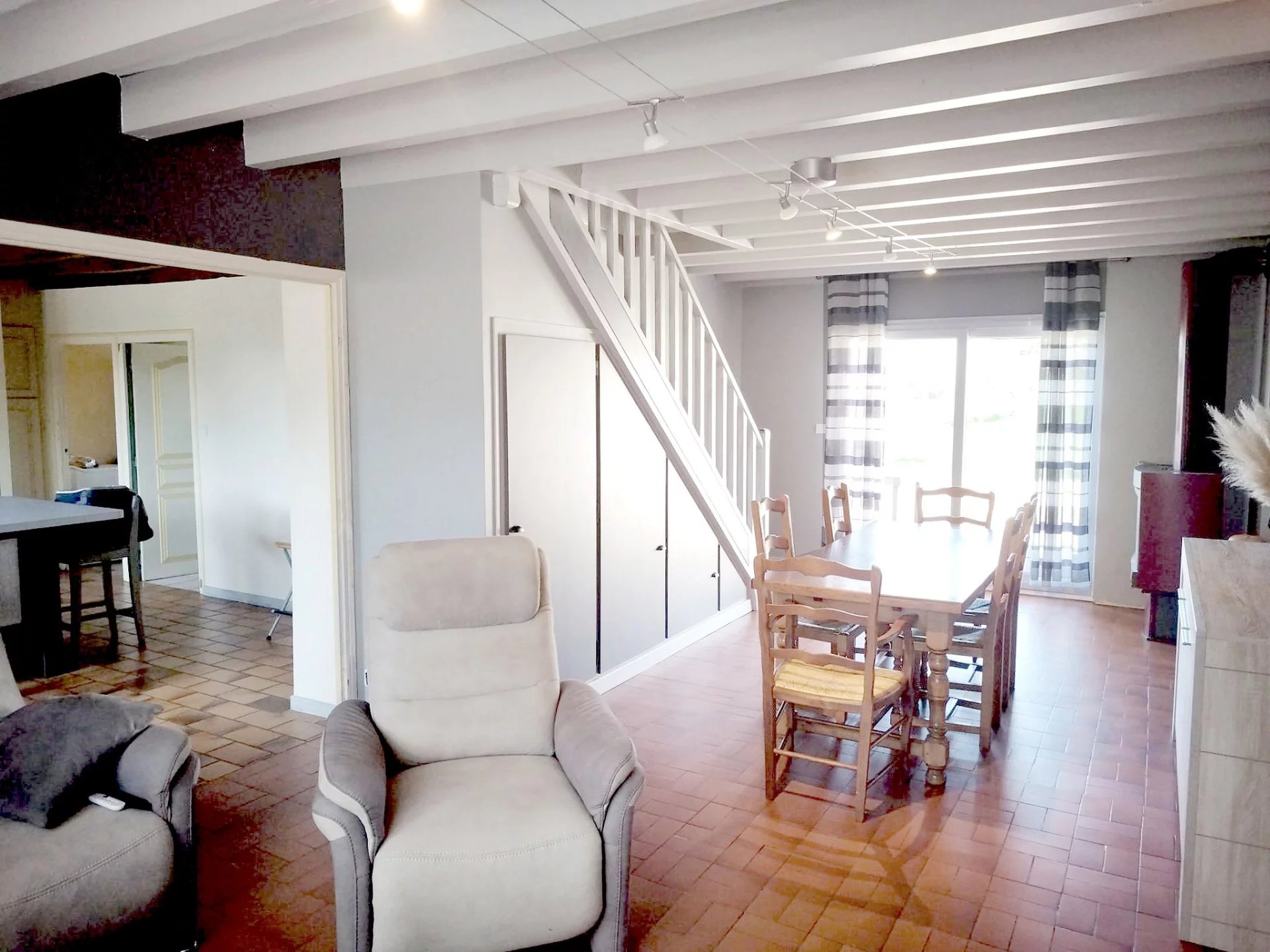 À Pontoux, village proche de la rivière le Doubs, maison de village de 145 m² habitables disposant de 5 chambres. Elle est mitoyenne sur un côté, mais sans inconvénient de voisinage. Elle est composée au rez-de-chaussée, d'une grande cuisine équipée, d'une pièce à vivre salon/séjour avec poêle à bois et dont les fenêtres en PVC sont équipées de volets roulants solaires donnant accès à une terrasse côté jardin. Au même niveau se trouvent une chambre ou bureau, une salle d'eau, un WC, une buanderie /une chaufferie et un cellier. À l'étage un palier qui dessert 4 chambres, une salle de bains spacieuse et un WC indépendant. À l'extérieur, vous profiterez d'un grand terrain de 3 925 m² avec une cour et un vaste jardin, ainsi que des dépendances dont un double garage et un bûcher. L'assainissement est relié au tout-à-l'égout. Ce bien est équipé d'une pompe à chaleur Air/Eau neuve, couplée à une chaudière à bois. Ne nécessitant pas de travaux, cette maison est habitable de suite. Bon DPE de classe C - Date de réalisation du diagnostic énergétique : 13/06/2025 Consommation énergie primaire : 132 kWh/m²/an Consommation énergie finale : 96 kWh/m²/an Montant estimé des dépenses annuelles d'énergie pour un usage standard : entre 990 ? et 1 340 ? sur les années 2021, 2022 et 2023 (abonnements compris). Les informations sur les risques auxquels ce bien est exposé sont disponibles sur le site Géorisques : http://www.georisques.gouv.fr