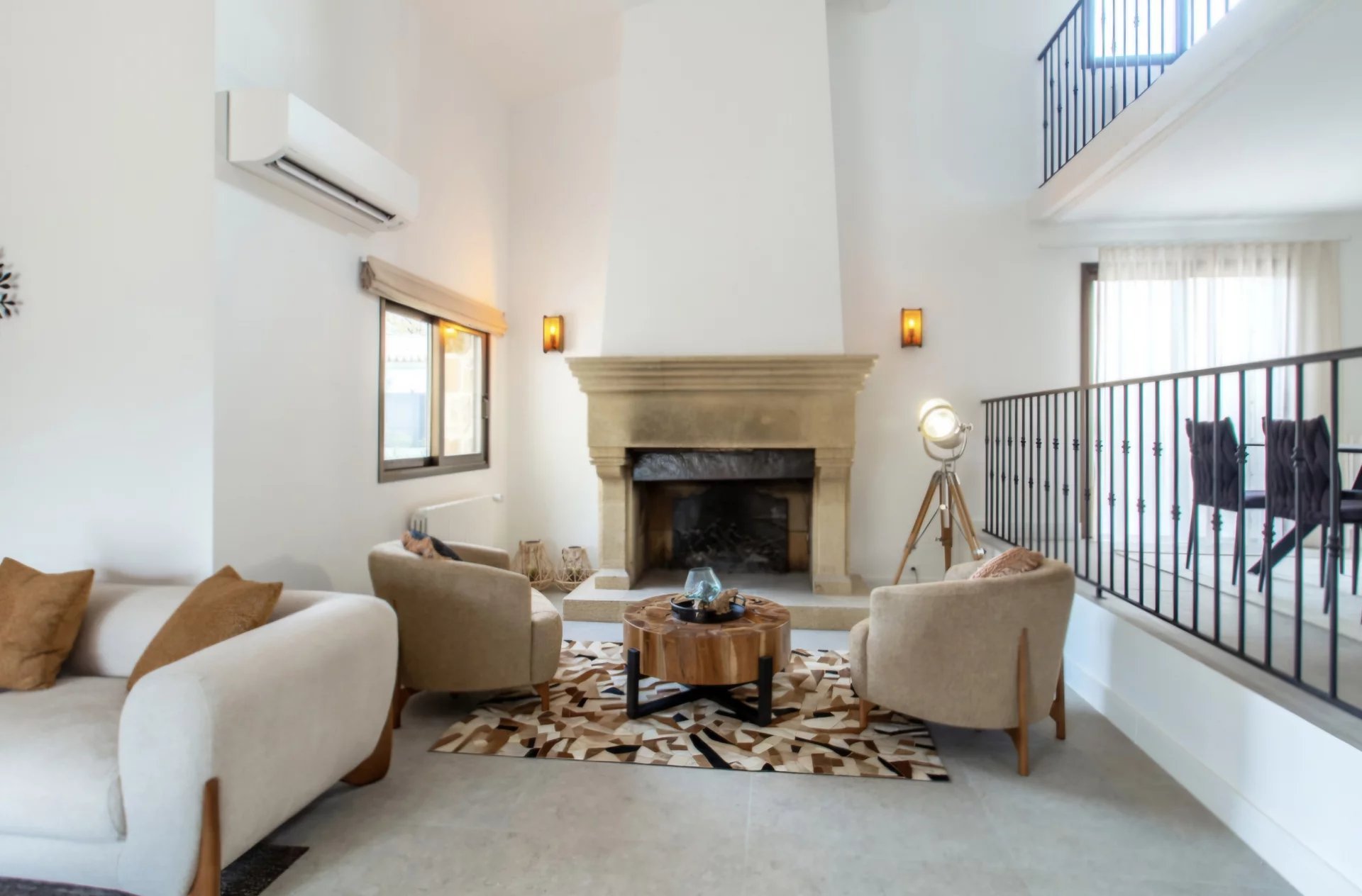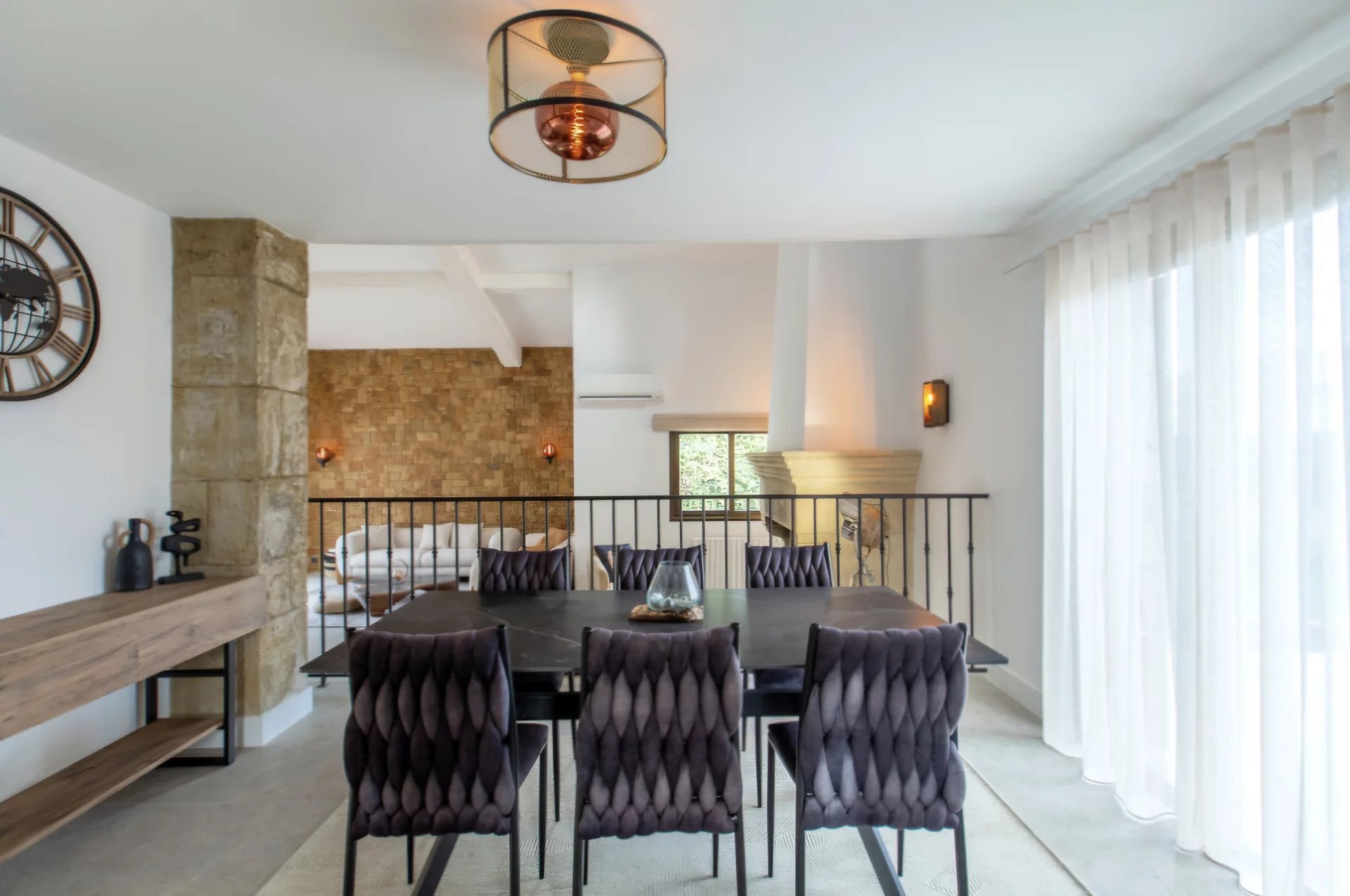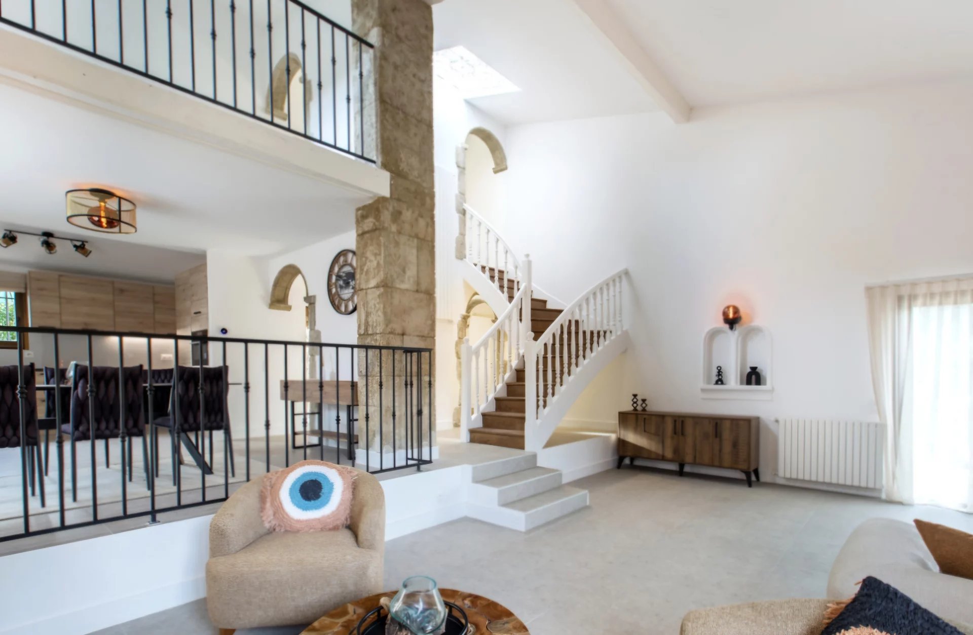 Une élégante entrée ouvrant sur un vaste séjour cathédrale doté d’une cheminée.