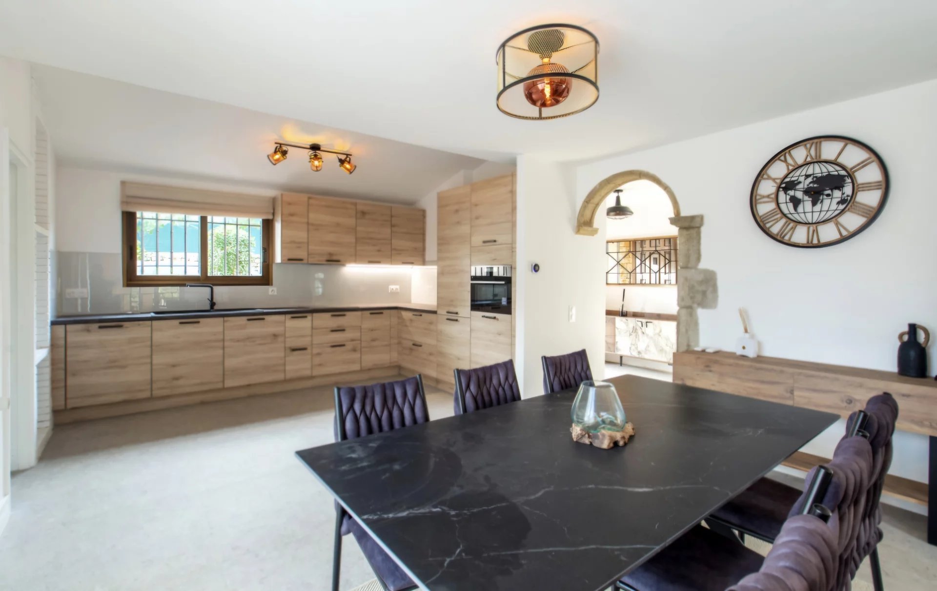 Une cuisine contemporaine avec sa salle à manger attenante.