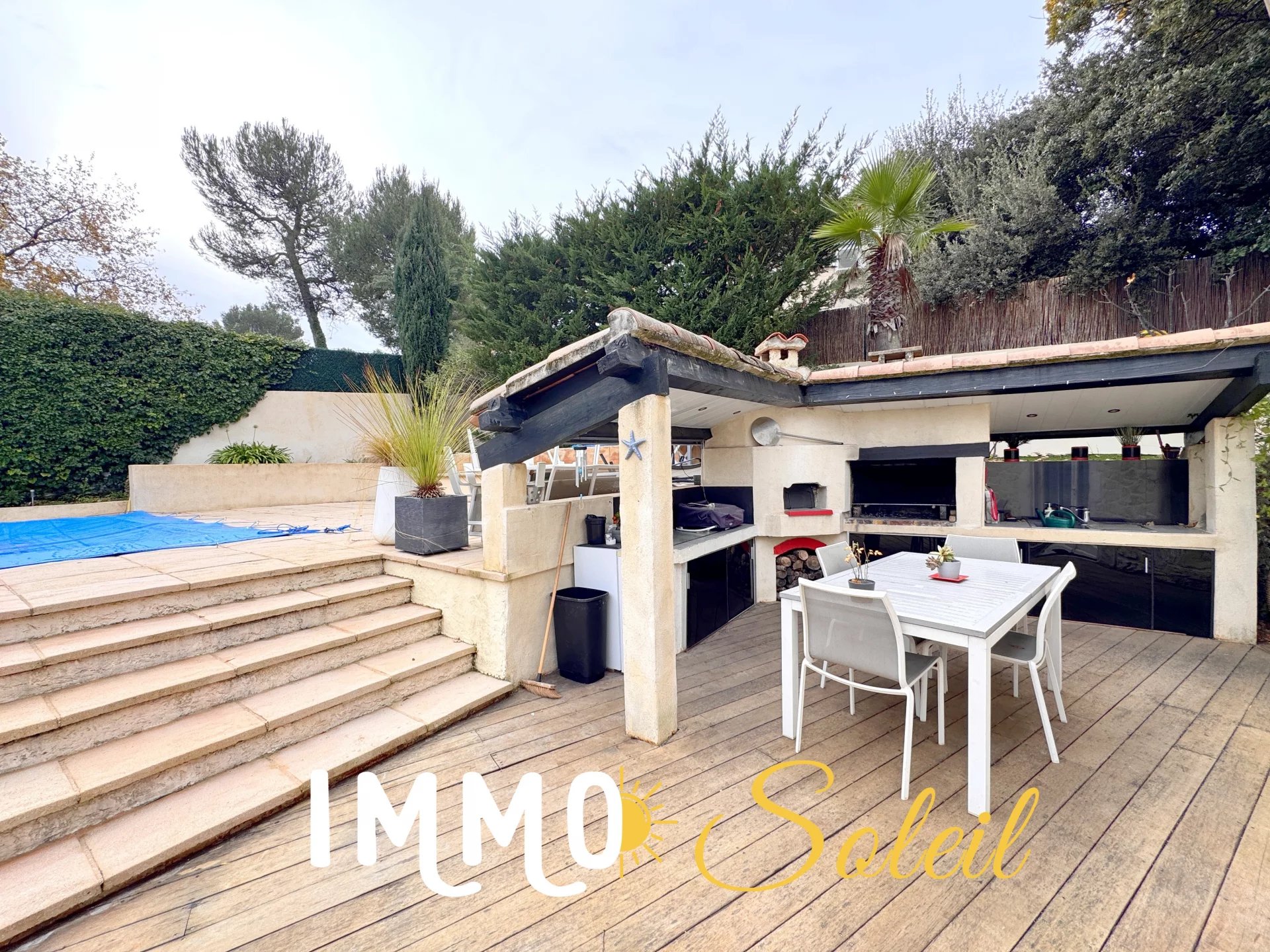 A l'extérieur vous profiterez de plusieurs espaces de vie terrassés, une cuisine d'été avec plan évier, coin plancha, barbecue et four à pizza et une grande piscine 9 x 4,5 ml avec plage autour.