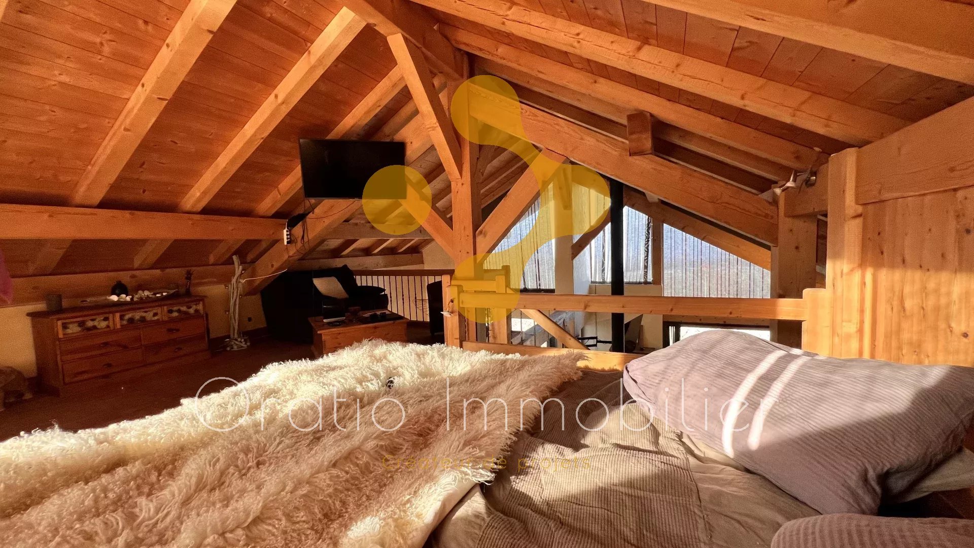 Inondé de lumière, l’intérieur dévoile un séjour cathédrale aux volumes majestueux, un salon en contrebas animé par une cheminée suspendue, et une cuisine sur mesure façonnée par un ébéniste. Quatre chambres, dont une en mezzanine dominant les espaces de vie, ainsi que deux salles de bains contemporaines, complètent l’ensemble.