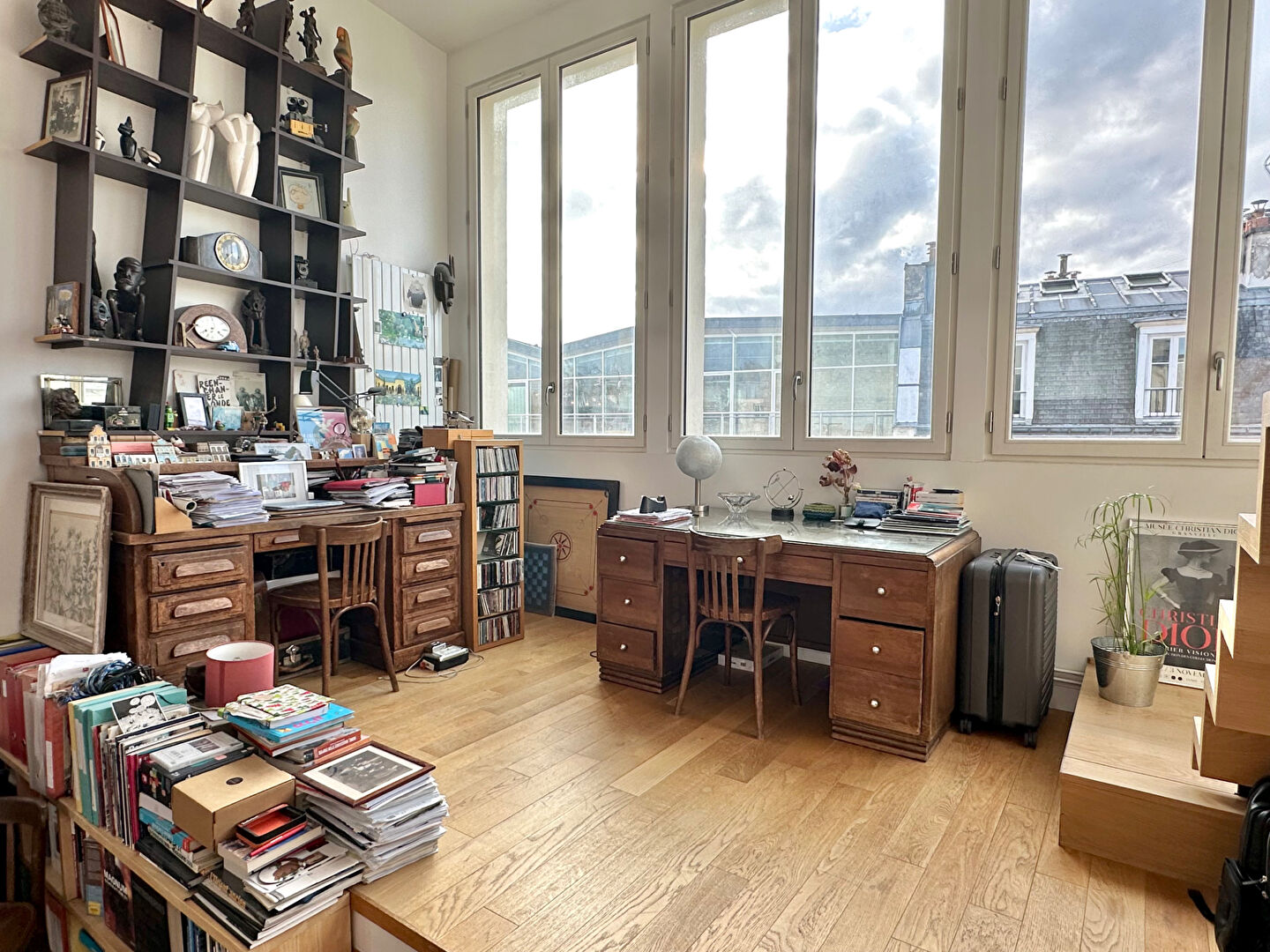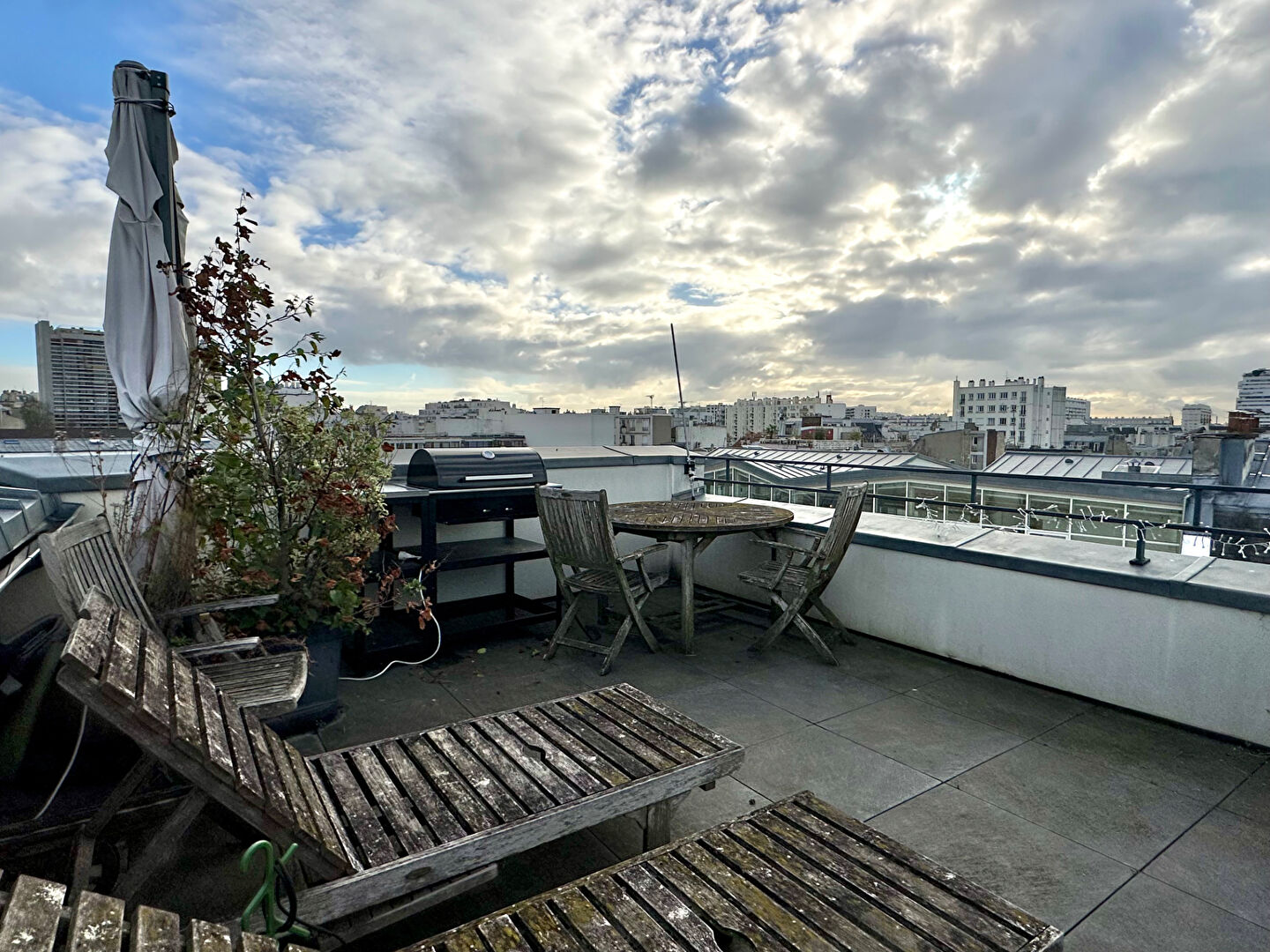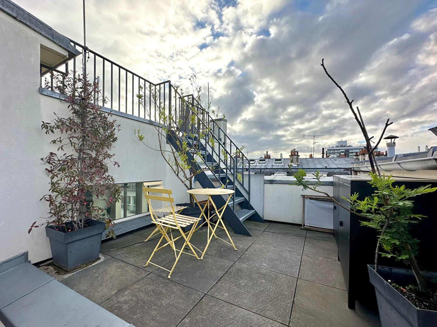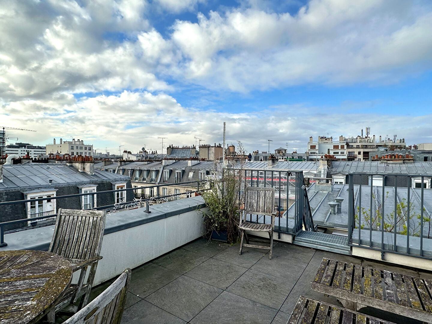 Situé au 4? étage (sans ascenseur) d'un immeuble 1912, ce triplex lumineux de 155 m² avec 40 m² de terrasses, proposé meublé pour une location du 9 janvier au 28 mars (bail de 3 mois). Entièrement rénové en 2018, il propose une belle pièce de réception de de 51 m² avec cuisine ouverte. Le niveau inférieur accueille deux grandes chambres (15 et 16 m²) ainsi qu'une salle de bains complète avec baignoire, douche et WC. A l'étage supérieur, une suite parentale s'organise autour d'un espace bureau, d'une chambre prolongée par un balcon, d'une salle de bains (baignoire et douche) et de WC séparés. Une pièce supplémentaire complète ce niveau, pouvant servir de chambre ou de bureau, et mène directement aux terrasses, dont un rooftop. Chauffage et eau chaude individuels au gaz, DPE C. Honoraires bail loi Alur : 15 euros/m² Honoraires bail code civil : un mois de loyer TTC