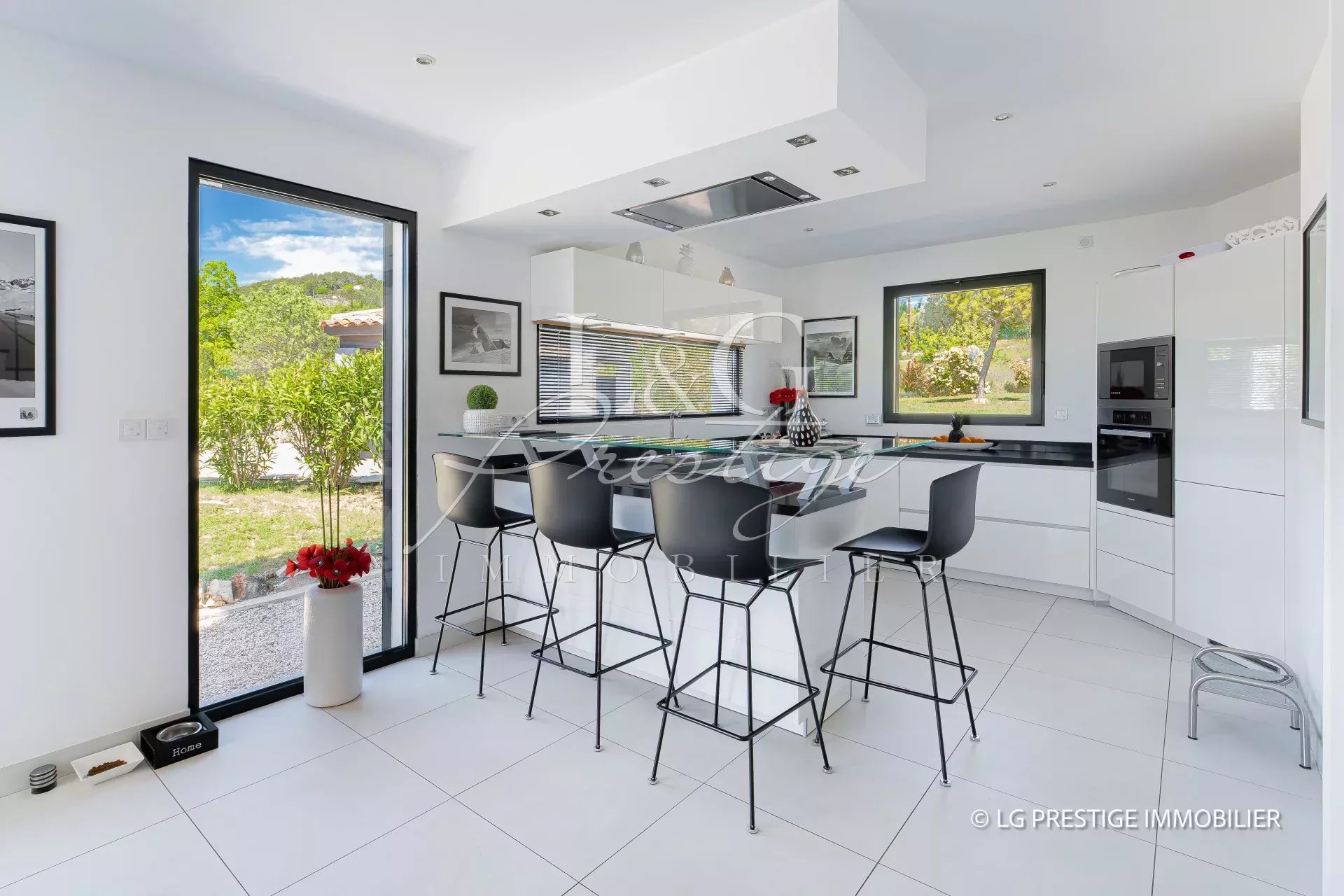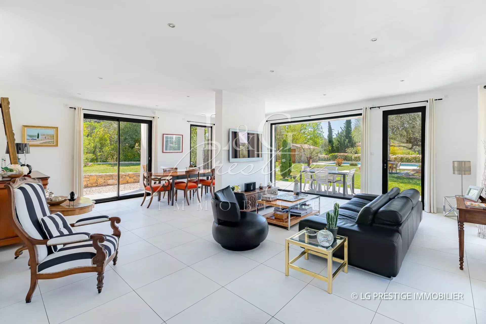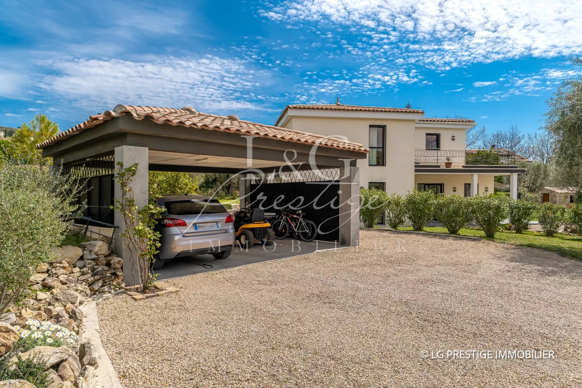 Découvrez votre agence LG Prestige Immobilier de Montauroux, cette villa d'exception, rare sur le marché, située dans un quartier calme et prisé. Offrant une superficie de 230 m², cette propriété se déploie sur un terrain plat de 3 000 m², magnifiquement agrémenté d'oliviers centenaires. Édifiée en 2012, cette villa de standing se compose au rez-de-chaussée d’un vaste séjour lumineux de 50 m², d’une cuisine ouverte moderne, d'une buanderie et d’un WC invité. À l’étage, vous profiterez de trois spacieuses chambres, deux salles de bains avec WC, ainsi qu’un dressing. Les terrasses offrent une vue dégagée, idéale pour savourer des moments de détente. En extérieur, une superbe piscine en mosaïque avec pool-house en pierre, construits en 2021, invitent à la relaxation. Un garage ouvert de 40 m² permet d'accueillir deux véhicules. Reliée au tout-à-l’égout et bénéficiant d’un classement énergétique en « A », cette villa allie confort, modernité et performance énergétique.
