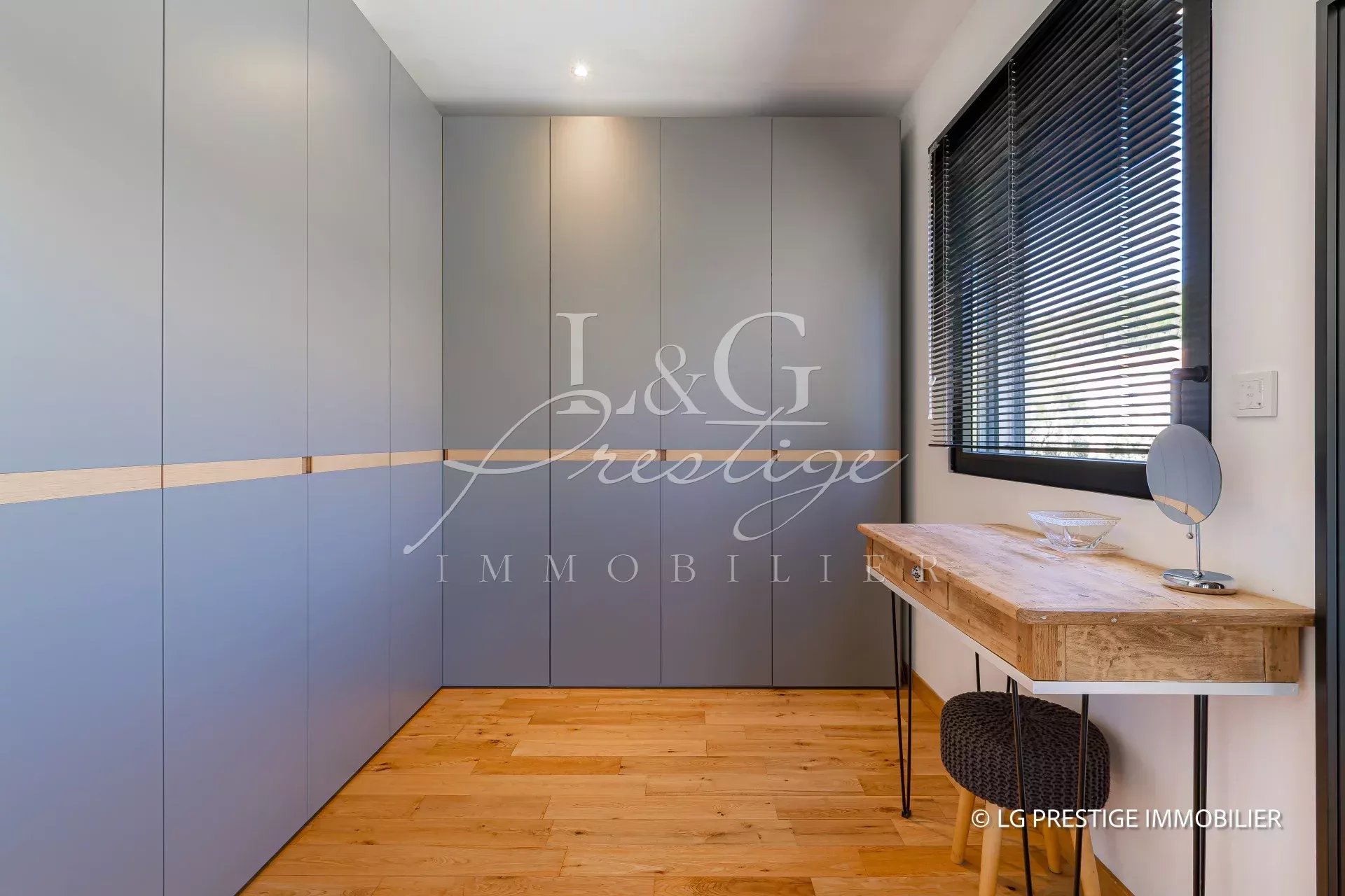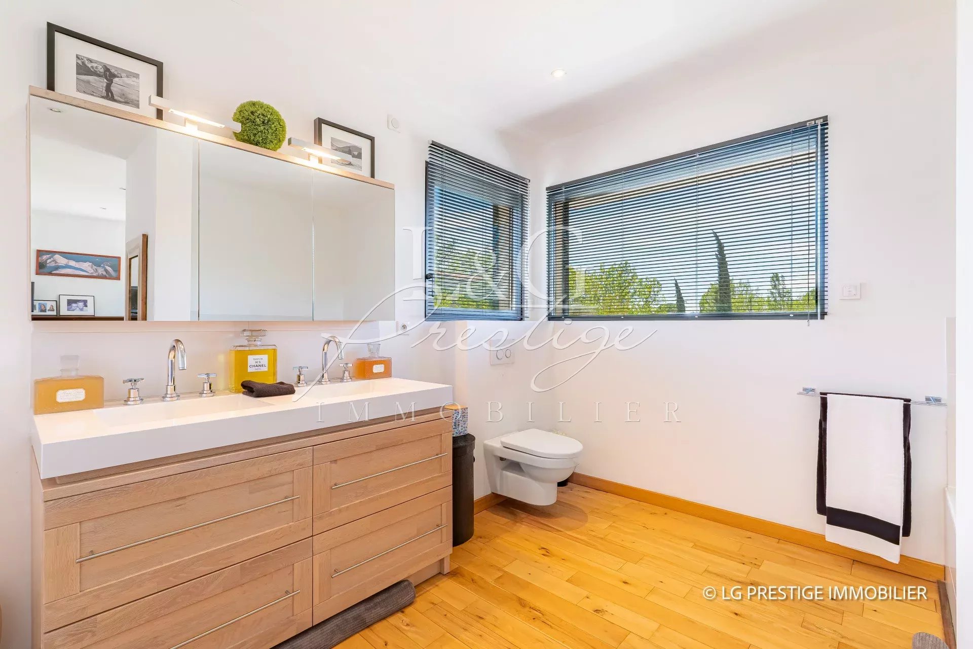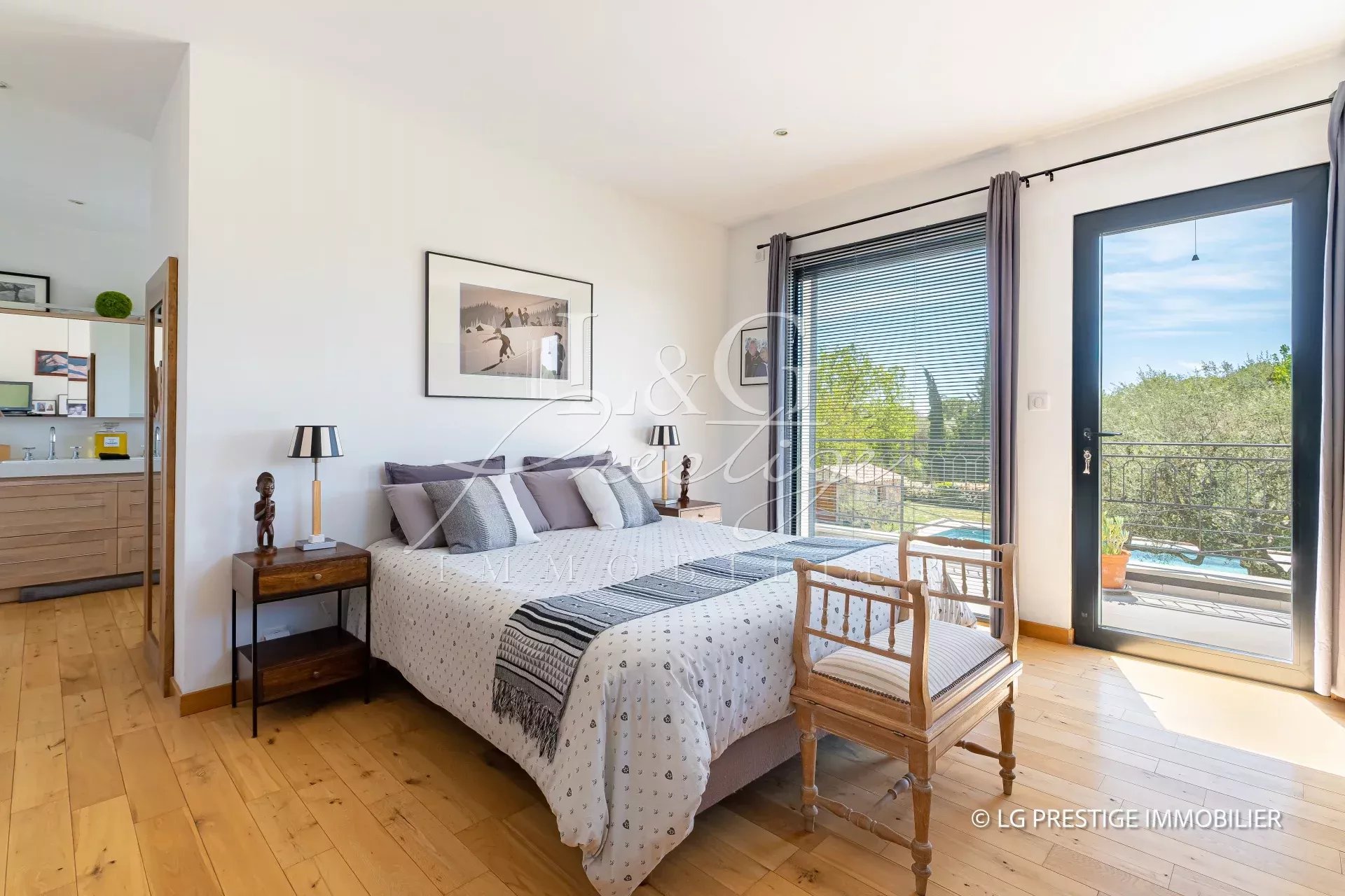 Découvrez votre agence LG Prestige Immobilier de Montauroux, cette villa d'exception, rare sur le marché, située dans un quartier calme et prisé. Offrant une superficie de 230 m², cette propriété se déploie sur un terrain plat de 3 000 m², magnifiquement agrémenté d'oliviers centenaires. Édifiée en 2012, cette villa de standing se compose au rez-de-chaussée d’un vaste séjour lumineux de 50 m², d’une cuisine ouverte moderne, d'une buanderie et d’un WC invité. À l’étage, vous profiterez de trois spacieuses chambres, deux salles de bains avec WC, ainsi qu’un dressing. Les terrasses offrent une vue dégagée, idéale pour savourer des moments de détente. En extérieur, une superbe piscine en mosaïque avec pool-house en pierre, construits en 2021, invitent à la relaxation. Un garage ouvert de 40 m² permet d'accueillir deux véhicules. Reliée au tout-à-l’égout et bénéficiant d’un classement énergétique en « A », cette villa allie confort, modernité et performance énergétique.