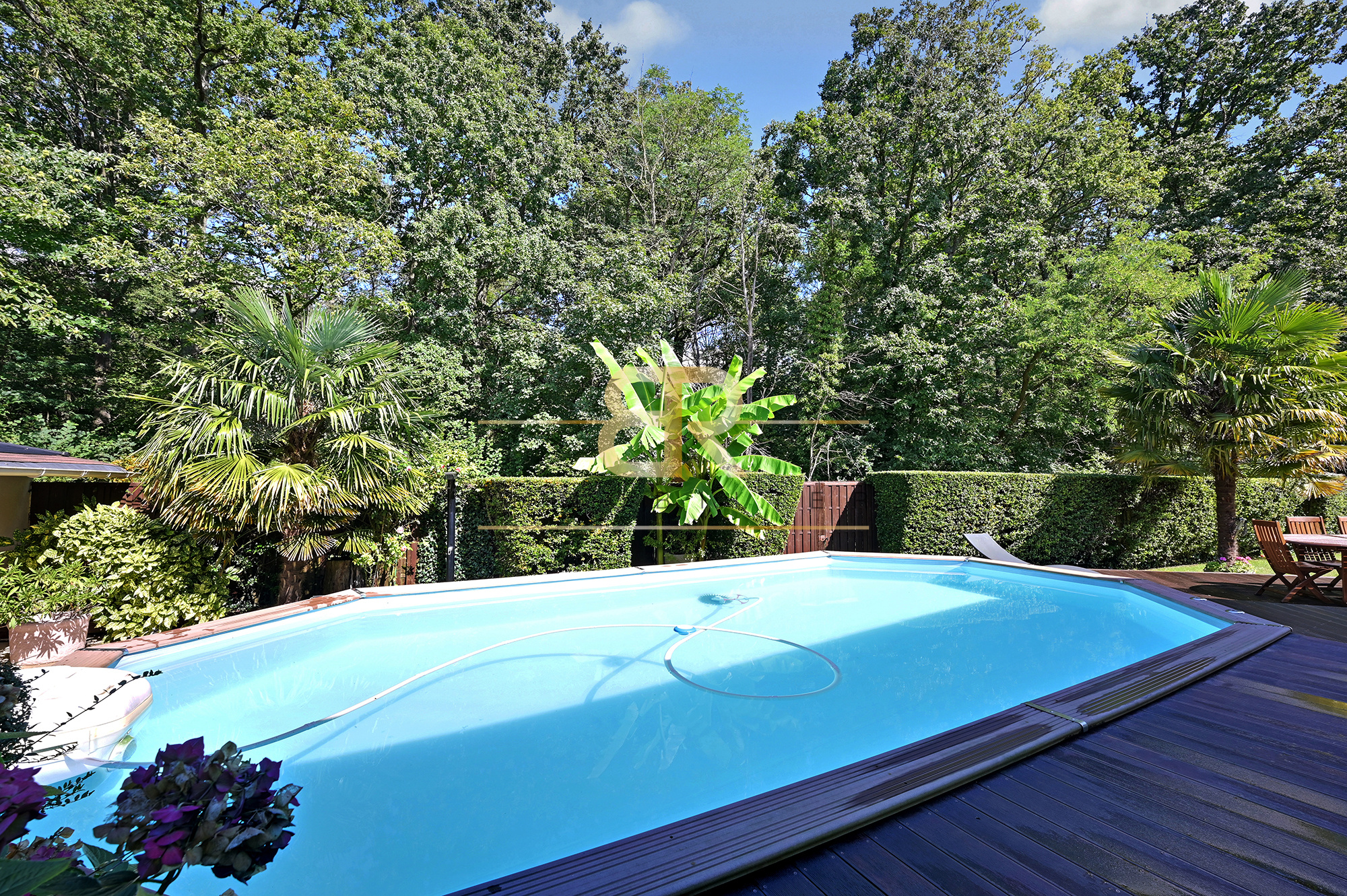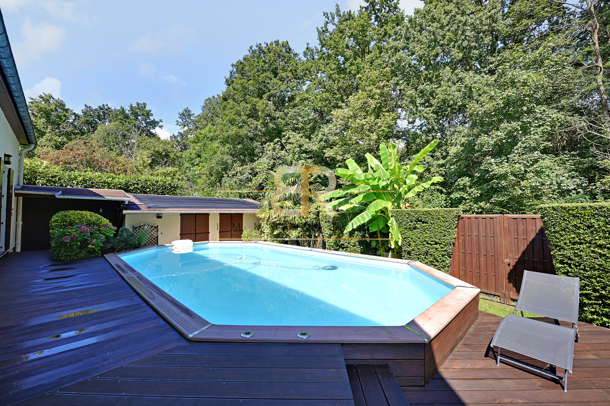 Derrière la maison, se trouve la PISCINE avec une douche extérieure et une TERRASSE sur laquelle vous pourrez déjeuner/diner au sein d'un CADRE VERDOYANT puisque vous aurez vue sur le Bois.