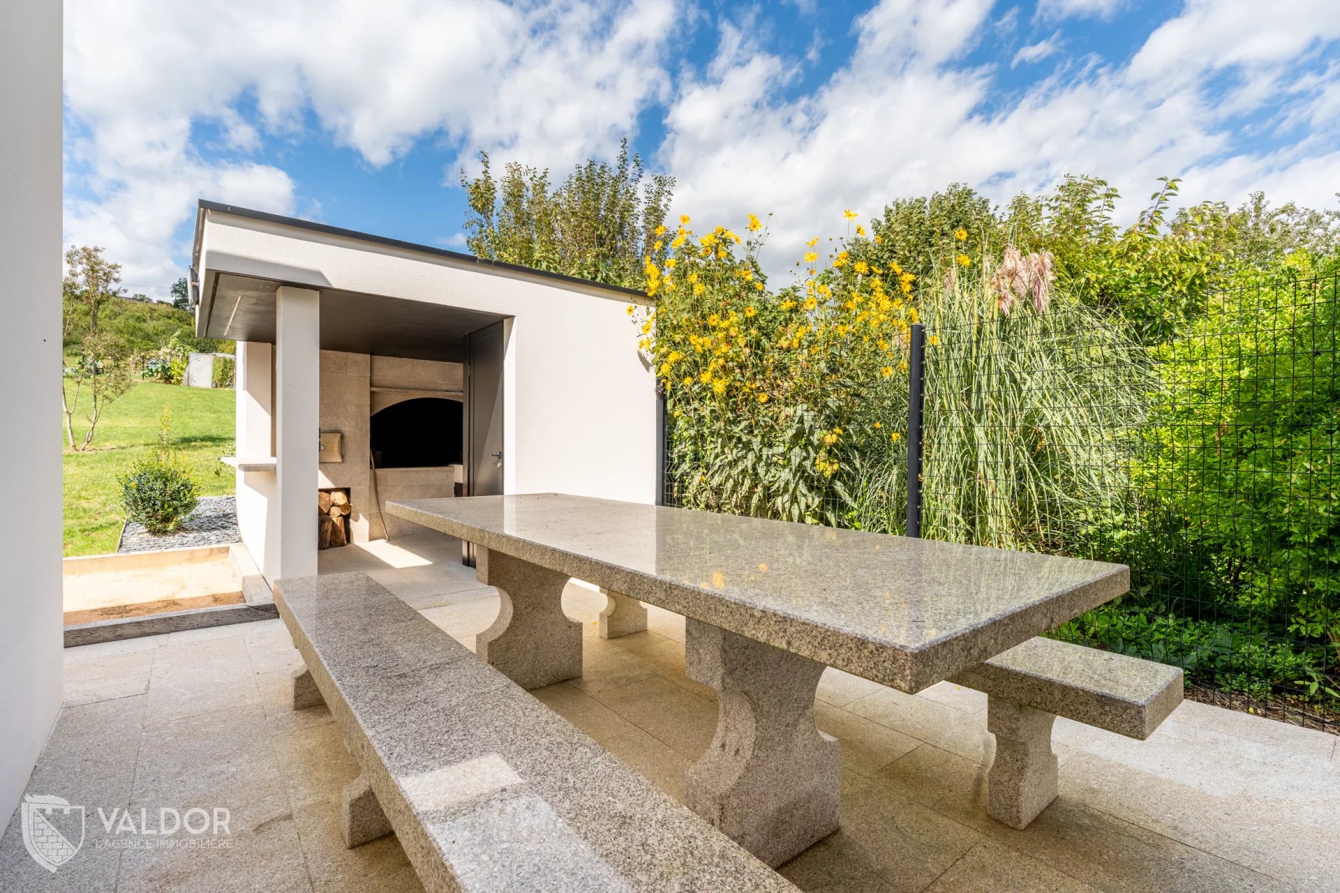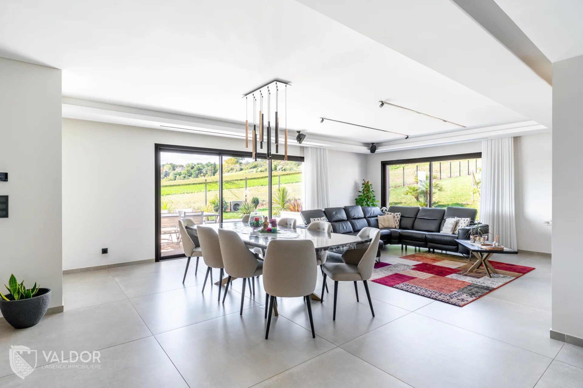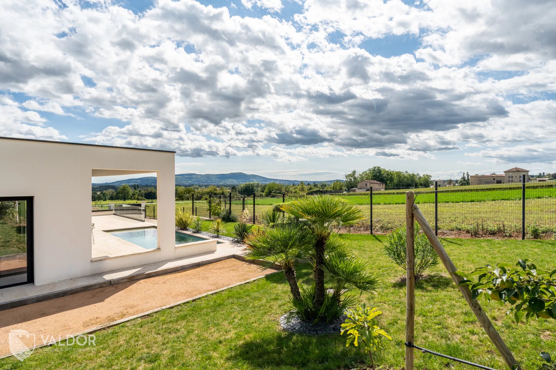 Vue dégagée sur les Monts d'Or pour la terrasse Sud abritée d'une pergola orientable et prolongée d'une piscine 8x3 au sel équipée d'une PAC. Une seconde terrasse au nord agrémentée d'une table familiale en granit, a été aménagée en prévision des épisodes caniculaires, avec un four à pizza, barbecue et plancha face au terrain de pétanque à l'ouest et au jardin paysager...