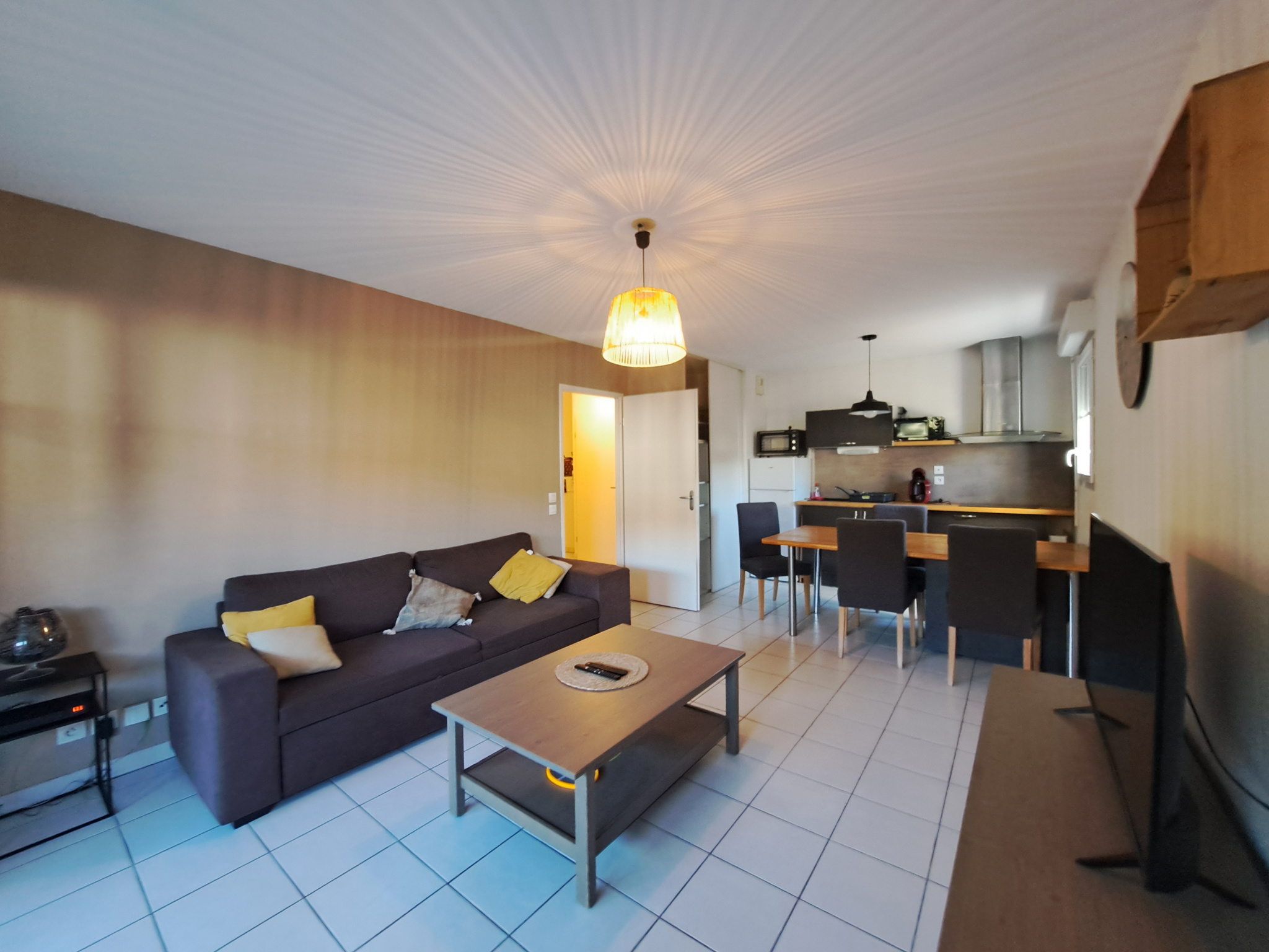 A LOUER T2 meublée. Composée d'une grande entrée,une pièce de vie avec cuisine aménagée et équipée, une chambre, une salle de bain, un WC et une terrasse de 21,41 M2.Siué dans un endroit calme et dans une résidence sécurisée avec une place de parking.