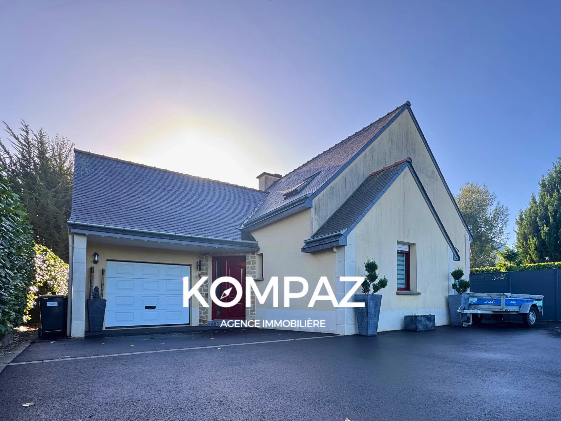 BRETAGNE - CÔTES-D'ARMOR - JUGON LES LACS. Votre agence immobilière Kompaz vous propose à la vente cette jolie maison contemporaine de 5 pièces; Elle se compose, au rez-de-chaussée, d’une entrée, d’un grand séjour lumineux, d’une cuisine aménagée et entièrement équipée, de deux chambres, d’une salle d’eau ainsi que d’un garage attenant. À l’étage, un espace bureau ouvert dessert deux chambres supplémentaires, une salle de bains et un grenier aménageable, offrant un beau potentiel d’agrandissement. L’ensemble est édifié sur un terrain entièrement clos de 1000 m², agrémenté d’une jolie terrasse, d’une cuisine d’été, et d’un portail électrique assurant confort et sécurité.