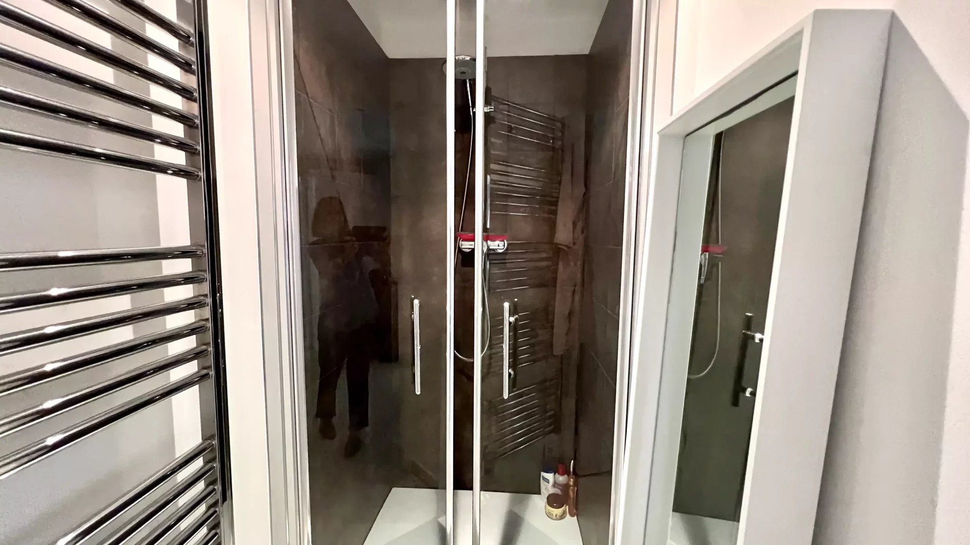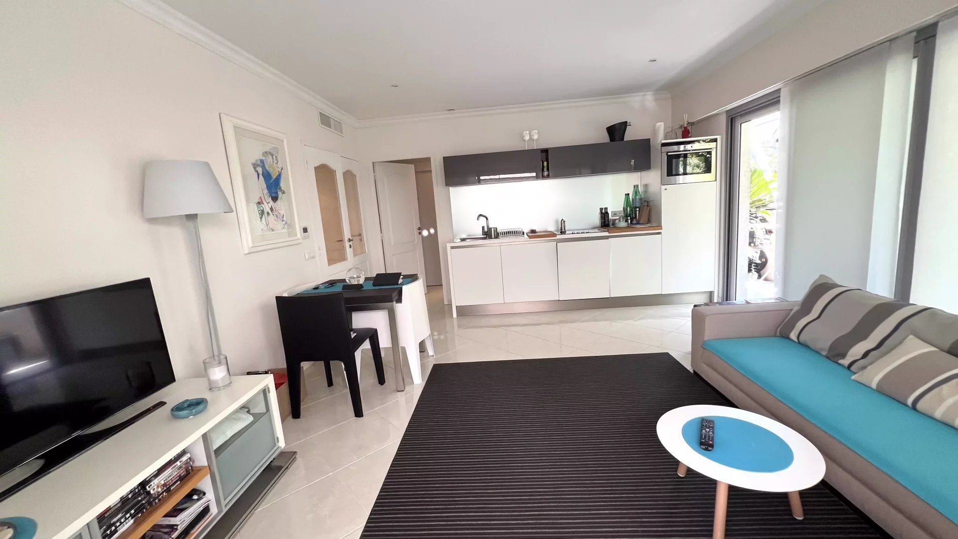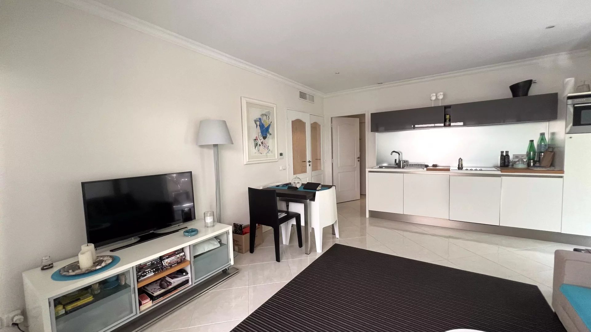 Ampie finestre e un soggiorno luminoso offrono uno spazio accogliente per rilassarsi e godersi la televisione dopo una giornata trascorsa esplorando Cannes. La vicinanza a negozi, ristoranti e le famose spiagge rende questa proprietà una scelta perfetta per chi cerca comodità e stile.