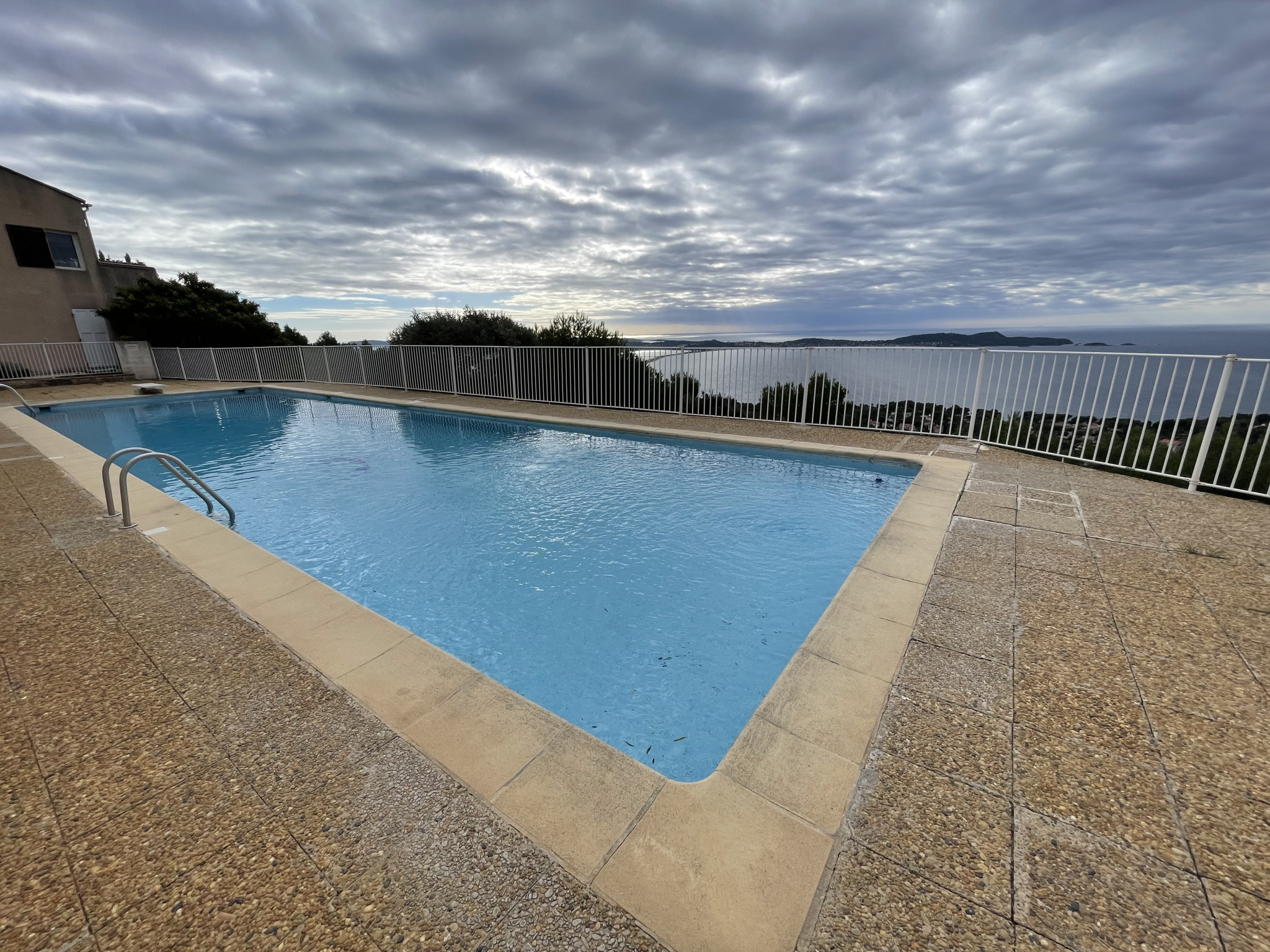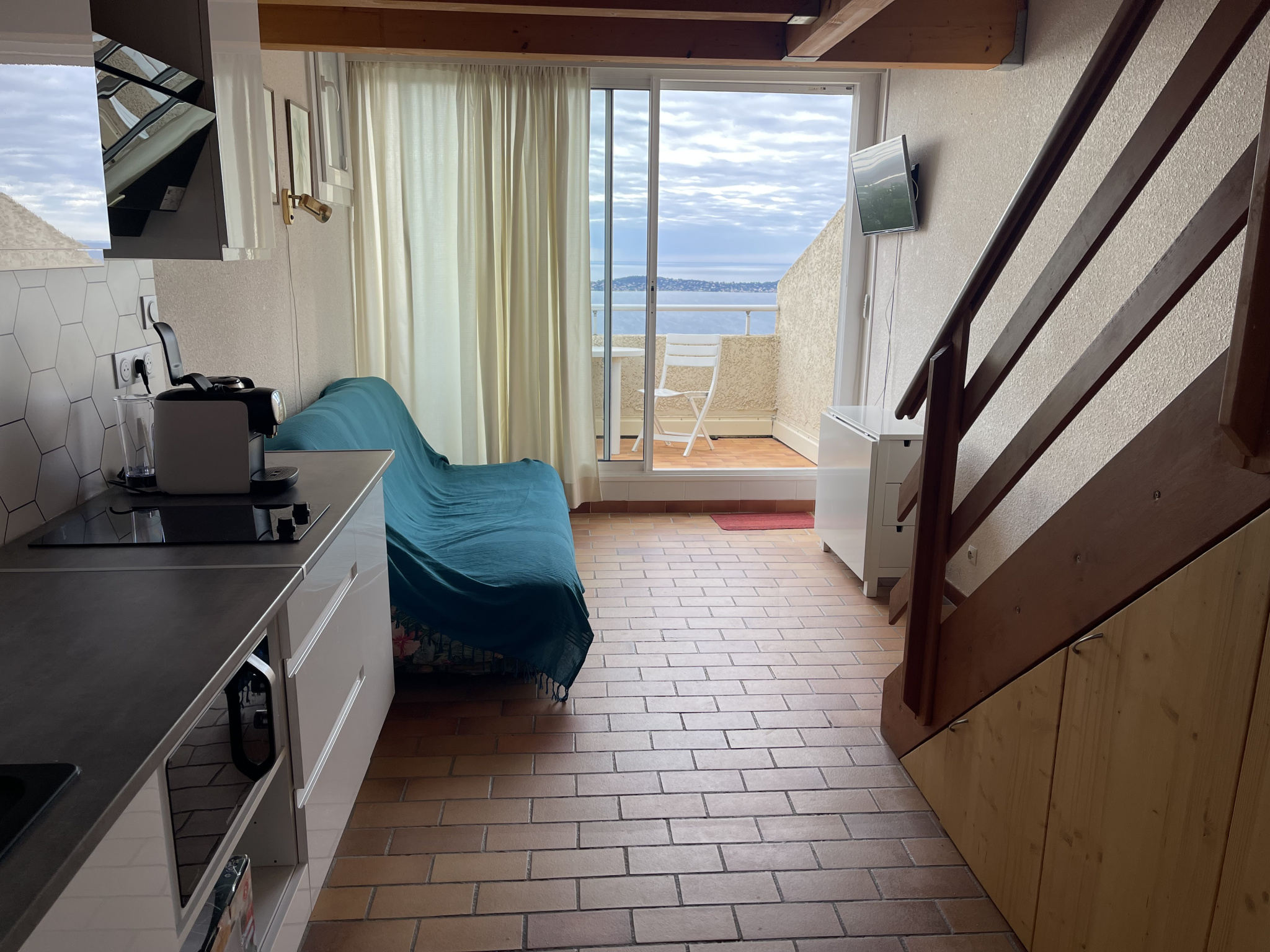 HYERES - SECTEUR MONT DES OISEAUX - DANS RESIDENCE SECURISEE AVEC PISCINE- AU CALME- APPARTEMENT MEUBLE EN SOUPLEX COMPOSEE: Une entrée avec mezzanine servant de chambre, à l'étage inférieur, une pièce de vie avec son espace cuisine équipée et aménagée donnant sur la terrasse. une salle de bain avec placard et WC. Petite terrasse avec une superbe vue mer. Place de parking privative. Nombreux rangements au niveau de l'escalier.