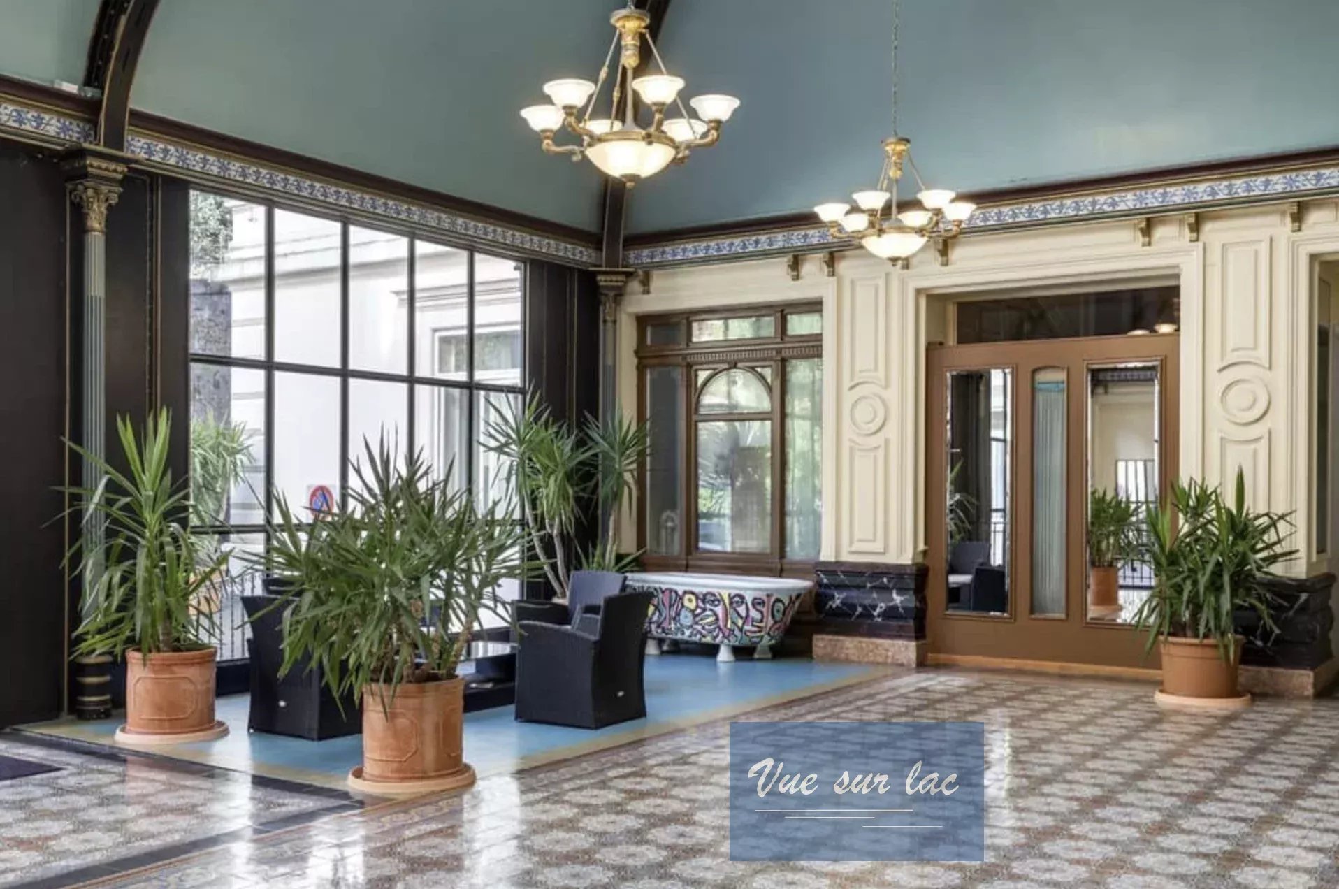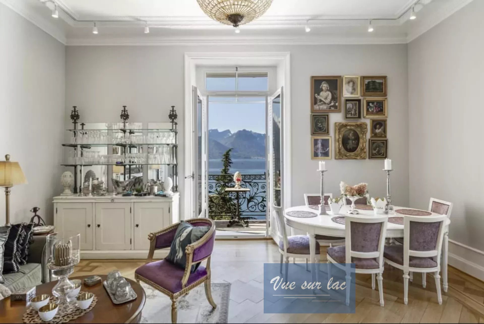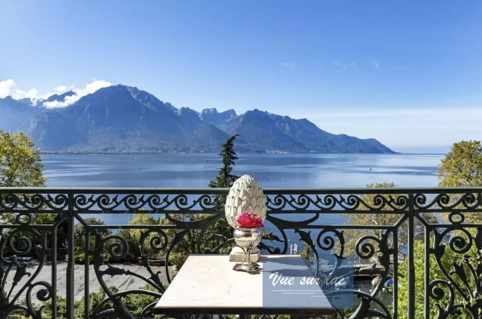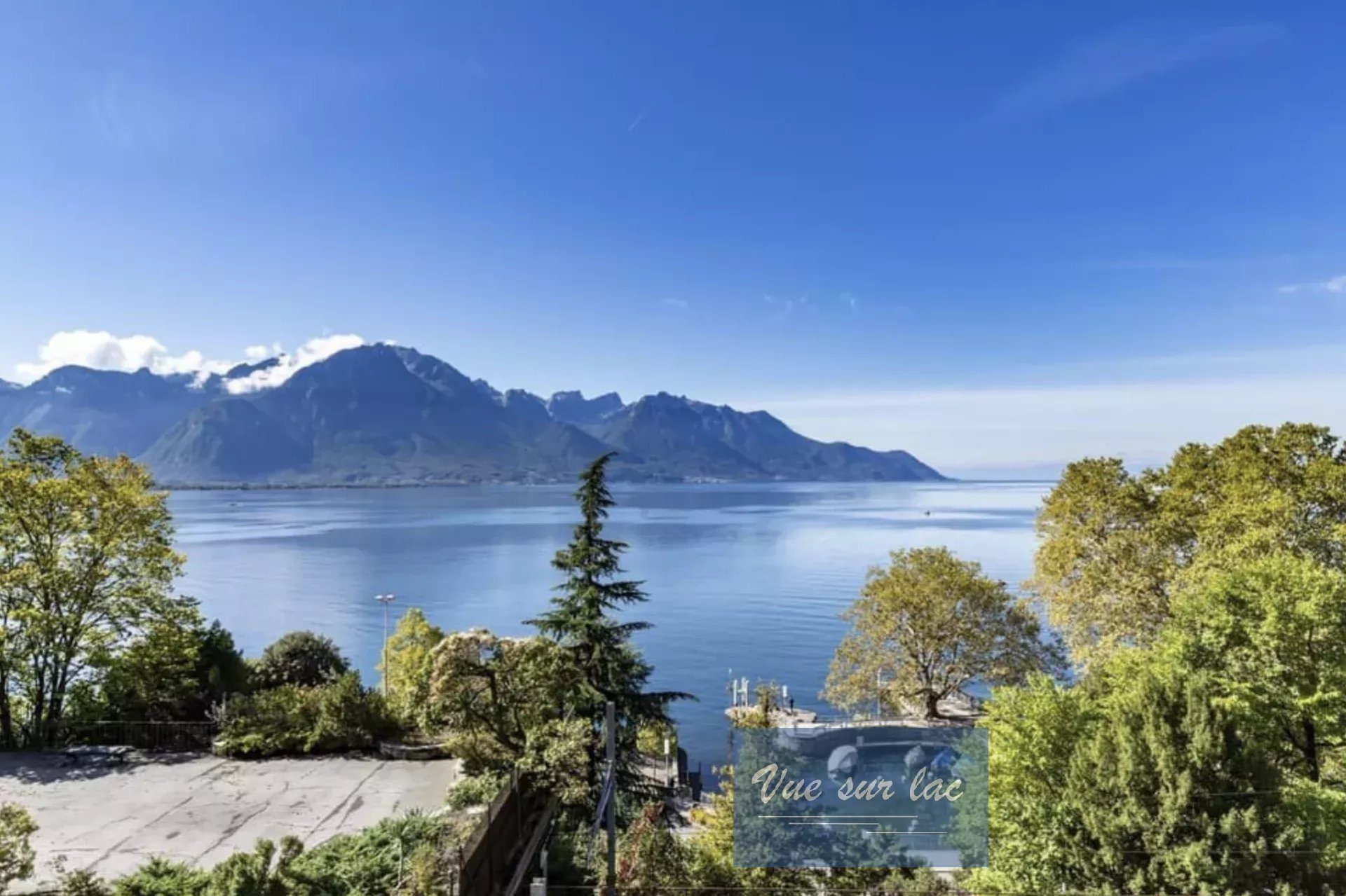 L'appartement est situé dans un immeuble Belle-Epoque de prestige à Montreux, offrant une vue exceptionnelle sur le lac et les montagnes environnantes.
