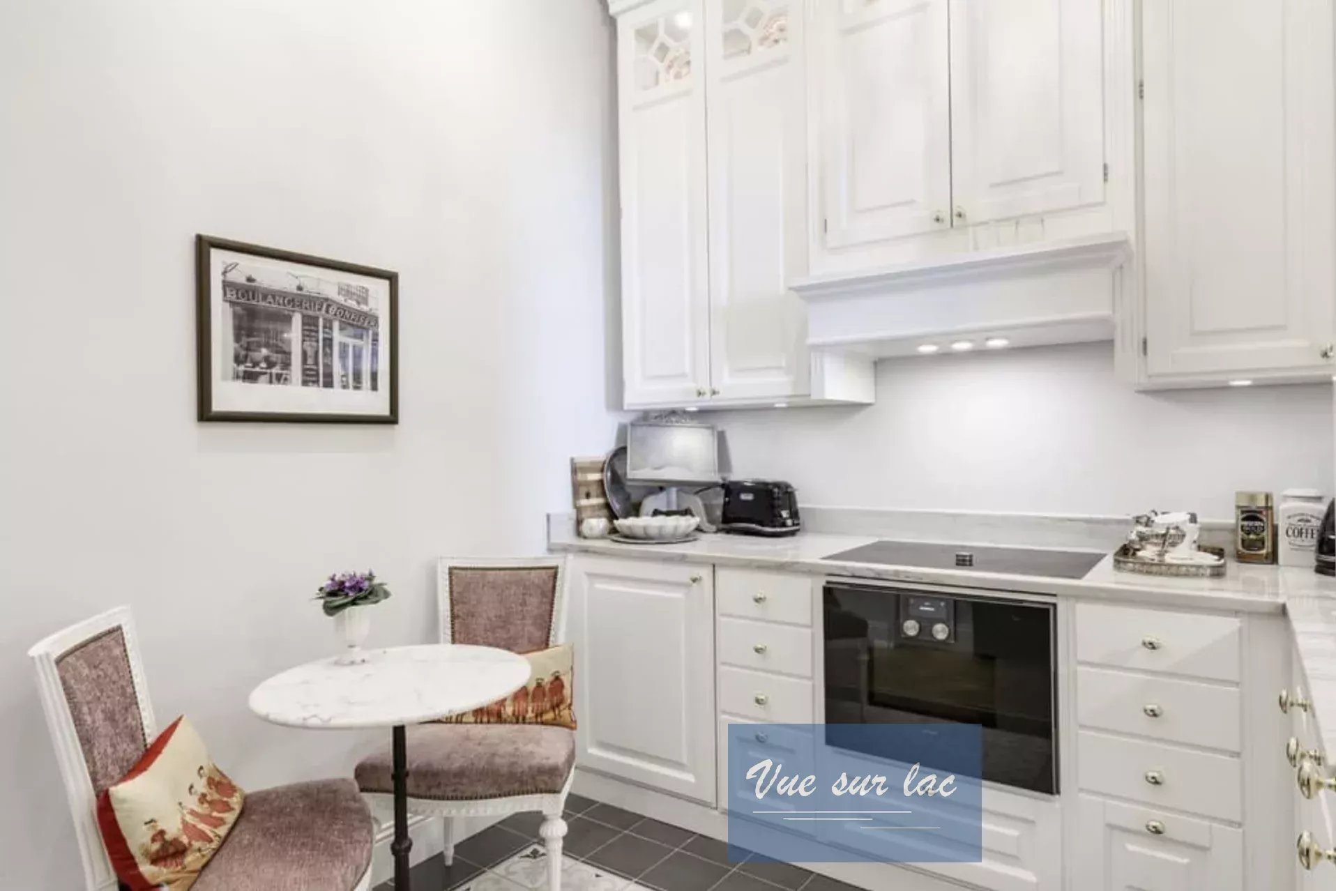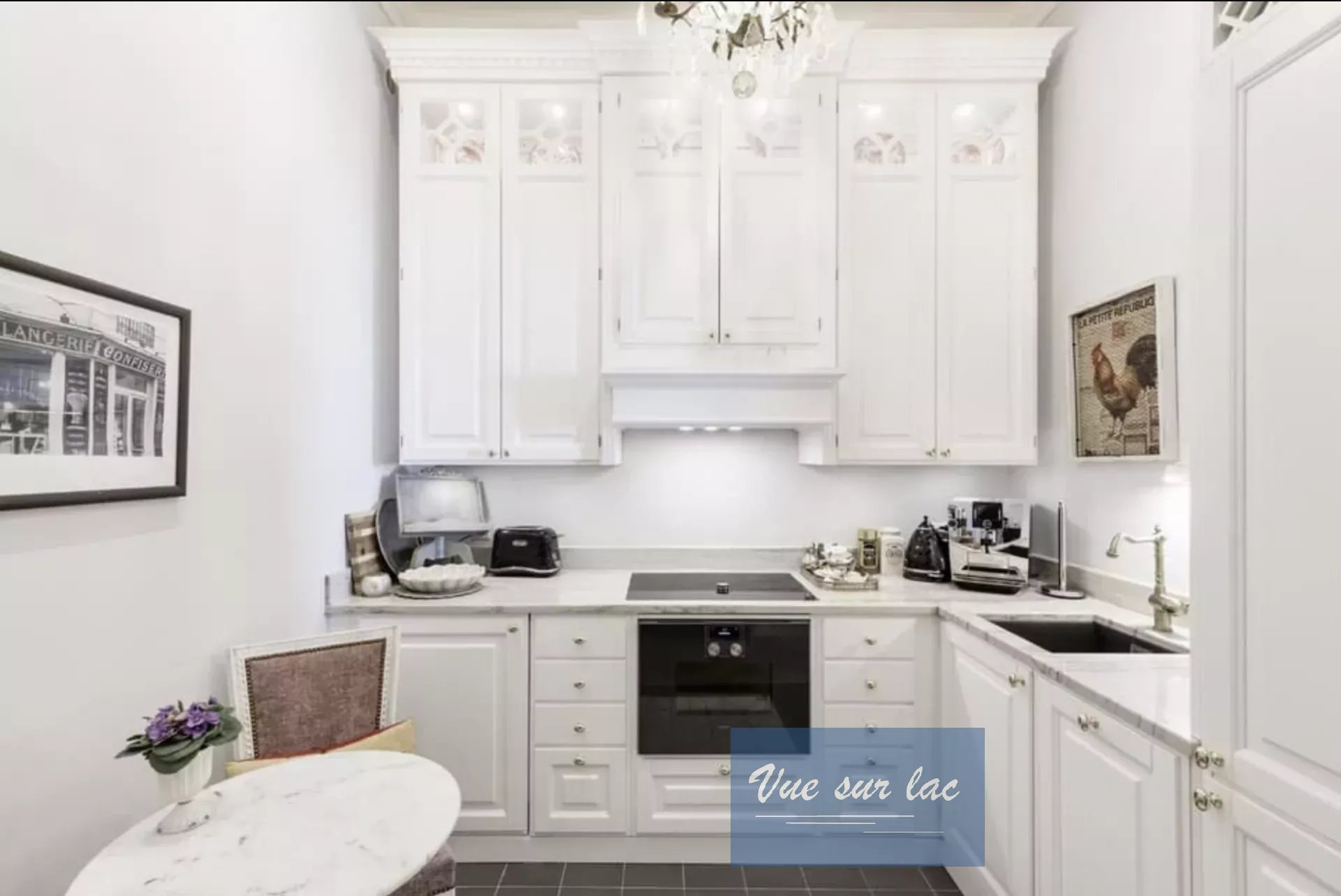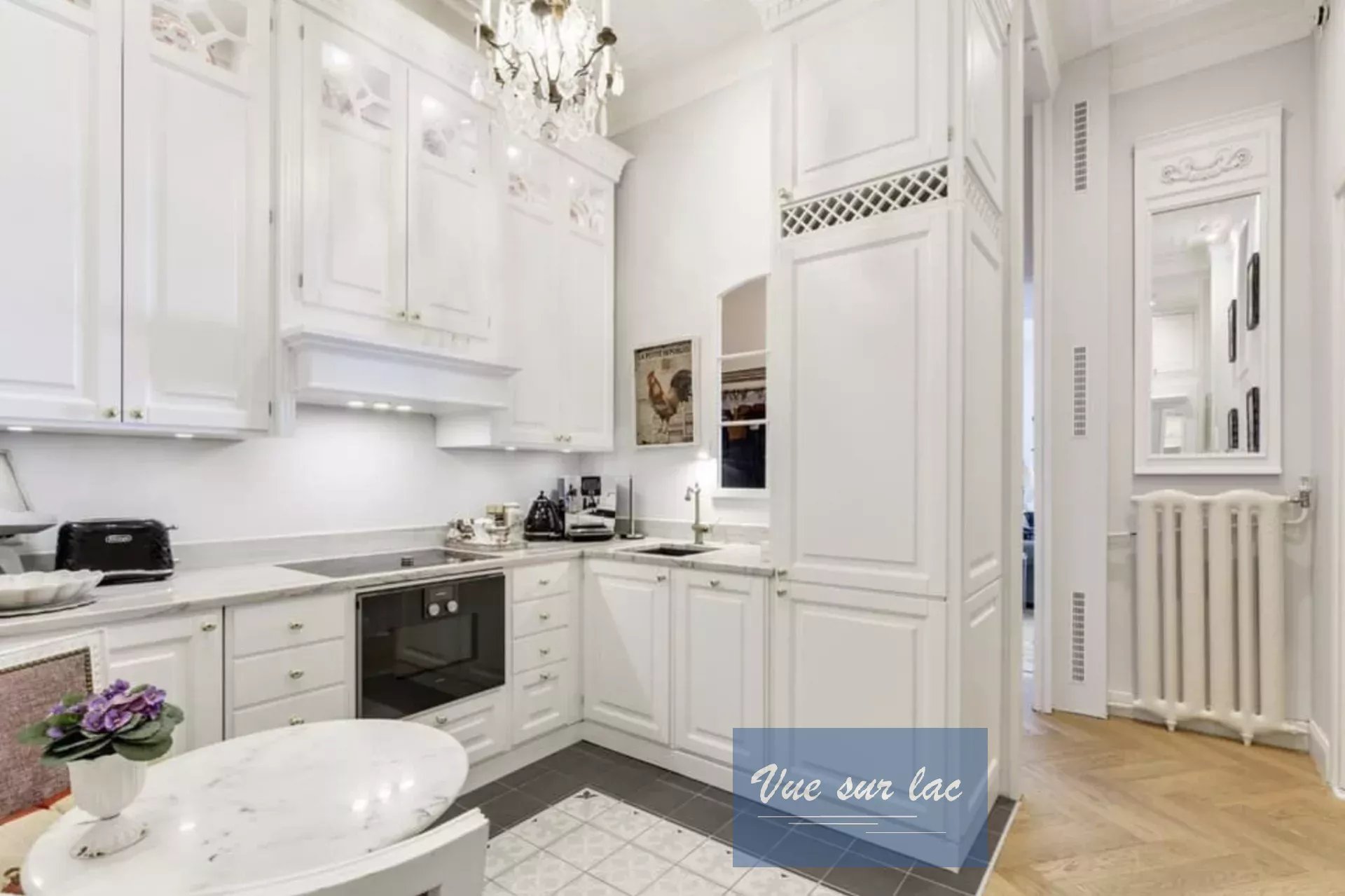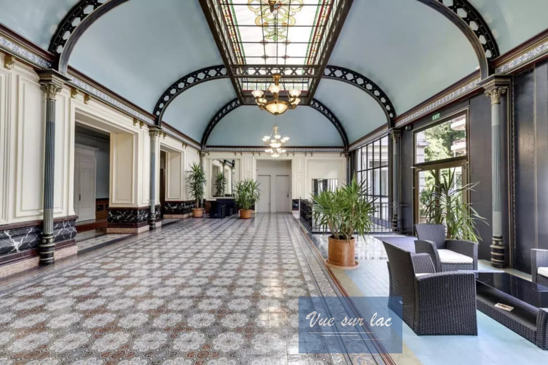 L'appartement est situé dans un immeuble Belle-Epoque de prestige à Montreux, offrant une vue exceptionnelle sur le lac et les montagnes environnantes.