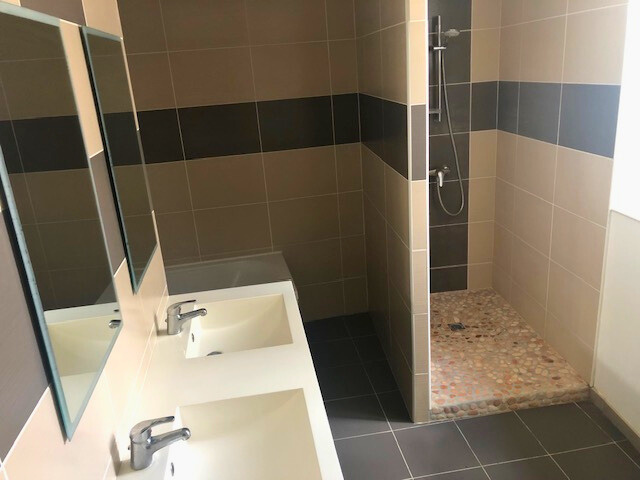L'étage accueille un appartement spacieux à usage d'habitation composé d'un salon de 23,62 m2 (sol en plancher) agrémenté d'une cheminée d'époque. La salle de bains de 8,01 m2 (sol en carrelage) équipée d'un meuble double vasque, d'une douche à l'italienne moderne et d'une baignoire.
