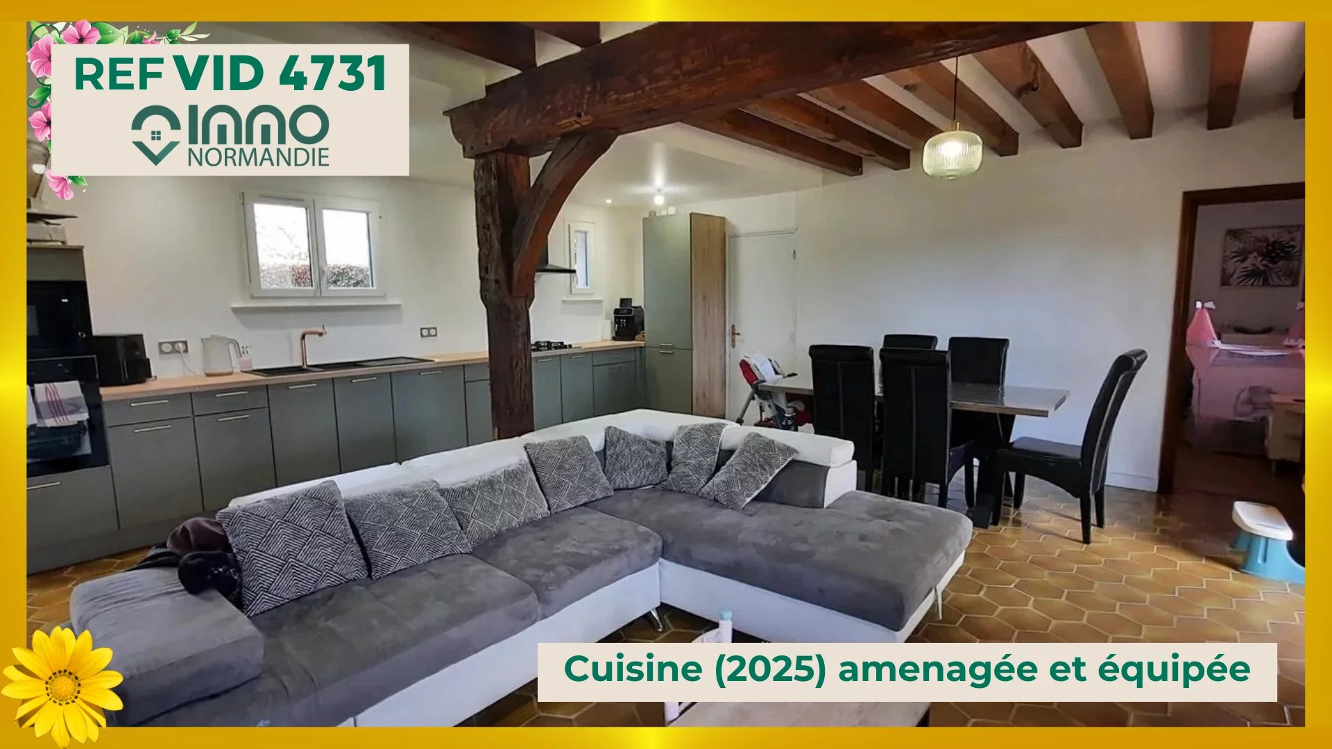 - A 7 minutes des commerces et services ; - 15 minutes de la gare ; Cette maison rénovée vous propose 80 m² de vie de plain-pied + une pièce de 12 m² aménagée à l'étage + grenier de 50 m² environ AU REZ DE CHAUSSÉE : - Séjour 40m², belle cheminée avec poèle à bois ouvrant sur terrasse offrant une belle vue panoramique sur la campagne Normande ; - Cuisine équipée et aménagée (2025) ; - Chambre parentale (13m²) ; - Salle de douche (2024) ; - Toilettes séparées ; - Deuxième chambre (11 m²) ; - Une pièce avec trémie menant à l'étage en attente de la pose d'un escalier ; A L'ÉTAGE : - Une pièce aménagée (17m²), accès par escalier extérieur ; - Un grenier d'environ 50 m² à aménager avec velux, eau et électricité ; EXTÉRIEURS : - Beau terrain clos et arboré de 2000 m² ; - Double garage de 38m² environ ; - Hangar de 250 m² environ ; UNE VIE TRANQUILLE PROCHE DES COMMODITÉS. Agence IMMO-NORMANDIE 4 agences Pour vous accompagner dans votre Projet immobilier -- LA BARRE EN OUCHE -- BEAUMONT LE ROGER -- -- BRIONNE -- THIBERVILLE -- Retrouvez toutes nos annonces et vidéos sur notre site www.immonormandie.fr Contact : Benjamin ROMUALD -06.33.72.85.24- entrepreneur individuel (E.I.) agissant en sa qualité d'agent commercial, inscrit au Registre Spécial des Agents Commerciaux sous le numéro RSAC 812 264 455 00013