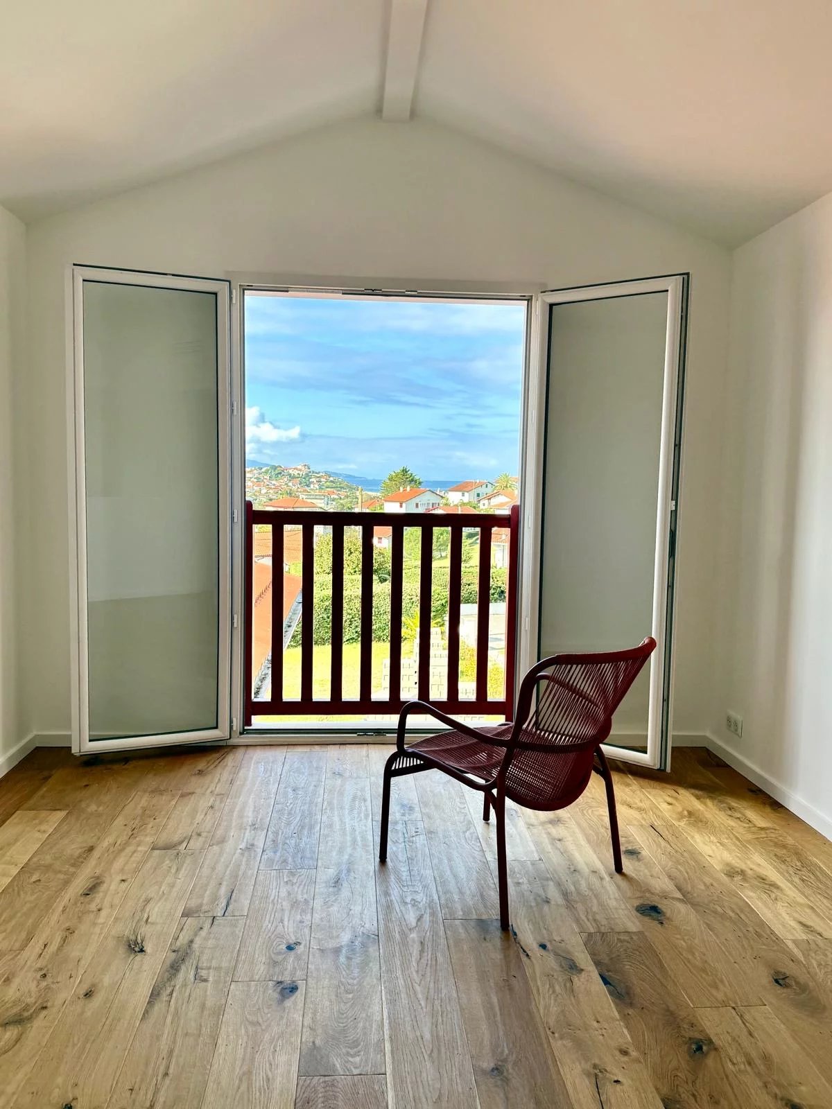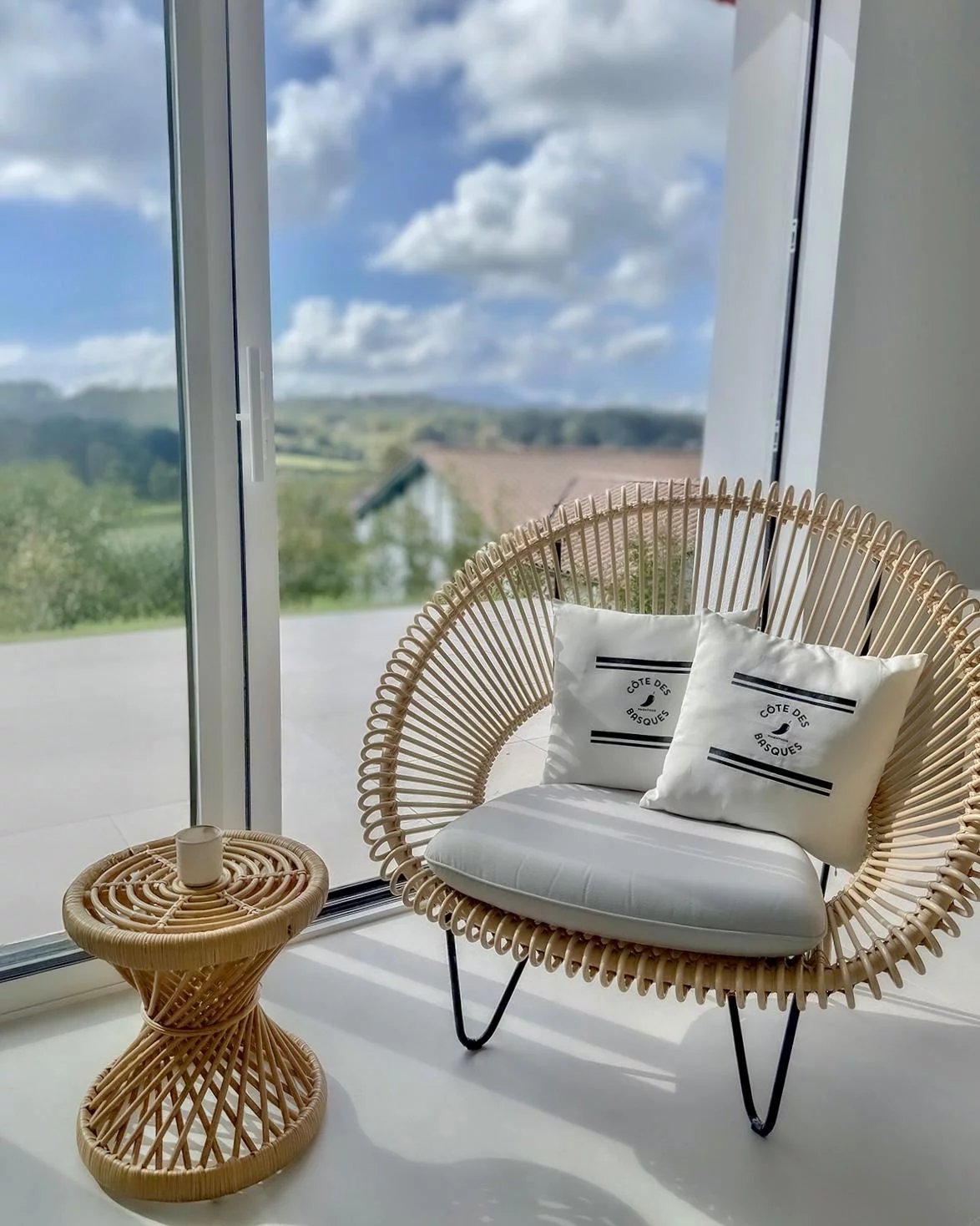 Les larges ouverture sur la terrasse offrent une vue dégagée sur les montagnes et la Rhune. Un panorama d’exception complété par un aperçu mer.
