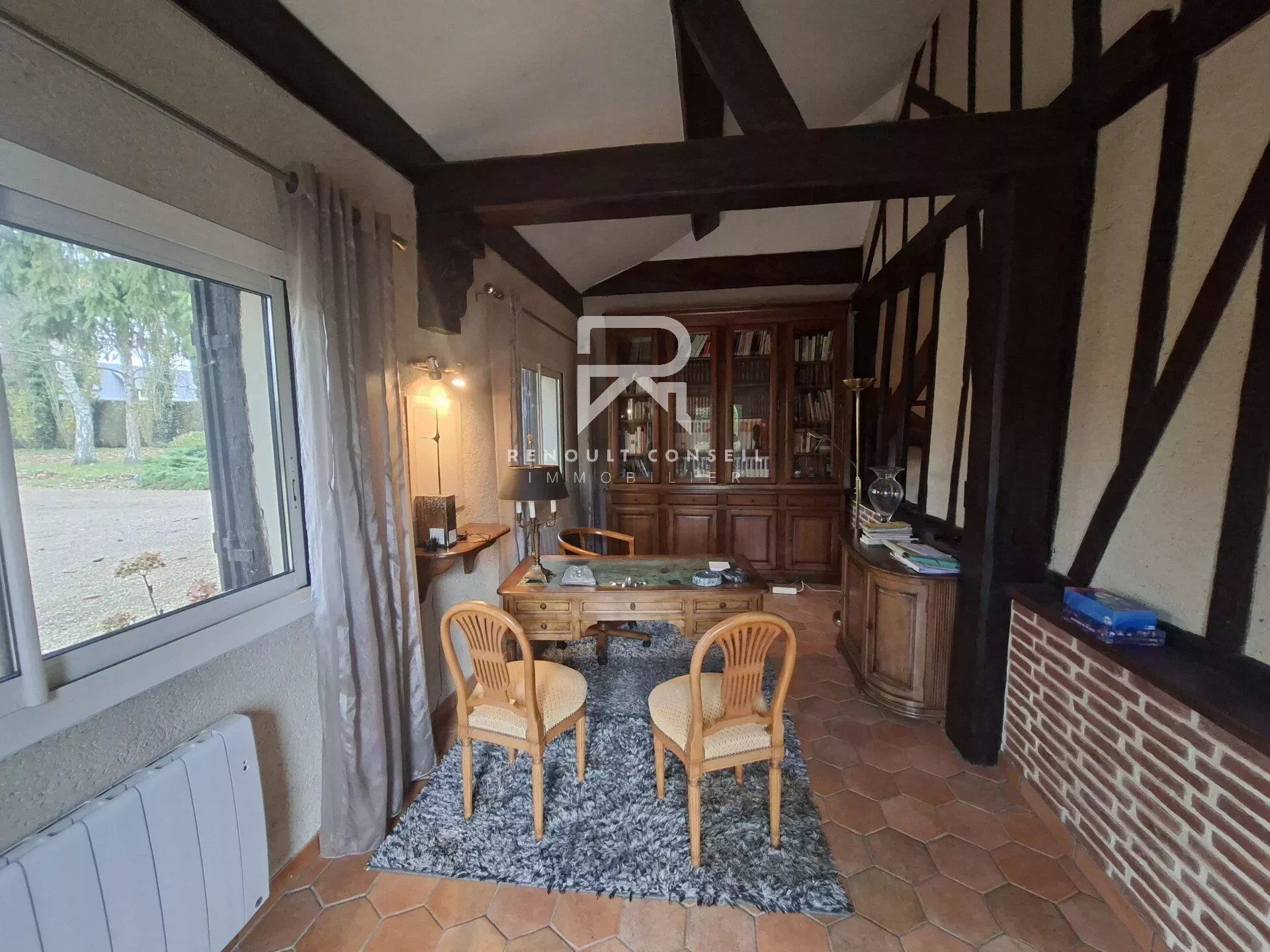Maison Normande Sur les hauteurs de Beaumont le Roger et sa gare SNCF Paris St Lazare, dans un quartier calme, cette jolie maison Normande de 146 m² env implantée sur un superbe terrain clos, boisé et arboré de 2375 m² env. Cette maison comprends au rez de chaussée une cuisine équipée et aménagée, un vaste séjour avec cheminée, un bureau pouvant être transformé en chambre, une chambre avec salle de bain et toilettes, et un autre coin toilette et lavabo. À l'étage une grande mezzanine pouvant accueillir des couchages, une chambre et une salle de douche avec un toilette. le chauffage est électrique. Les menuiseries en aluminium. Une première dépendance de 20 m² env. transformée en studio comprenant une kitchenette, un wc, une chambre mezzanine Une seconde dépendance accueillant un atelier de 22 m² env. ainsi qu'un salon de 30 m² env. Un garage de 35 m² env. avec un abri à bois. Une cave de 35 m² env. Un chalet en bois. Un terrain de pétanque. Portail électrique avec interphone. l'assainissement se fait par fosse septique. Les informations sur les risques auxquels ce bien est exposé sont disponibles sur le site Géorisques : georisques. gouv. fr.Informations LOI ALUR : Honoraires charge vendeur. (gedeon_52410_32271462)