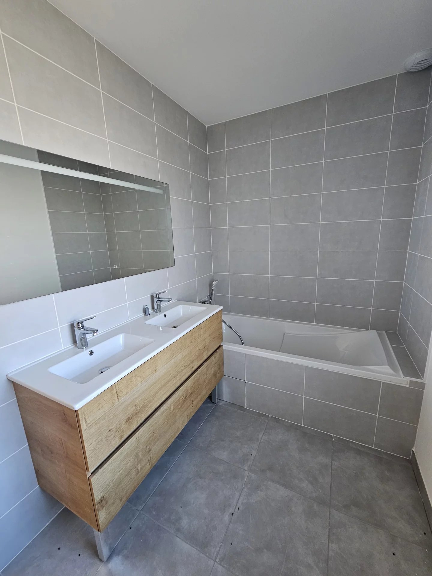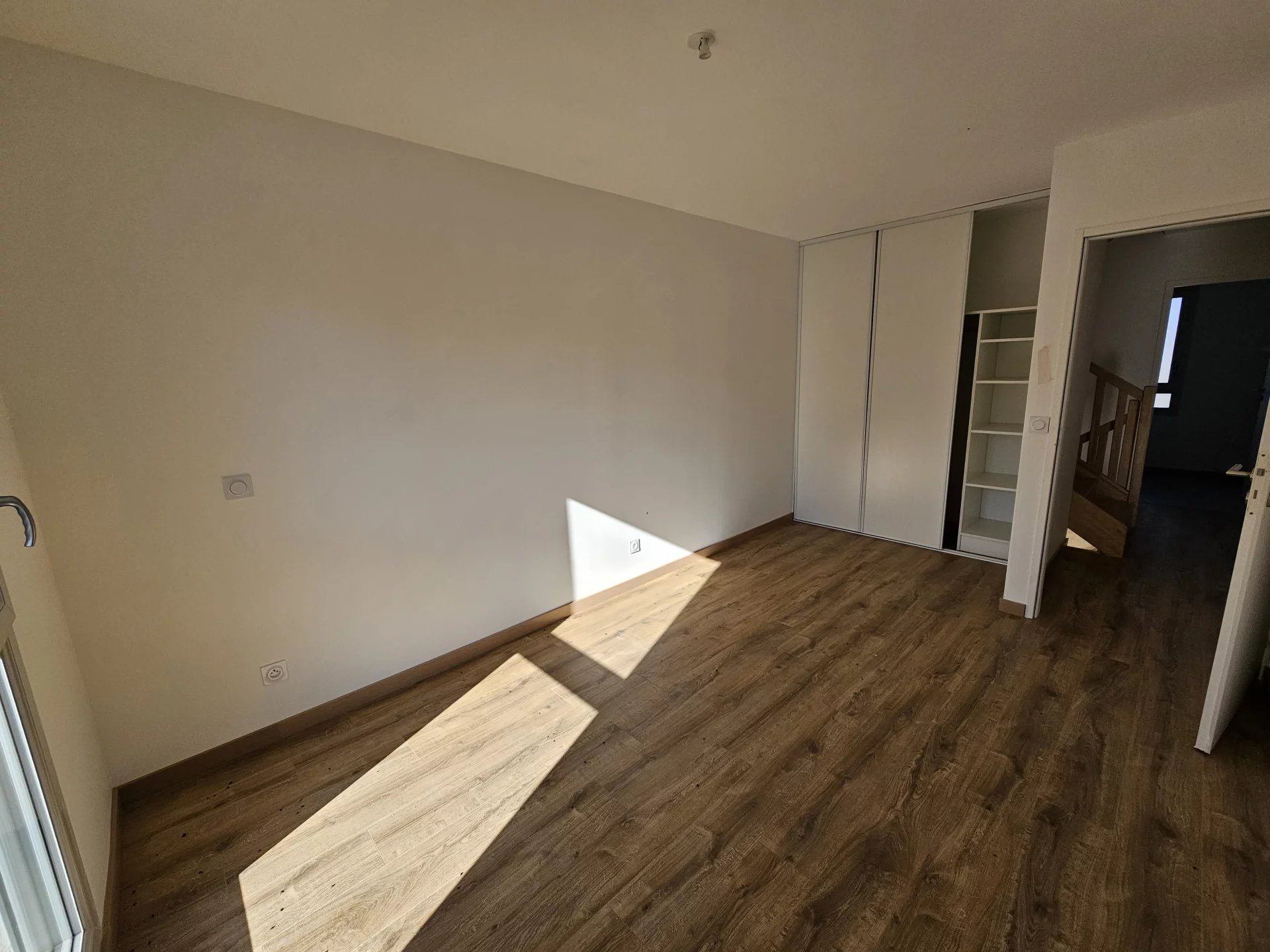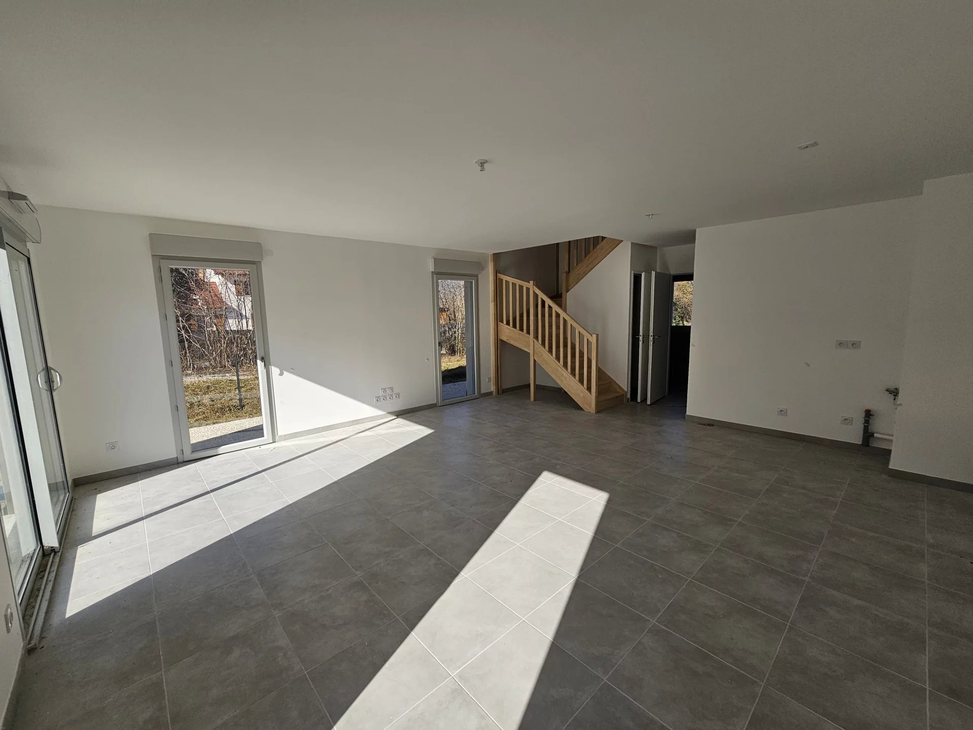 Une villa neuve mitoyenne des deux côtés, construction 2023-2024 (120m² carrez ou 135m² utile) dans un lotissement, avec abri voiture et terrain clôt.