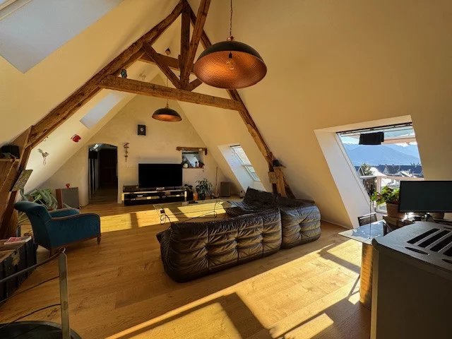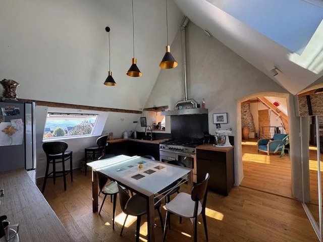 Frederic Hugard vous propose cette appartement atypique en duplex descendant au centre de la Mure. Situé au 3éme étage d'une petite copropriété avec ses espaces verts en commun et d'un stationnement privatif. Idéal pour les amateurs de volumes et d'ambiance loft, venez profiter de sa luminosité et de sa vue imprenable. Il se compose d'une cuisine entièrement équipée dotée de nombreux rangements, donnant sur une vaste pièce de vie de 60 m².Au niveau inférieur, vous trouverez trois belles chambres, un bureau, une salle d'eau et des toilettes. Rénovation récente avec de beaux matériaux (parquets, poêle à granulés, cheminée, velux balcon).Idéal pour une famille car proche de toutes les commodités et des écoles.