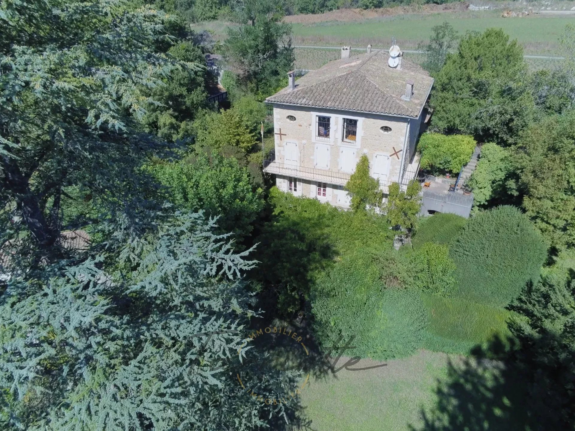 À quelques minutes du centre de Dieulefit, au cœur d’un magnifique parc arboré de 5 000 m² constructible, venez découvrir cette authentique magnanerie de 364 m² habitables accompagnée de 140 m² de dépendances, offrant un cadre de vie rare et paisible, avec une vue très agréable sur la campagne environnante.