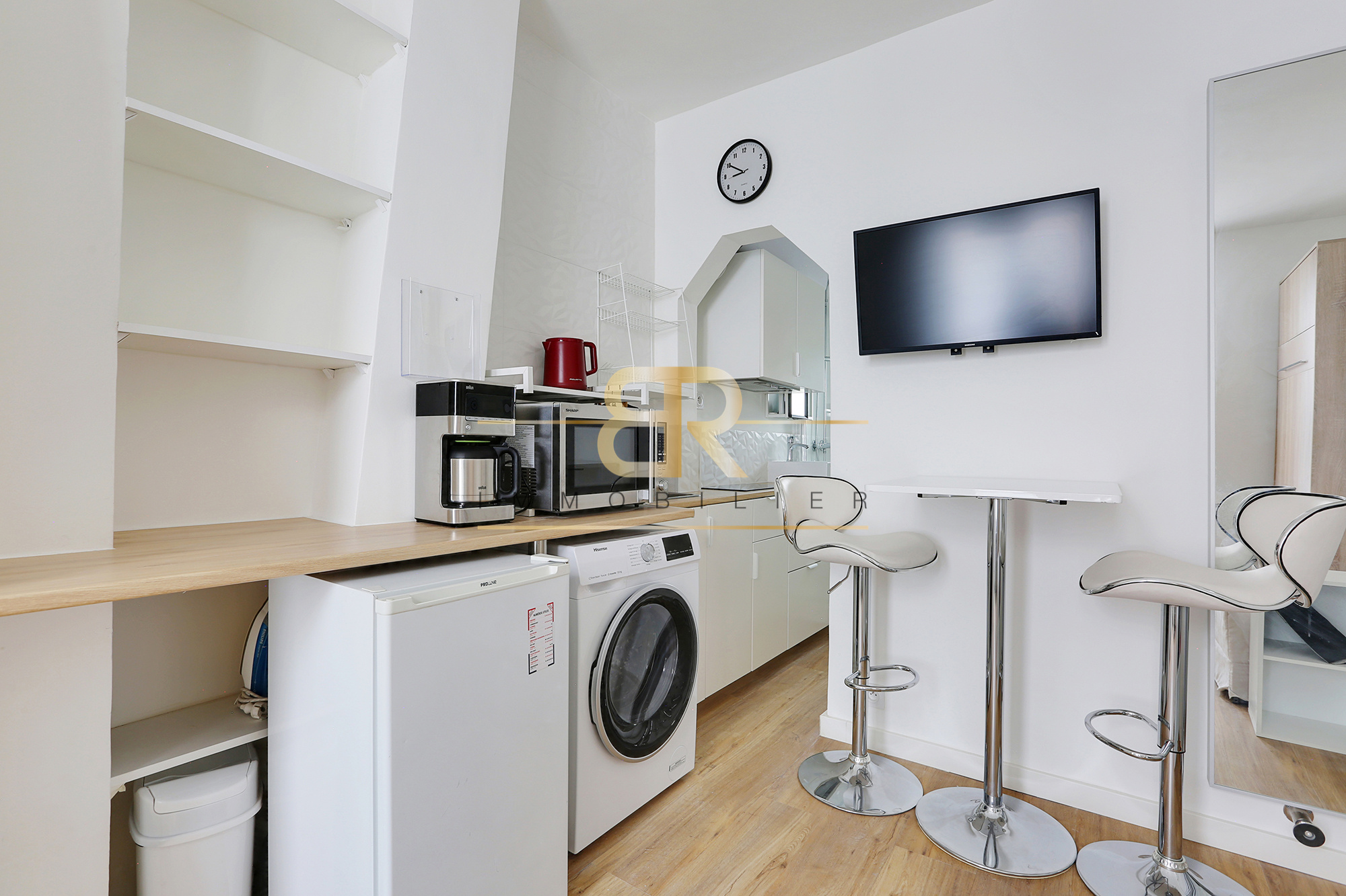 Entièrement REFAIT À NEUF, ce bien parfaitement OPTIMISÉ se compose d'une pièce de vie au CALME sur cour, d'un espace cuisine fonctionnel, d'un coin douche et de WC séparés.