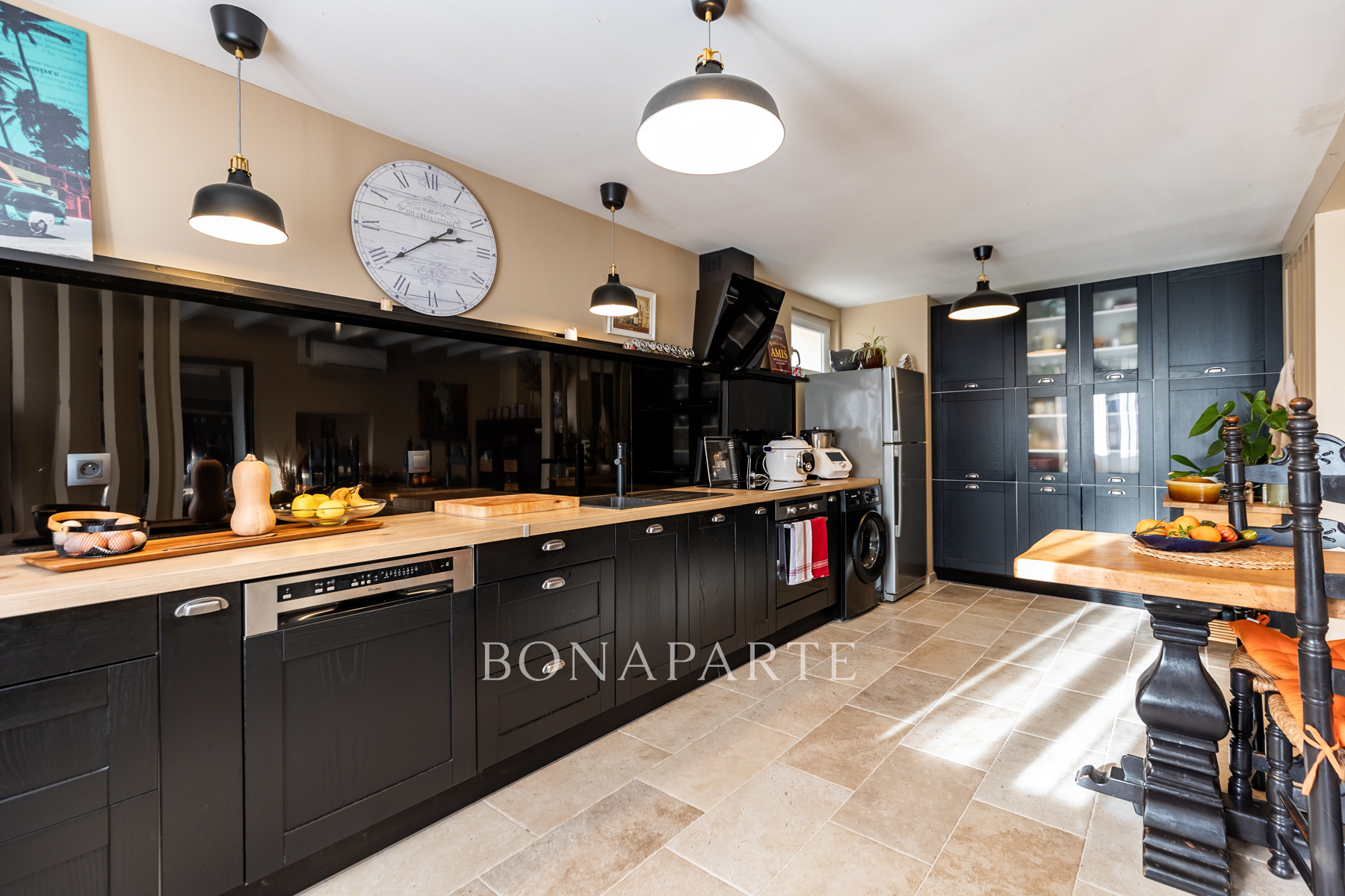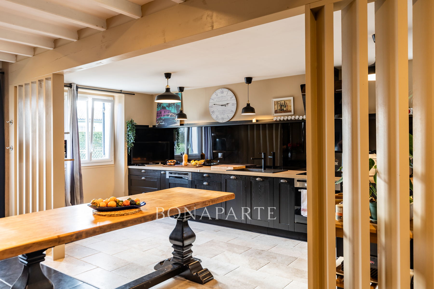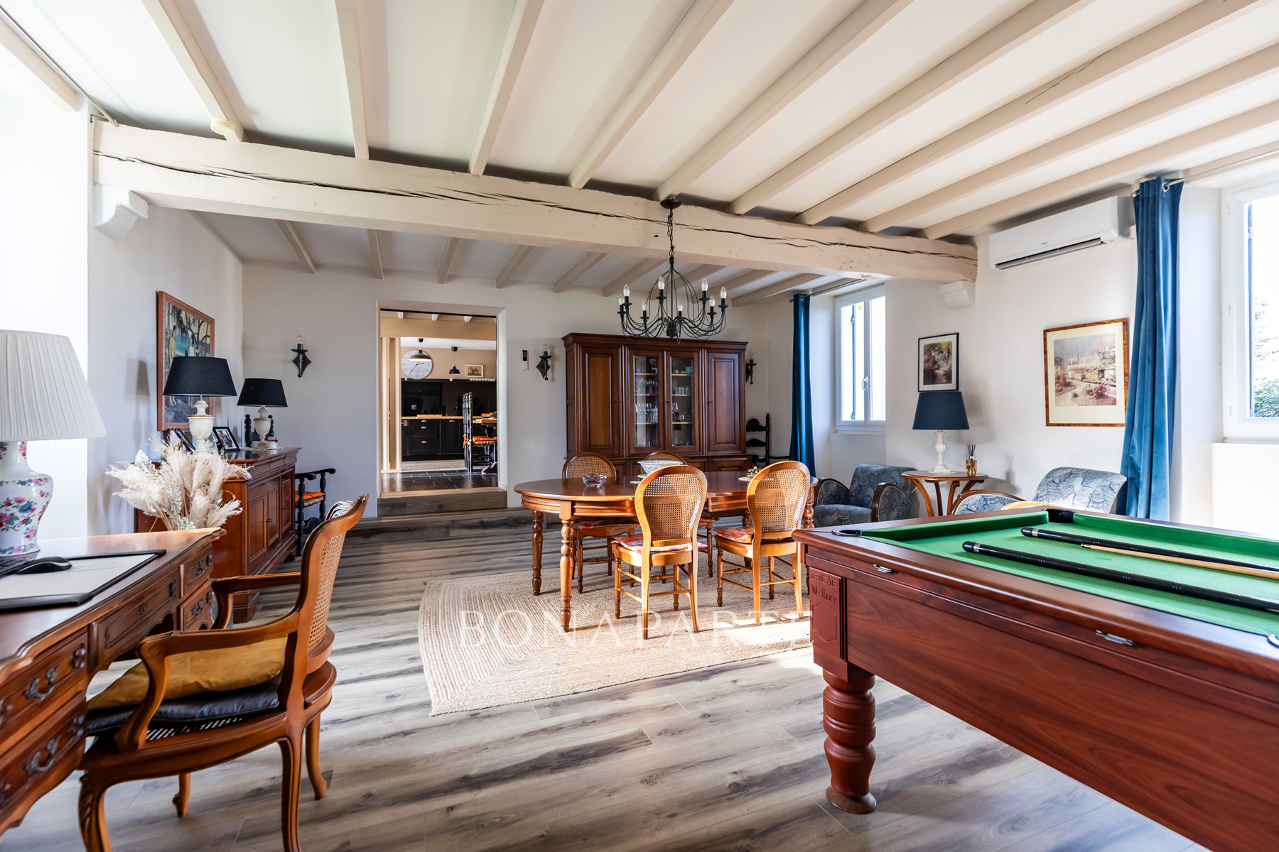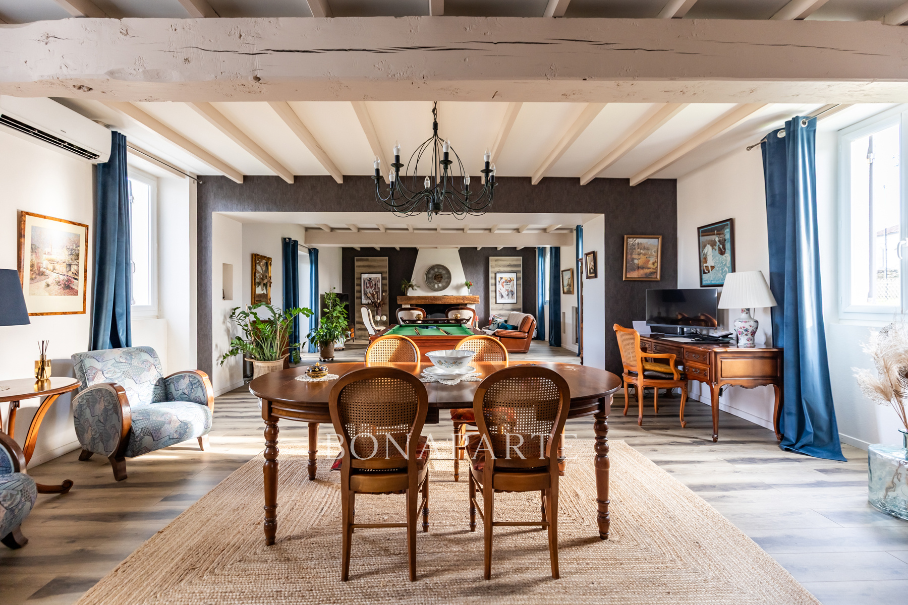 Dès l'entrée, vous serez conquis par la pièce de vie de 77 m2, baignée de lumière, où se mêlent harmonieusement poutres et pierres apparentes, une imposante cheminée, un salon cosy, un espace billard, un bureau et une salle à manger idéale pour recevoir. La cuisine de 17 m2, moderne et fonctionnelle, s'ouvre sur un second espace repas convivial de 18 m2, idéal pour les dîners en famille ou entre amis.