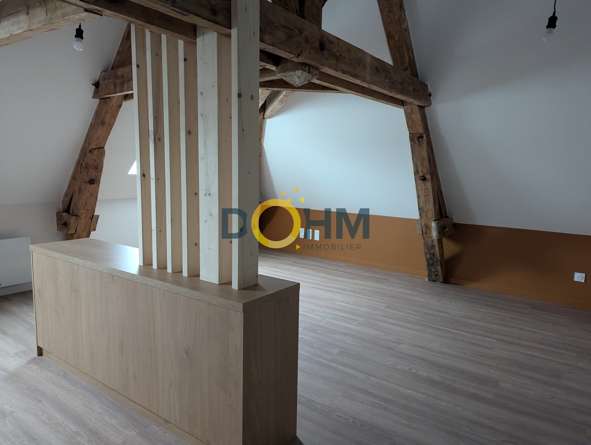 L'appartement se compose d'une grande pièce de vie avec cuisine ouverte, quelques placards, une salle d'eau avec douche, WC, lavabo avec meuble sous vasque. La cuisine est équipée d'une plaque à induction, d'un four et d'une hotte ainsi que des meubles de rangement. L'appartement est tout juste rénové. Situé sous les toits, vous trouverez le charme de l'ancien avec les poutres apparentes. Les fenêtres sont en double vitrage et le chauffage électrique avec des radiateurs récents.