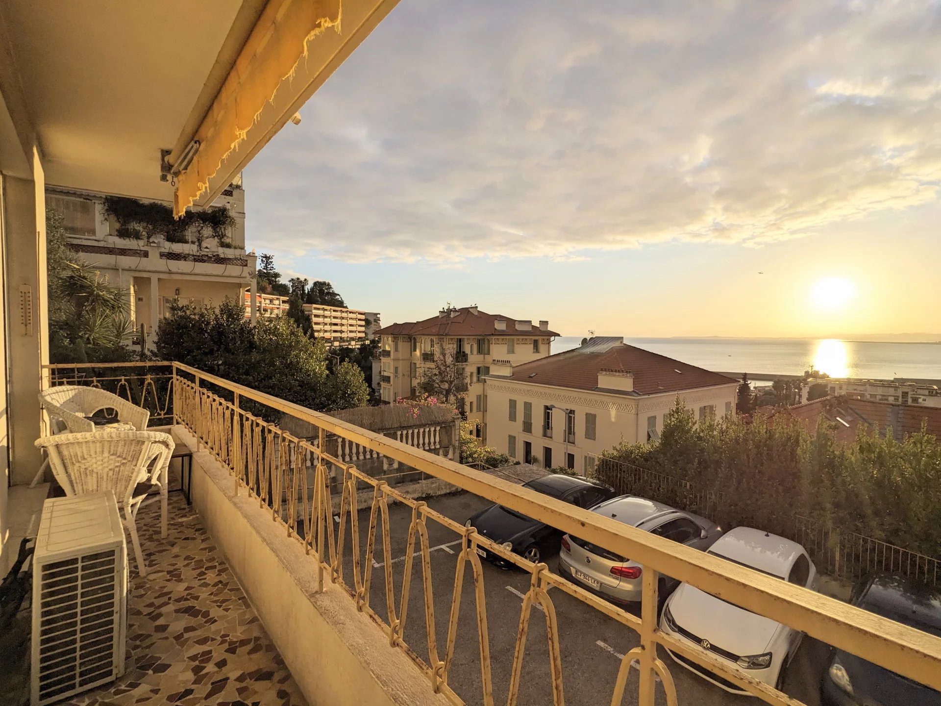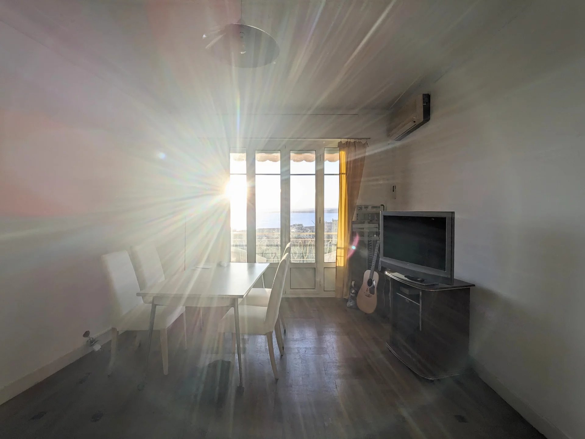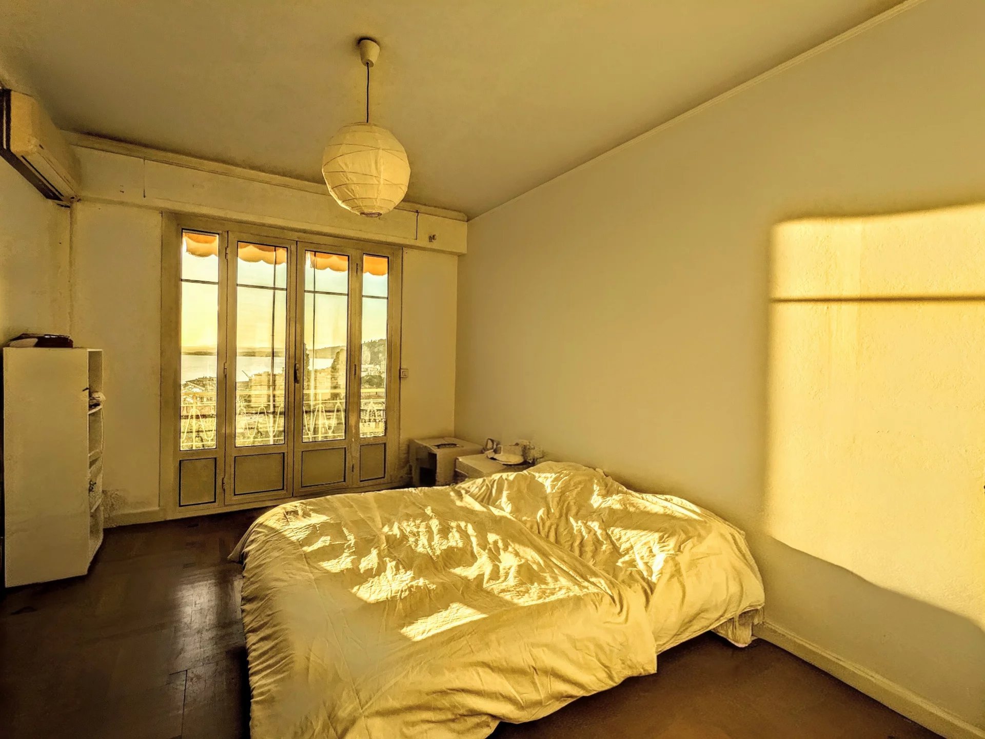 d’un vaste séjour exposé sud-ouest, avec accès à un balcon offrant une vue panoramique sur le port de Nice et la mer,