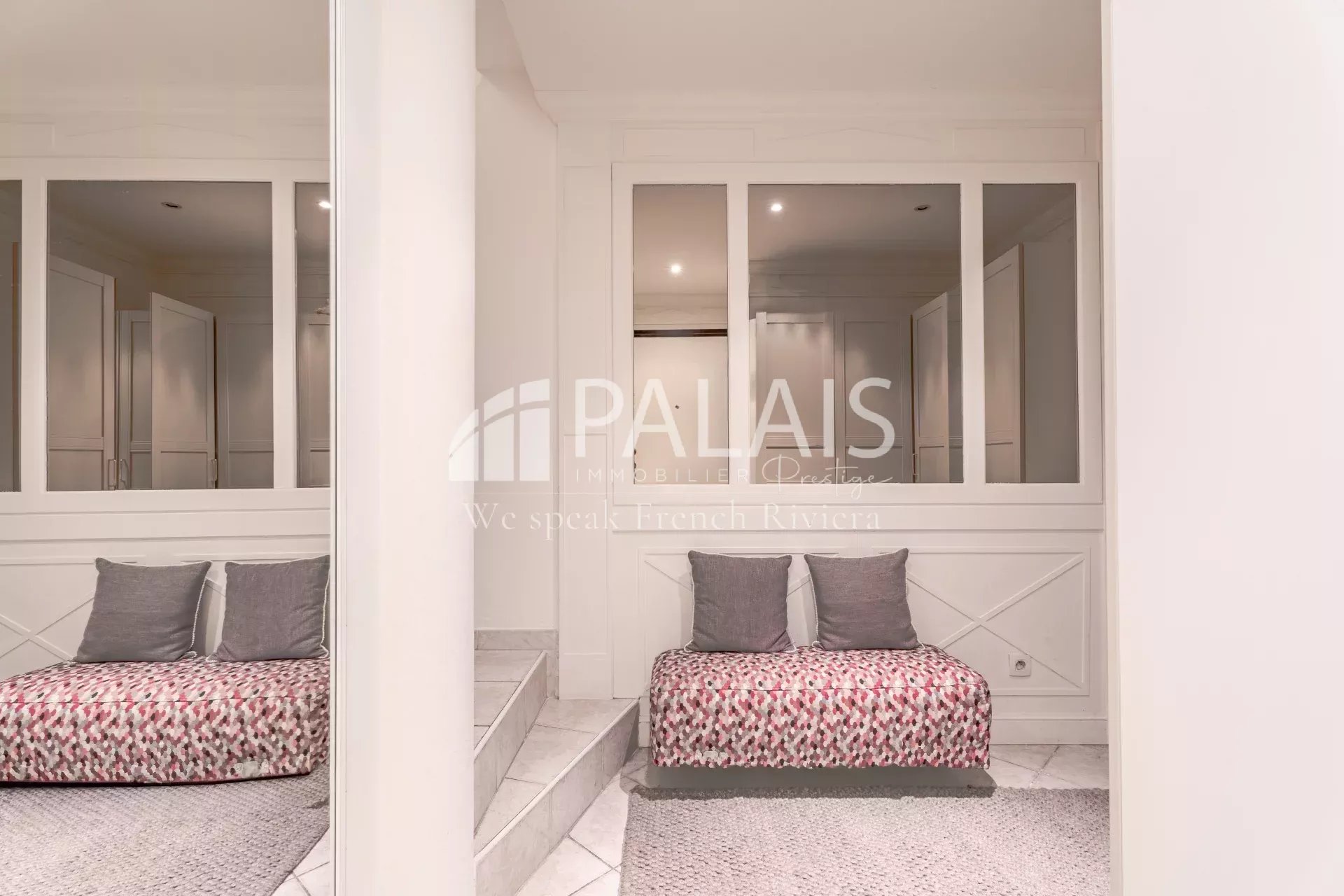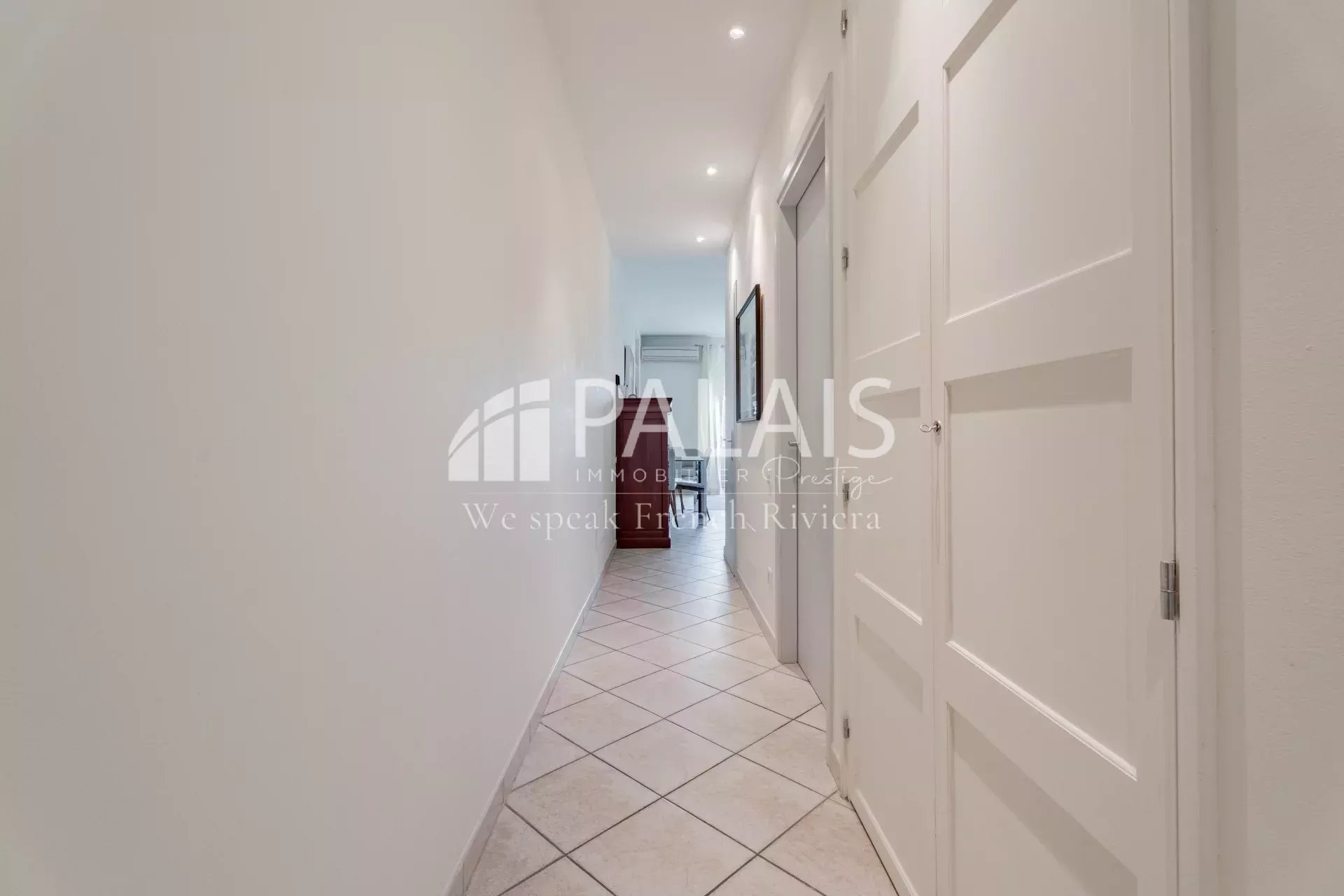 Situé au 1er étage surélevé avec une entrée privative en rez-de-jardin, l’appartement s’ouvre sur un hall avec rangements et dressing, puis un escalier mène à l’espace principal.