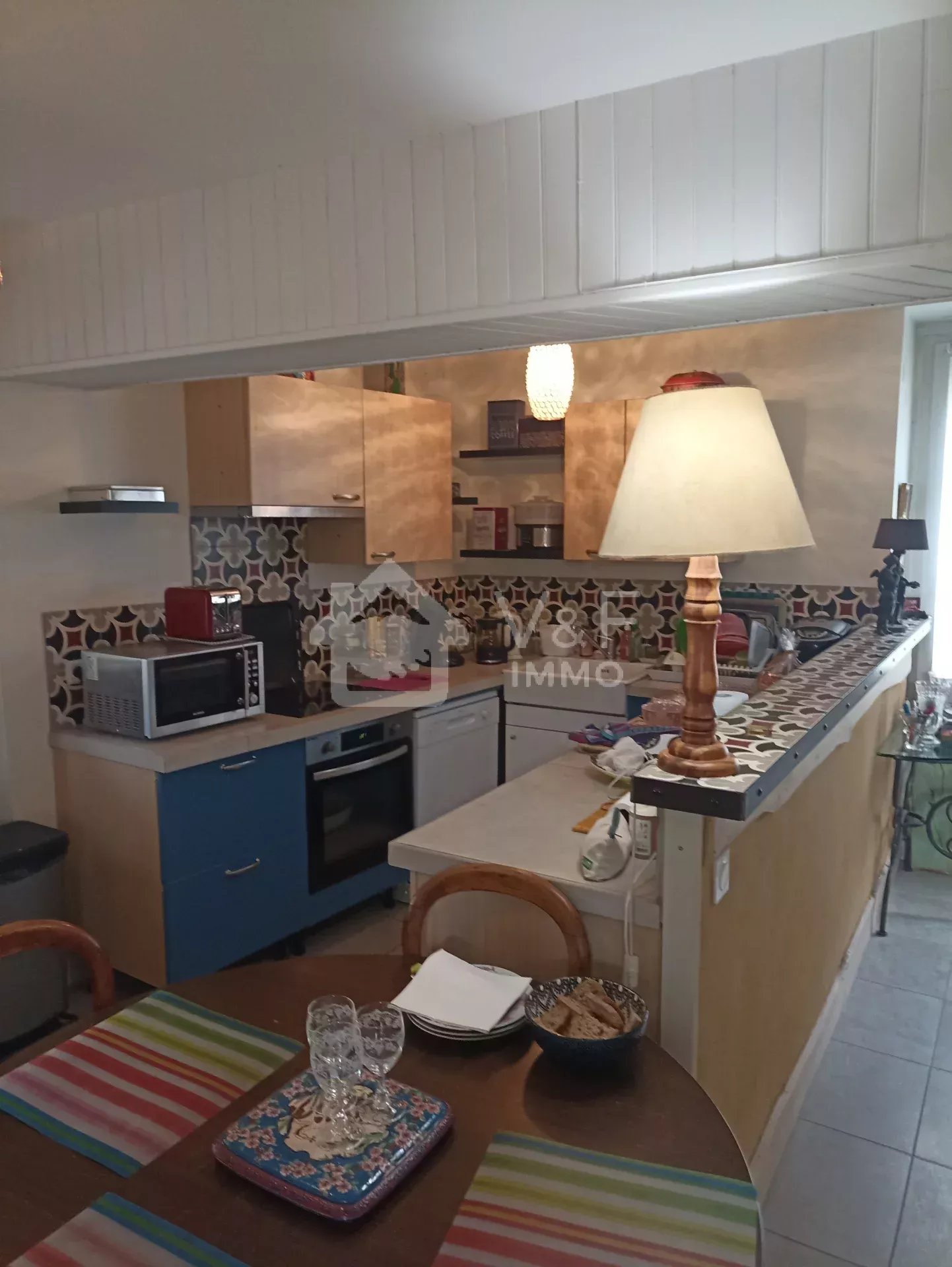 En poussant la porte vous découvrirez une belle pièce a vivre et sa cuisine ouverte dotée d'un poêle à granule alimentant un chauffage central .