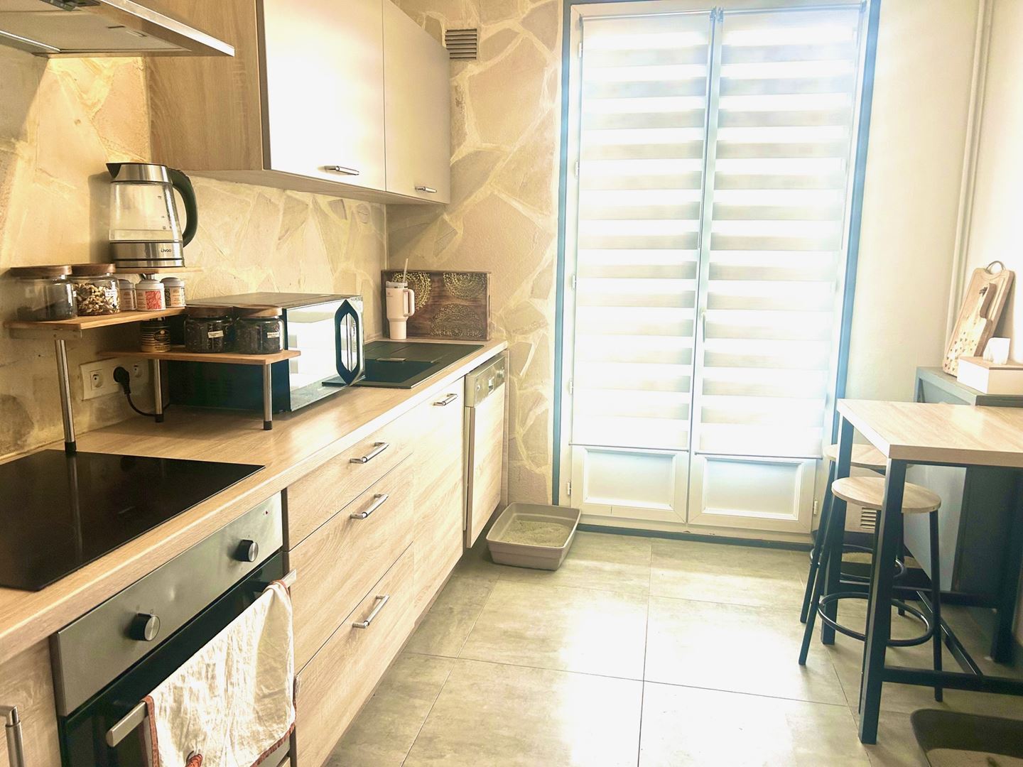 Il est composé d'une cuisine aménagée et équipée donnant accès à un petit balcon, d'un double salon/séjour avec grand balcon, d'une chambre, d'une salle d'eau, d'un petit débarras et de WC indépendants.