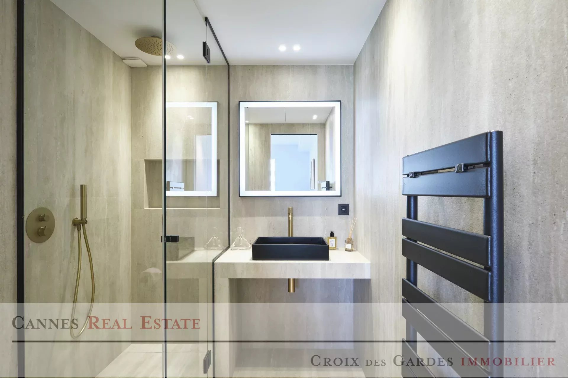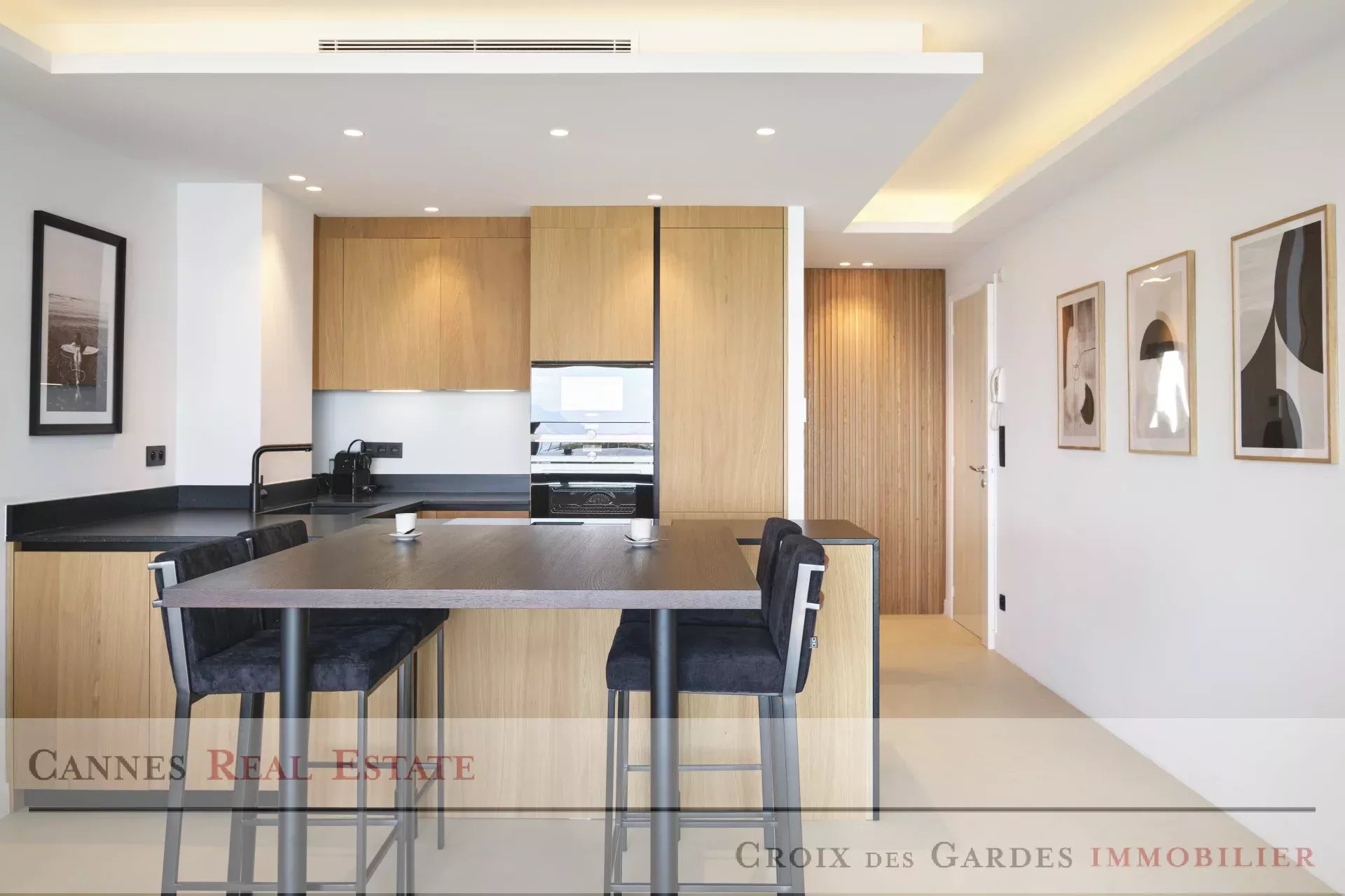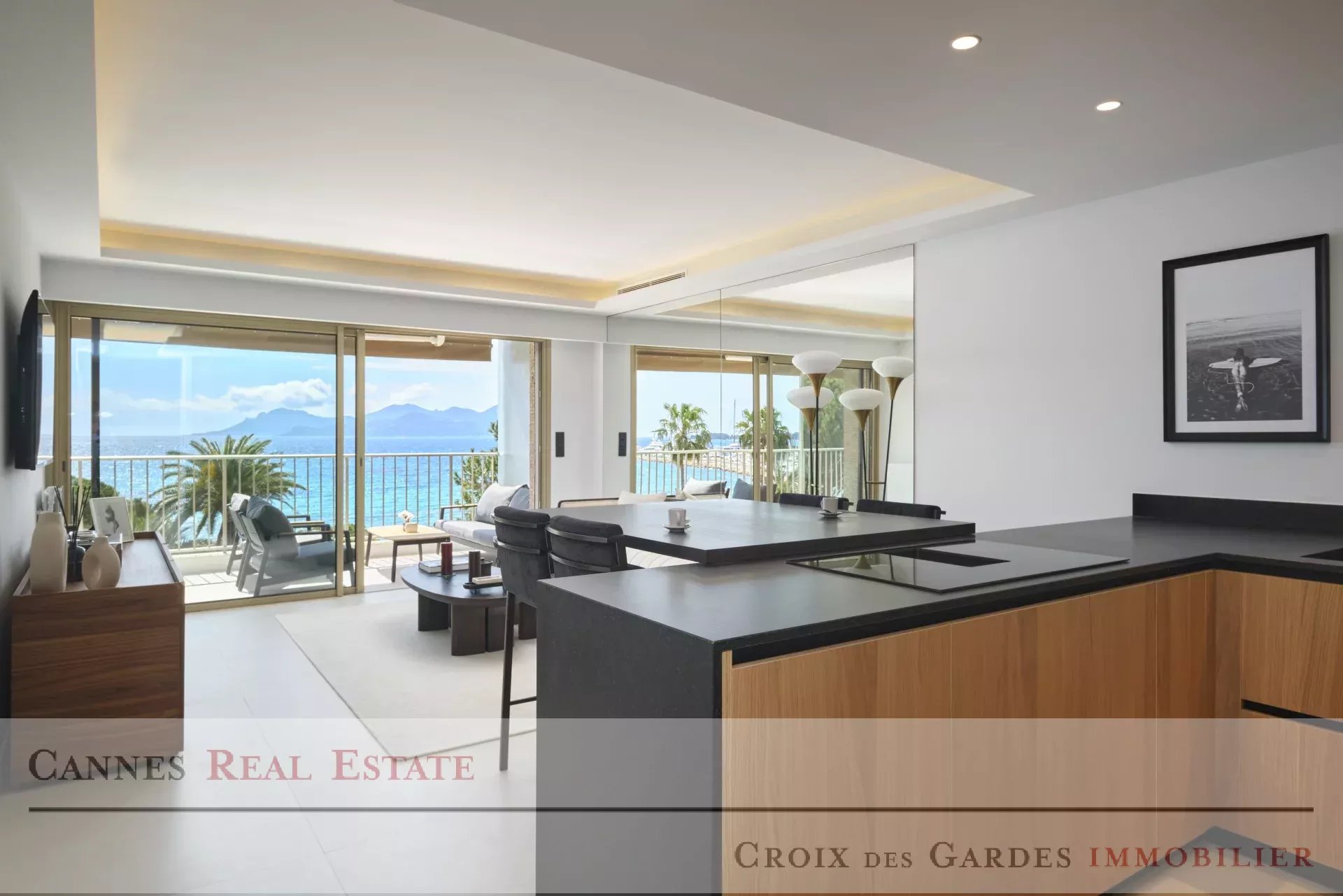 En première ligne Croisette, face à la mer et niché en étage élevé d’une résidence de prestige sécurisée avec gardien, ce sublime appartement traversant d’environ 70 m² a été entièrement rénové avec des matériaux haut de gamme. Il se compose d’un vaste séjour lumineux avec cuisine américaine équipée, ouvrant sur une terrasse d’environ 10 m² offrant une vue imprenable sur la baie de Cannes. Deux chambres élégantes en suite, chacune avec sa salle d’eau, assurent confort et intimité. Une cave complète ce bien d’exception. Possibilité d’acquérir un garage dans la résidence en supplément. Copropriété de 45 lots principaux – Appel de fonds prévisionnel annuel : 3 033 € (incluant gardien, chauffage, eau chaude et froide, fonds Alur).