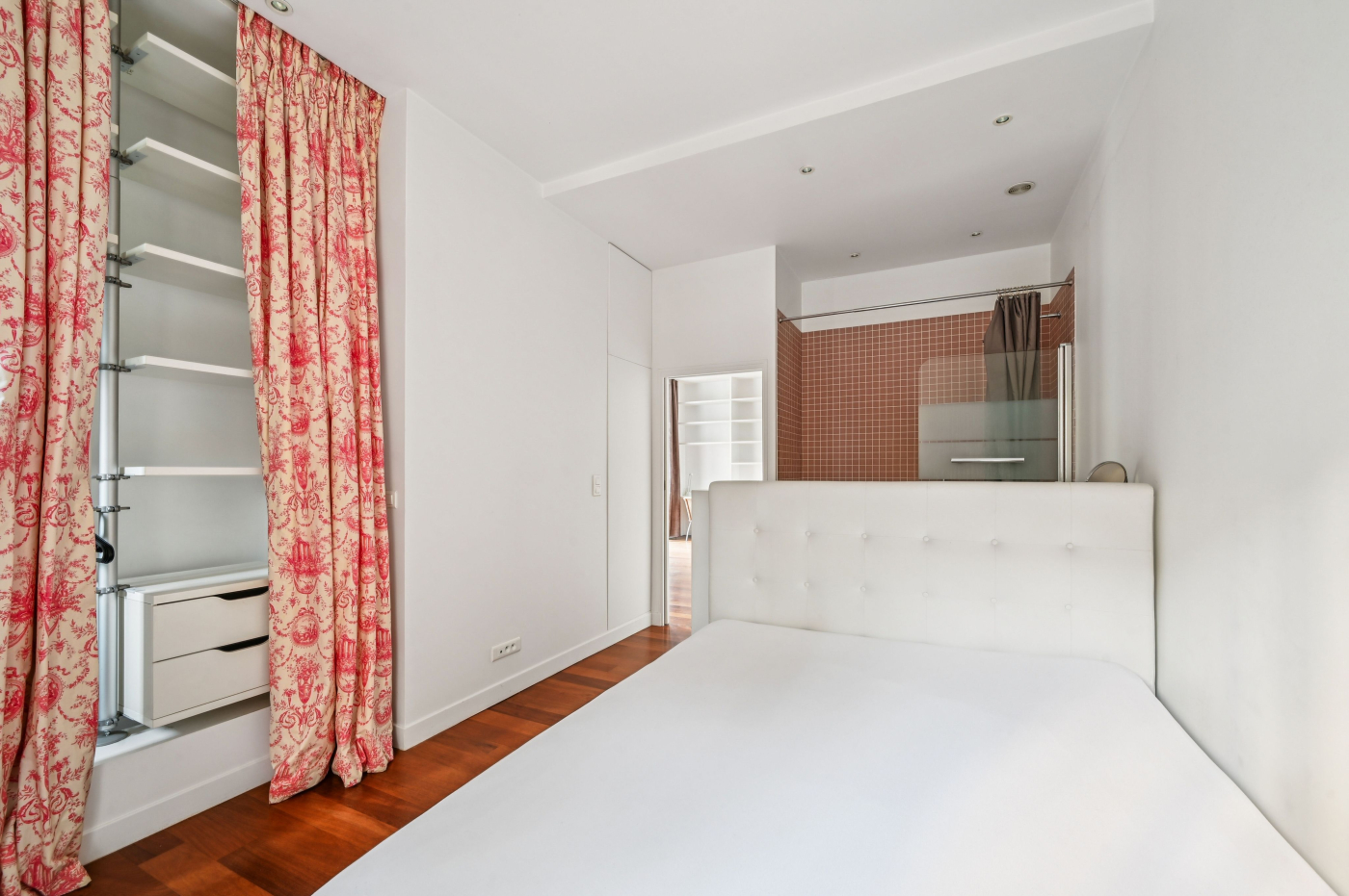 L'appartement se compose d'une entrée menant à un grand séjour doté de deux baies vitrées ouvrant sur une terrasse de 8 m² donnant sur une cour arborée. Cet espace de vie intègre une cuisine américaine aménagée et entièrement équipée, ainsi qu'un coin dinatoire et un espace bibliothèque/bureau. La chambre, orientée sur une seconde terrasse de 8 m² donnant sur une petite cour fermée, bénéficie d'un dressing intégré et d'une salle de bains semi-ouverte. Les WC sont indépendants.