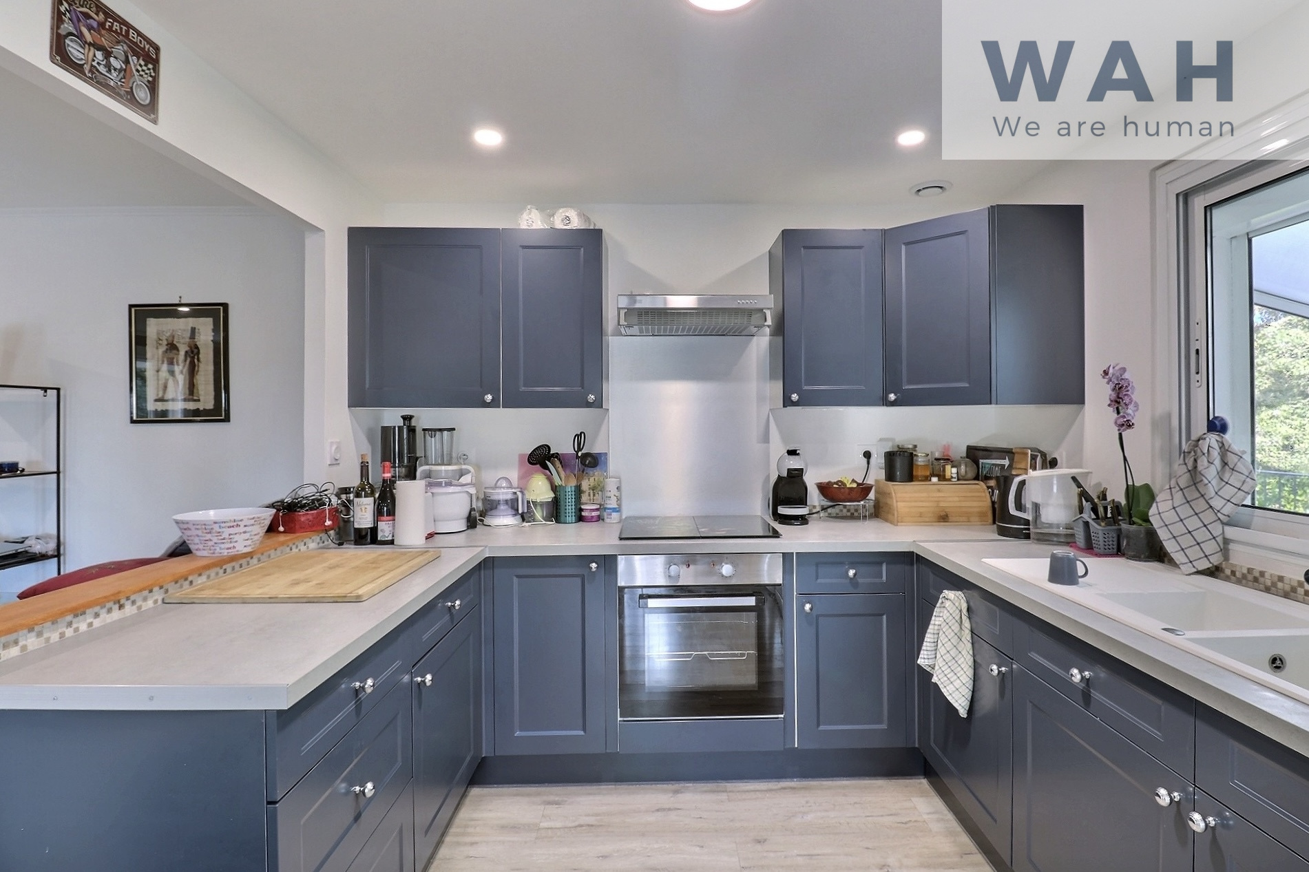 Elle offre une pièce de vie lumineuse avec une cuisine ouverte et équipée, prolongée par une véranda.