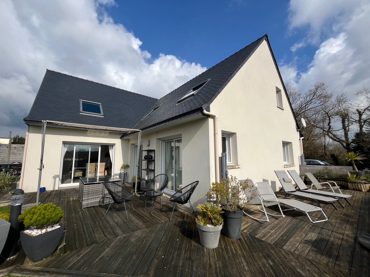Située à Plourin-lès-Morlaix, à seulement 5 minutes du plateau de St Fiacre (Cinéma, Piscine, Intermarché, Fnac, Pharmacie, Hôpital, Lycée et écoles de tous niveaux), cette maison individuelle et habitable de plain-pied, offre un cadre de vie paisible en bout d'impasse, avec une vue dégagée sur la campagne. Implantée sur une parcelle de 1 181 m² sans vis-à-vis, la maison développe 134 m² habitables, exposée Sud et Ouest, idéale pour profiter d'une belle luminosité toute la jou