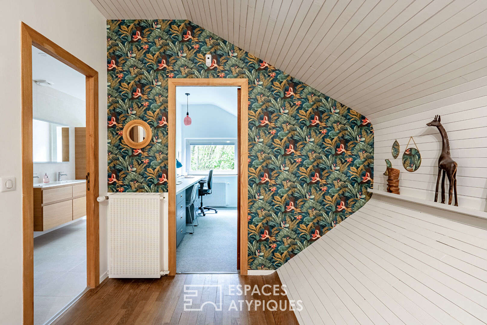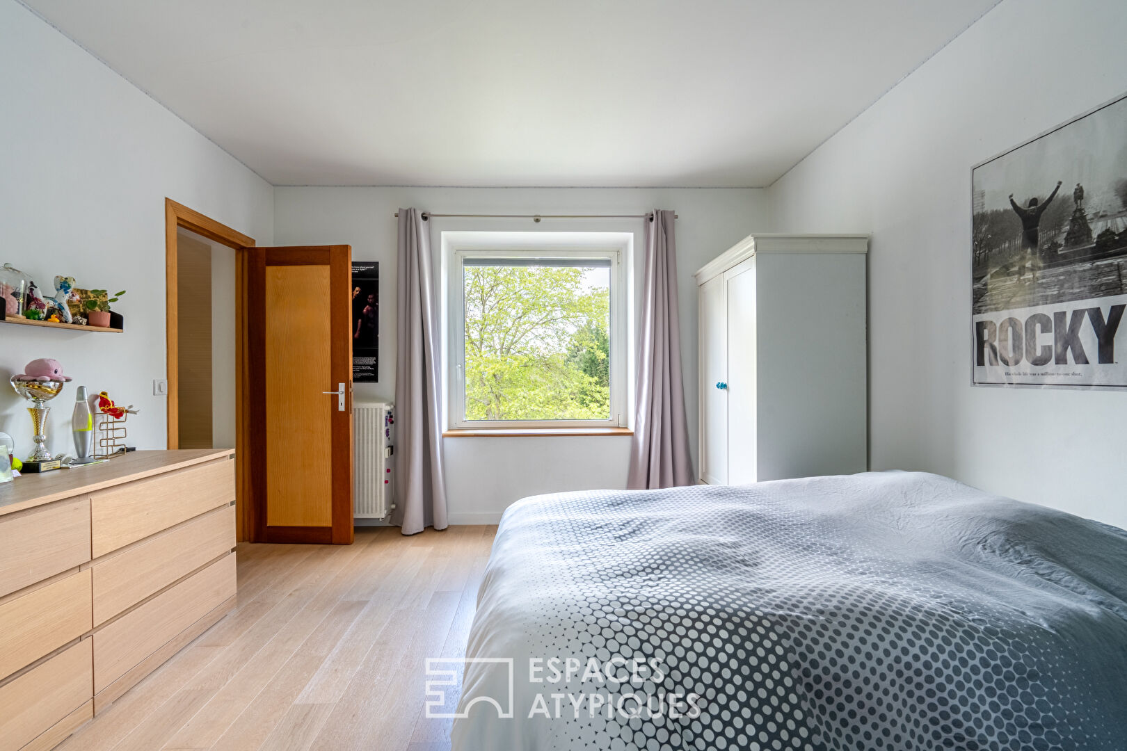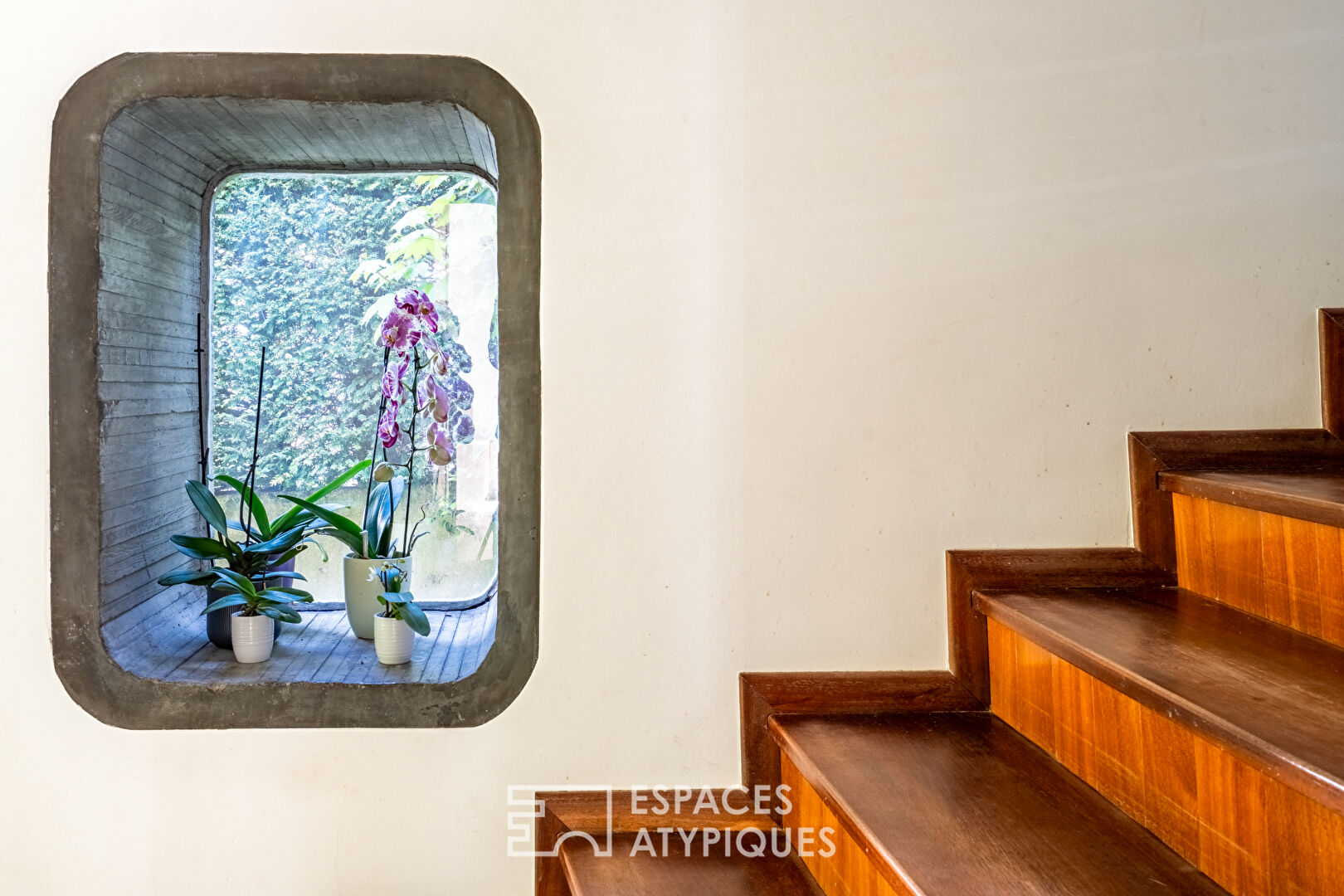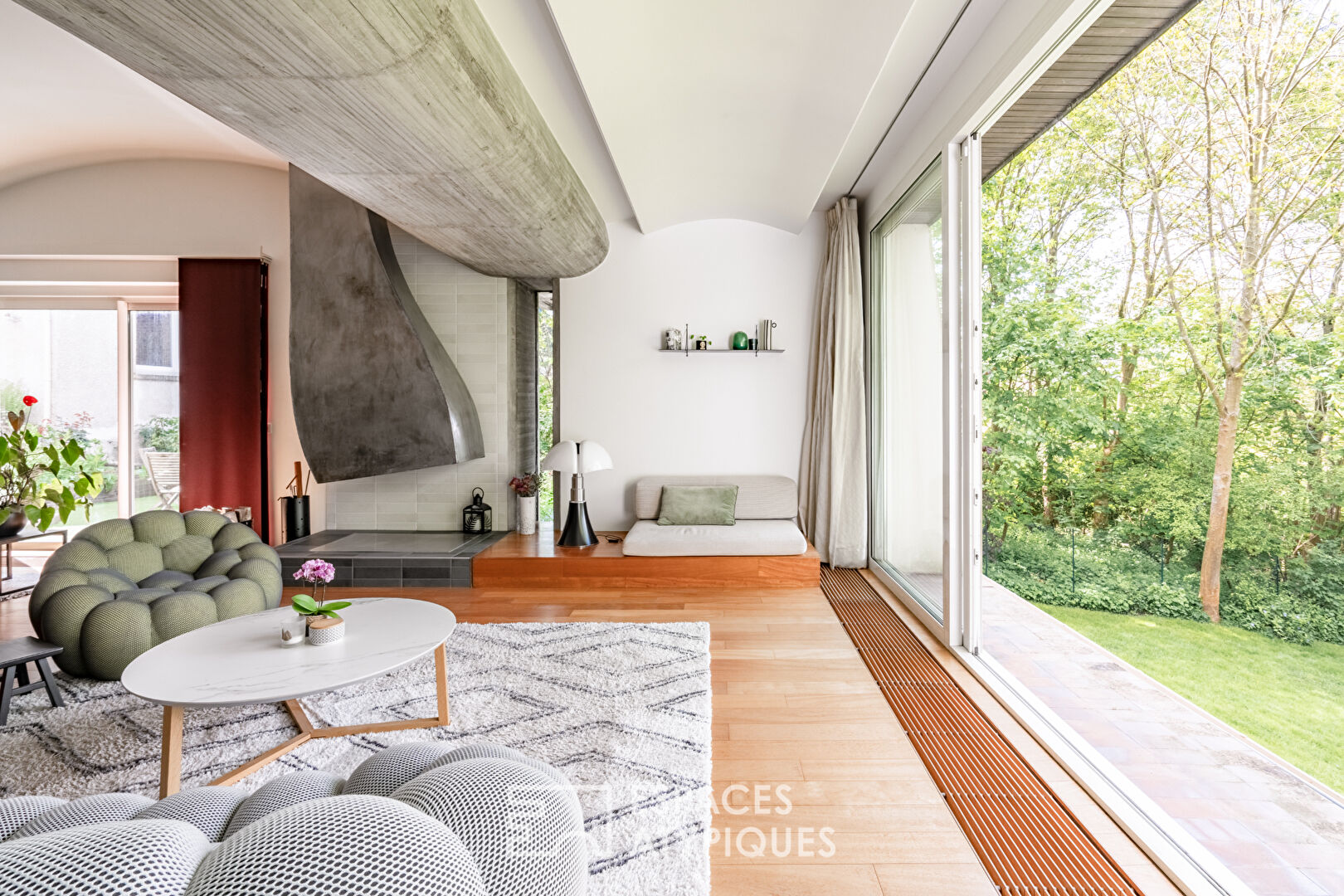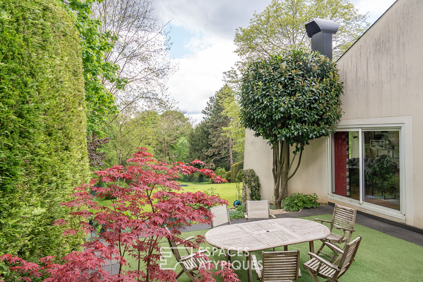 Cette superbe maison d'architecte des années 70, de 190 m² (233 m² au sol) joliment rénovée avec sa dépendance de 35 m² a pris place à flanc de colline dans l'environnement le plus prisé de Bougival, tout en discrétion et à l'abri des regards dans son beau jardin de 1.900 m². L'entrée s'ouvre sur un premier demi niveau qui dessert une chambre avec point d'eau et se permet un accès sur la terrasse, une seconde chambre/espace TV avec balcon profite d'une jolie vue sur le profil de la maison avec sa toiture papillon, entourée d'un superbe jardin. L'escalier propose, au niveau inférieur, la lumineuse pièce de vie qui développe une surface de 60 m², avec son architecture extérieure répétée sur son plafond par une vague intérieure qui s'offre des courbes étonnantes autour d'une ossature béton. La cheminée sculpturale habille divinement ce salon/salle à manger tourné sur son enveloppe verdoyante, visible de ses lucarnes latérales, de sa meurtrière joliment pensée ou encore sa magnifique baie vitrée qui offre au regard une aquarelle permanente évoluant au fil des saisons. La cuisine indépendante, tout juste rénovée, a pris place, derrière ce mur en béton qui se marie joliment avec le volume, le bois du parquet, les courbes de l'escalier et cet environnement verdoyant. Elle offre l'accès au sous-sol de 46 m² situé en demi niveau qui se compose d'une buanderie/local technique, deux pièces de rangement, et une cave à vin. Le premier demi étage mène à un palier qui distribue un bureau et/ou dressing et une salle de bains. Le dernier plateau se compose de deux belles chambres de 16 et 19 m² qui se partagent une salle de bains. La dépendance de 35 m² se compose d'un salon dans lequel les briques anciennes ont été révélées sur la plupart des murs, d'un sauna, avec douche et jacuzzi, pièce facilement modifiable en chambre si besoin. Trois places de parking devant la propriété, un sous-sol supplémentaire de 35 m² niché sous le salon, et un local vélo / poubelles complètent les prestations de ce bien. Cette incroyable maison d'architecte aux courbes particulières et à la conception unique, au calme absolu, située dans ce secteur très prisé du Hameau de Bougival, saura offrir un cocon douillet à la famille qui aura la chance d'investir ce lieu dont on ne peut se lasser... Gare de Bougival à 20 min à pied pour la ligne L pour Paris Saint Lazare Ecole EIB de la Jonchère, sections de la maternelle au Lycée. Ecoles maternelle et élémentaire à 15 min à pied. Collège Jean Moulin à Croissy sur Seine accessible par le bus ligne D en 15 min. A 86 à 4 km A13 et A14 à 8 km CLASSE ENERGIE : D / CLASSE CLIMAT : D. Montant moyen estimé des dépenses annuelles d'énergie pour un usage standard, établi à partir des prix de l'énergie de l'année 2021 : entre 2.850 et 3.910 euros Contact : Sophie 07 61 00 52 78 RSAC Versailles 832 411 144 Sophie STANDERA (EI) Agent Commercial - Numéro RSAC : 832411144 - Paris.