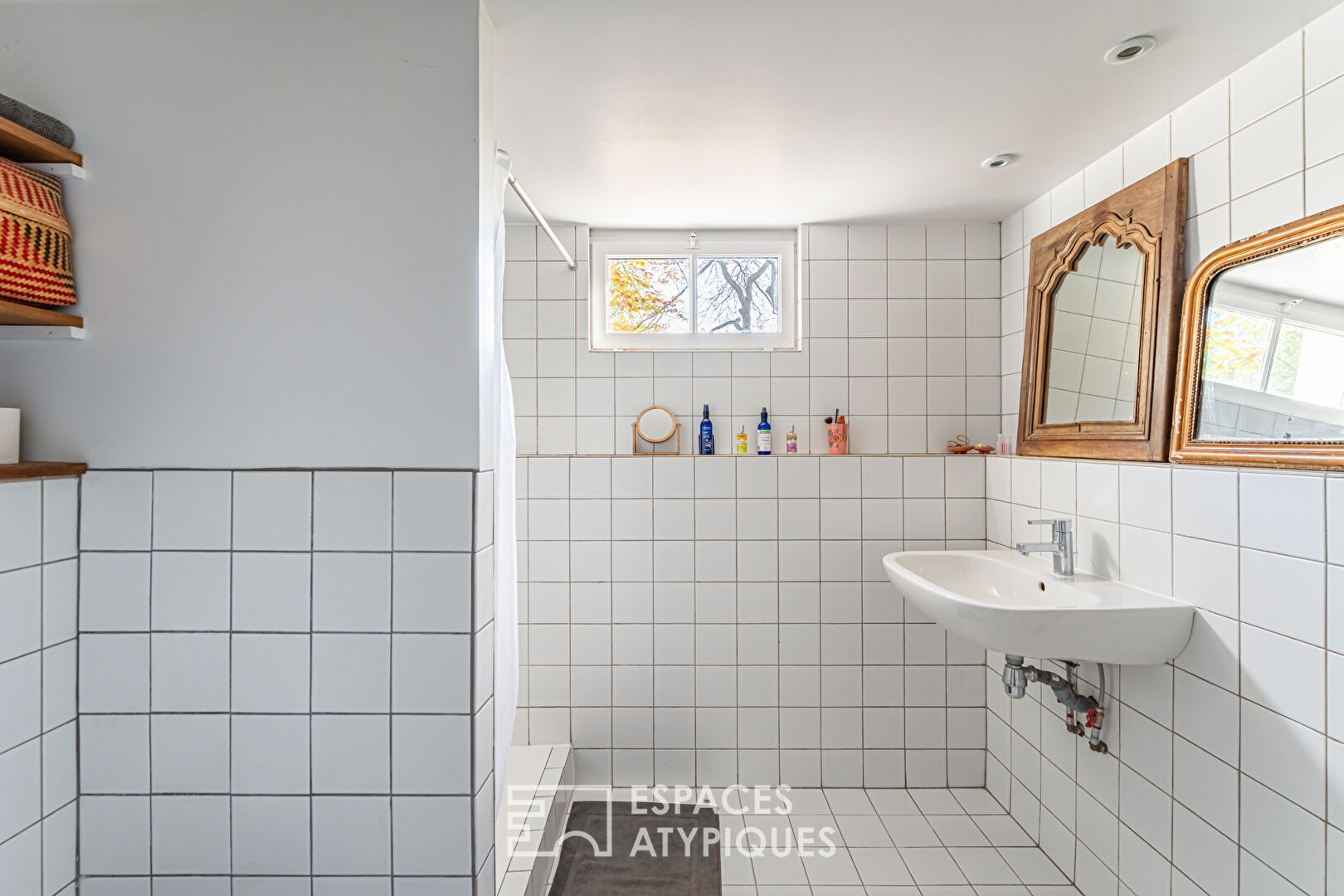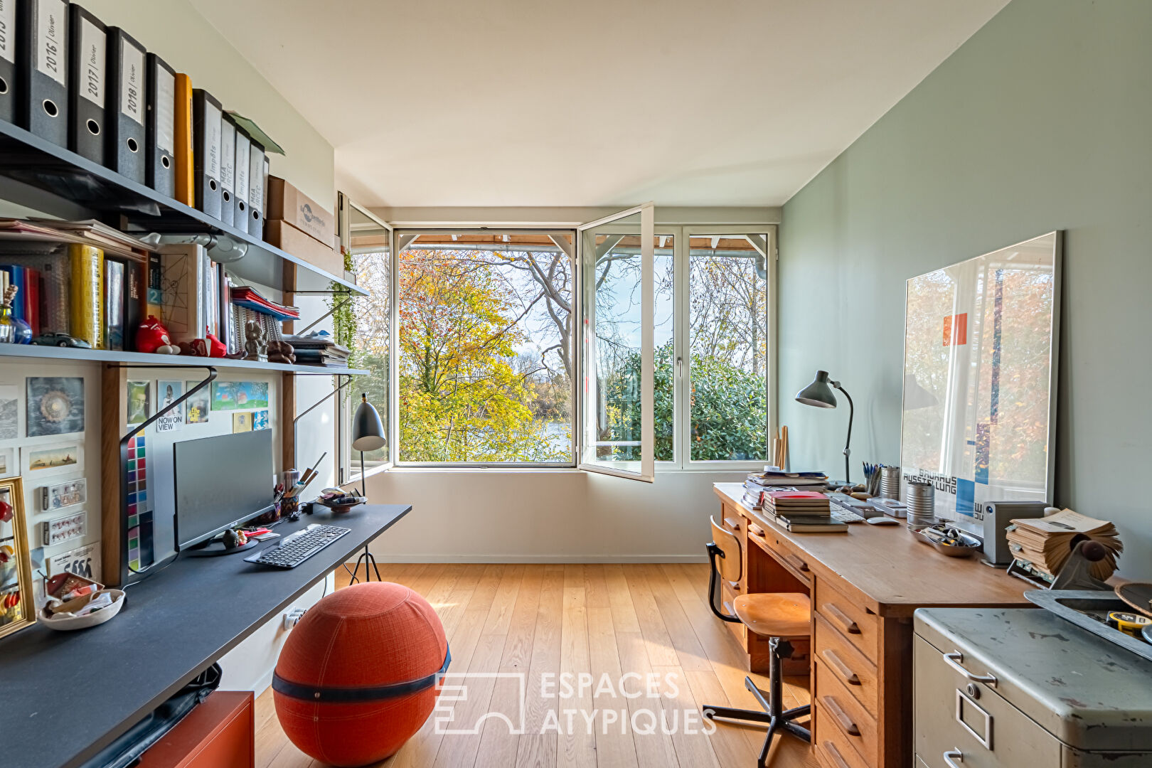 Cette charmante maison située sur l'île de la Dérivation à Carrières-sous-Poissy, prisée pour son ambiance calme et reposante, s'est agrandie en 2014 grâce à une extension très contemporaine en bois pour une superficie totale de 108 m² de confort et de quiétude en harmonie avec la nature environnante. Ses 2 terrasses exposées Est et Ouest vous laisseront le loisir de choisir entre ombre et soleil selon vos envies. L'île est accessible à pied, en vélo, moto ou quad par une passerelle surplombant l'écluse désaffectée depuis 1977 mais qui porte toujours l'empreinte des bateliers. La maison, idéalement située, offre une vue exceptionnelle et reposante sur la Seine. Le salon et salle à manger qui se partagent 42 m² avec la cuisine américaine bénéficient, grâce à sa grande baie vitrée, d'une vue imprenable sur le fleuve et donne accès à sa terrasse en bois de 22m². Un poêle à bois agrémente ce bel espace de vie. Après une volée de marches, le plateau se compose de deux chambres, dont l'une profite d'un coin bureau. L'entresol offre une grande buanderie, des rangements et la salle d'eau. Le plus : une petite dépendance indépendante entièrement rénovée offre 20 m² d'espace à vivre dont une mezzanine qui fera la joie d'un adolescent ou pourra faire office de chambre d'amis ou encore d'un bureau, idéale pour une profession libérale. Un appentis ouvert, juxtaposé à cette maison, permet de stocker le bois et de garer les vélos ou motos. Un box fermé sur le quai est mis gracieusement à la disposition des propriétaires. De nombreuse places de parking sont également disponibles sur rive. Le bus est 100m de la passerelle et vous emmènera en 10mn à la gare de Poissy avec : -le TER J : 18mn de St Lazare, trains toutes les 20 mn aux heures de pointe. -le RER A : 20 mn de La Défense et 35 mn de Chatelet les Halles, RER toutes les 12 mn en heure de pointe; -Eole en cours... CLASSE ENERGIE : D / CLASSE CLIMAT : B. Montant moyen estimé des dépenses annuelles d'énergie pour un usage standard, établi à partir des prix de l'énergie 2021, 2022 et 2023 (abonnement compris) : entre 1.379 et 1.920 euros Les informations sur les risques auxquels ce bien est exposé sont disponibles sur le site Géorisques : https://www.georisques.gouv.fr Contact : Sophie 07 61 00 52 78 RSAC Versailles : 832 411 144 Sophie STANDERA (EI) Agent Commercial - Numéro RSAC : 832411144 - Paris.