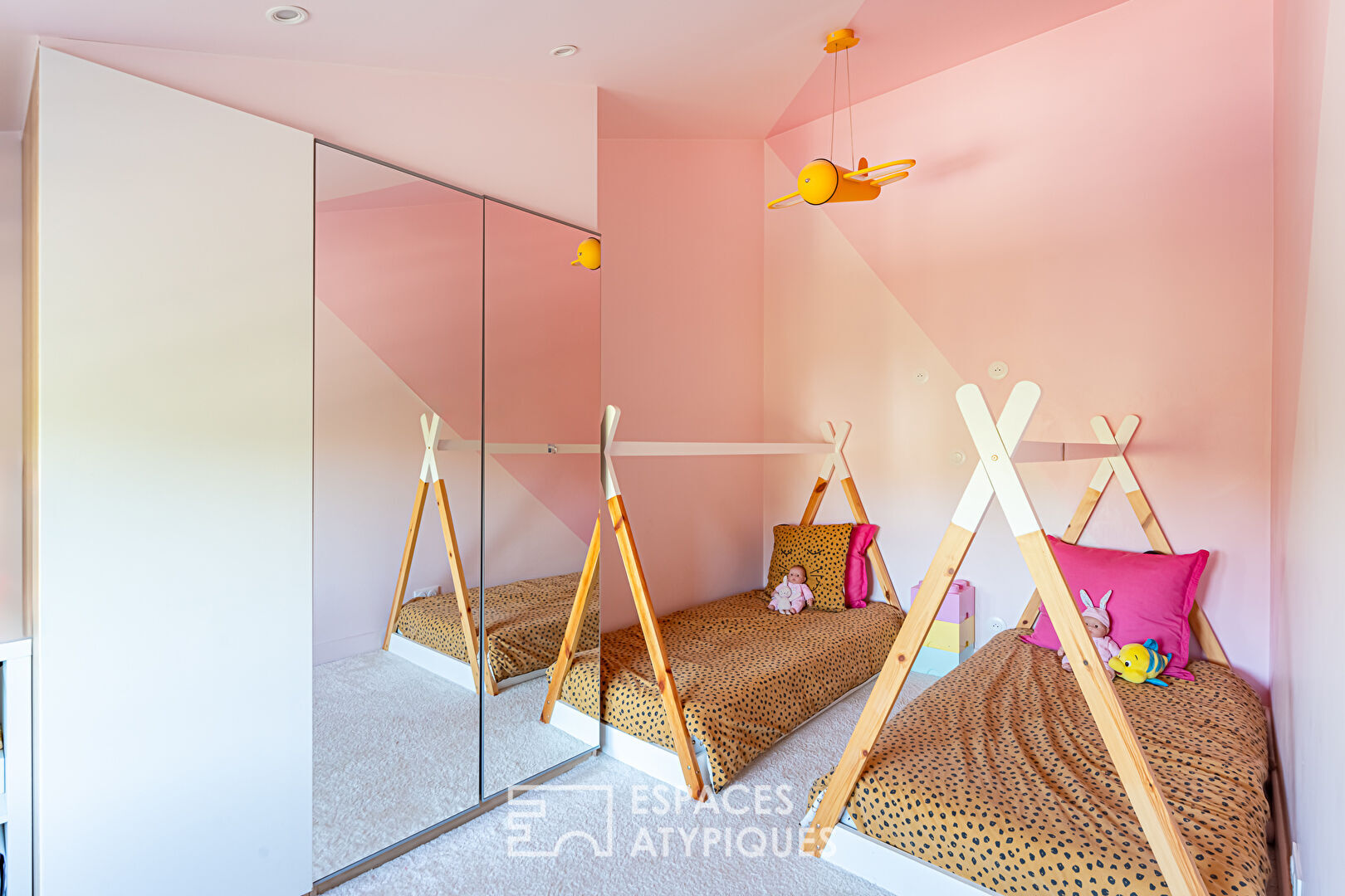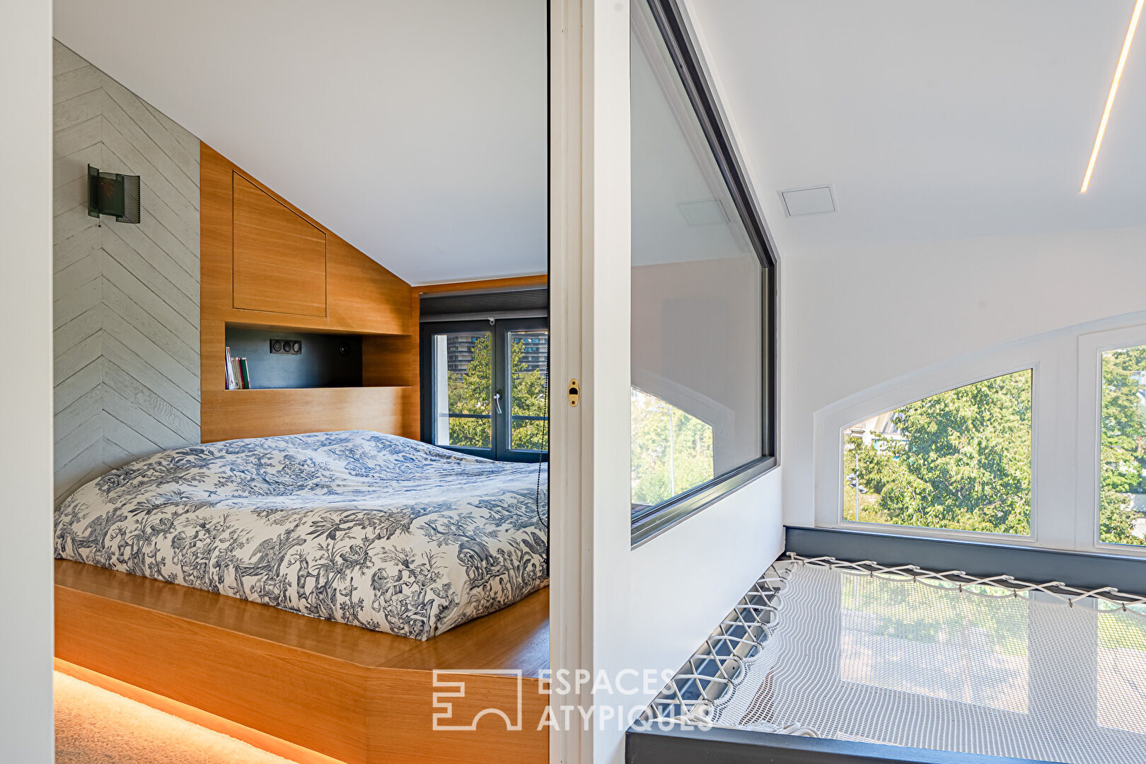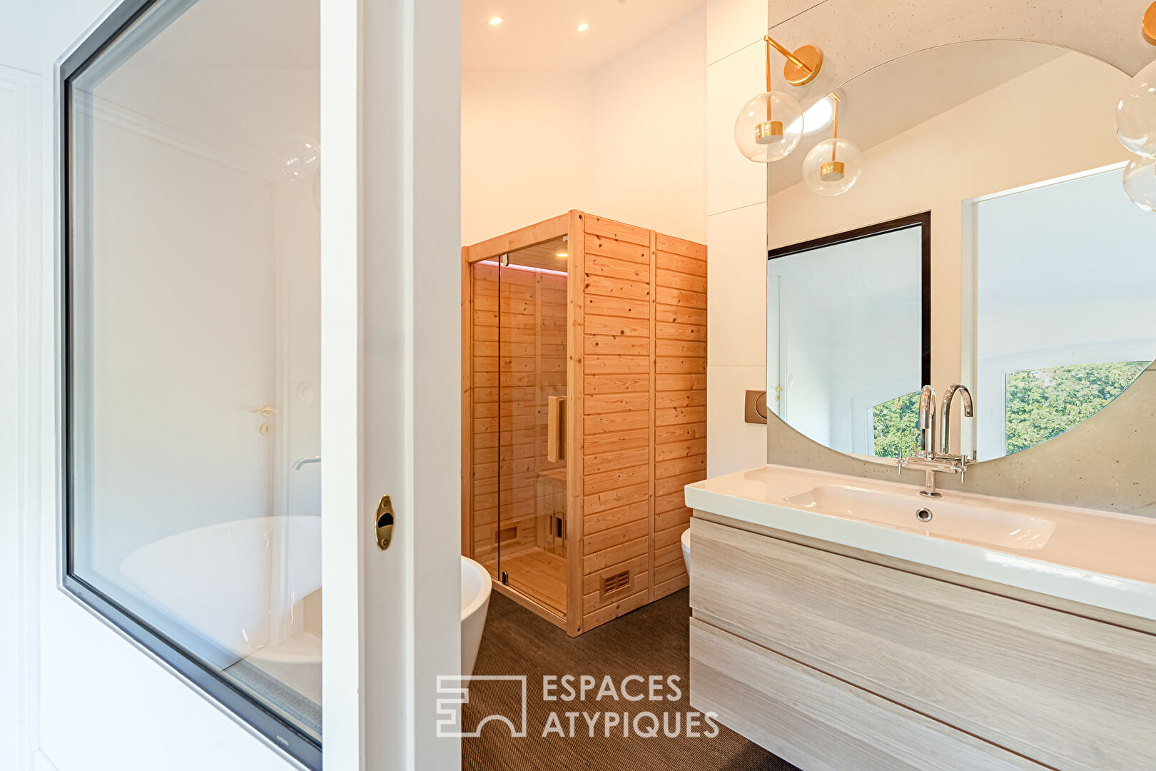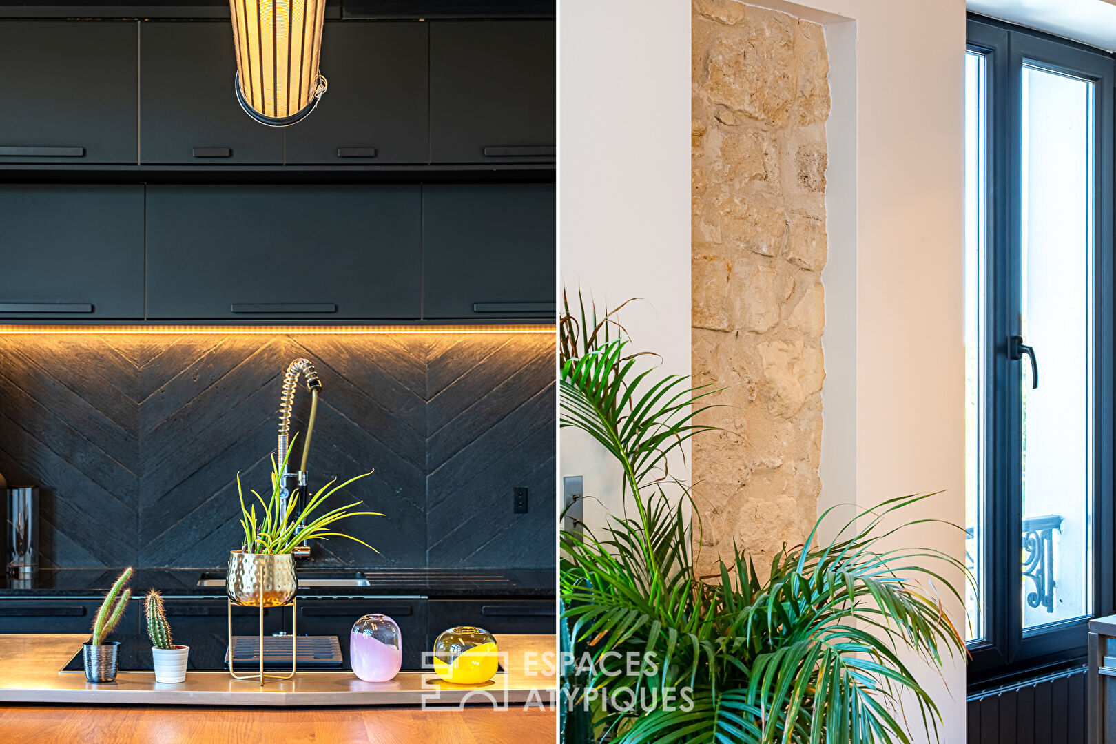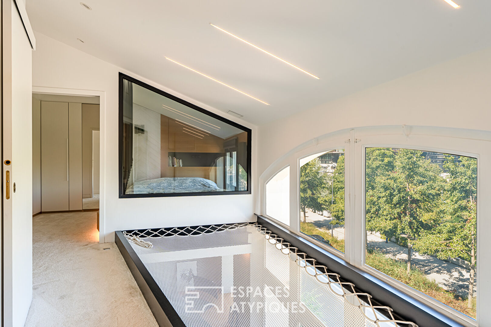 Situé sur les bords de Seine à Meudon, à deux pas du Parc de Saint-Cloud, du Parc de l'île Saint-Germain et de la forêt de Meudon, ce duplex de 84,23 m² Carrez (99,59 m² au sol) occupe les derniers étages d'un ancien hôtel particulier du XIXe siècle, récemment ravalé. Niché dans une petite copropriété, il a été entièrement restructuré et repensé avec une rénovation contemporaine haut de gamme qui sublime son caractère historique. L'entrée, dotée de rangements, s'ouvre sur un espace bureau astucieusement aménagé, pouvant être fermé par une porte coulissante en bois massif. Dans la continuité, la pièce de vie impressionne par une baie vitrée de 5 m sur 5, inondant l'espace de lumière naturelle et offrant une atmosphère unique. Elle s'ouvre sur un balcon, idéal pour profiter d'une vue dégagée avec pour seul vis-à-vis les quais de Seine. Le séjour s'organise autour d'une cuisine ouverte au design épuré et d'un coin repas convivial. Depuis ce niveau, un filet aérien attire le regard : il souligne la hauteur sous plafond et crée une connexion visuelle avec l'étage supérieur. Chaque détail a été pensé pour offrir une harmonie élégante entre les matériaux : parquet massif en point de Hongrie dans le séjour et jeu de lumières subtilement intégré dans tout l'appartement. Un toilette japonais et une buanderie complètent ce niveau. A l'étage, deux chambres avec rangements intégrés se font face et s'articulent autour d'un espace central. Celui-ci accueille un filet pensé comme un lieu de détente convivial et insolite, presque une pièce à vivre supplémentaire flottant entre les deux niveaux. La salle de bains combine douche, baignoire et toilettes japonaises, et s'agrémente d'un sauna. A deux pas du quartier culturel de l'île Seguin qui ouvrira ses portes en 2026, l'appartement profite d'un environnement privilégié : cinéma, centre d'art, commerces et restaurants seront accessibles en moins de cinq minutes à pied, et une passerelle permettra de relier Meudon à Boulogne en quelques minutes. Possibilité de stationnement au pied de l'immeuble Ce duplex contemporain conjugue le cachet de l'ancien et une rénovation design aux finitions soignées. Un bien atypique et élégant, pensé comme un véritable lieu de vie inspirant. Tramway (T2) à 2 min Carte scolaire : Ecole maternelle et élémentaire Perrault - Brossolette (5 min à pied) CLASSE ENERGIE : D / CLASSE CLIMAT : B Montant moyen estimé des dépenses annuelles d'énergie pour un usage standard, établi à partir des prix de de l'énergie de l'année 2021 : entre 1300 euros et 1810 euros. Contact : Vincent - 07 49 77 18 94 - EI - Agent Commercial - RSAC : 891 553 695 - Paris. Copropriété de 7 lots - dont 7 lots habitation. (Pas de procédure en cours). Charges annuelles : 1536 euros. Vincent ROSCA (EI) Agent Commercial - Numéro RSAC : 891553695 - Paris.