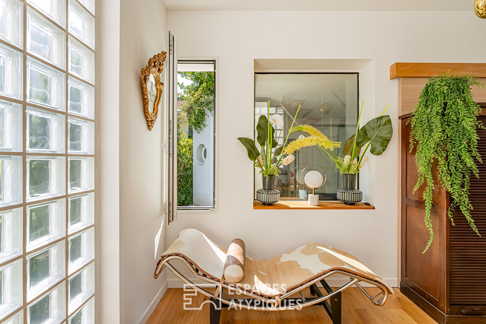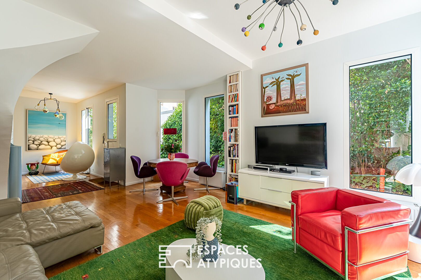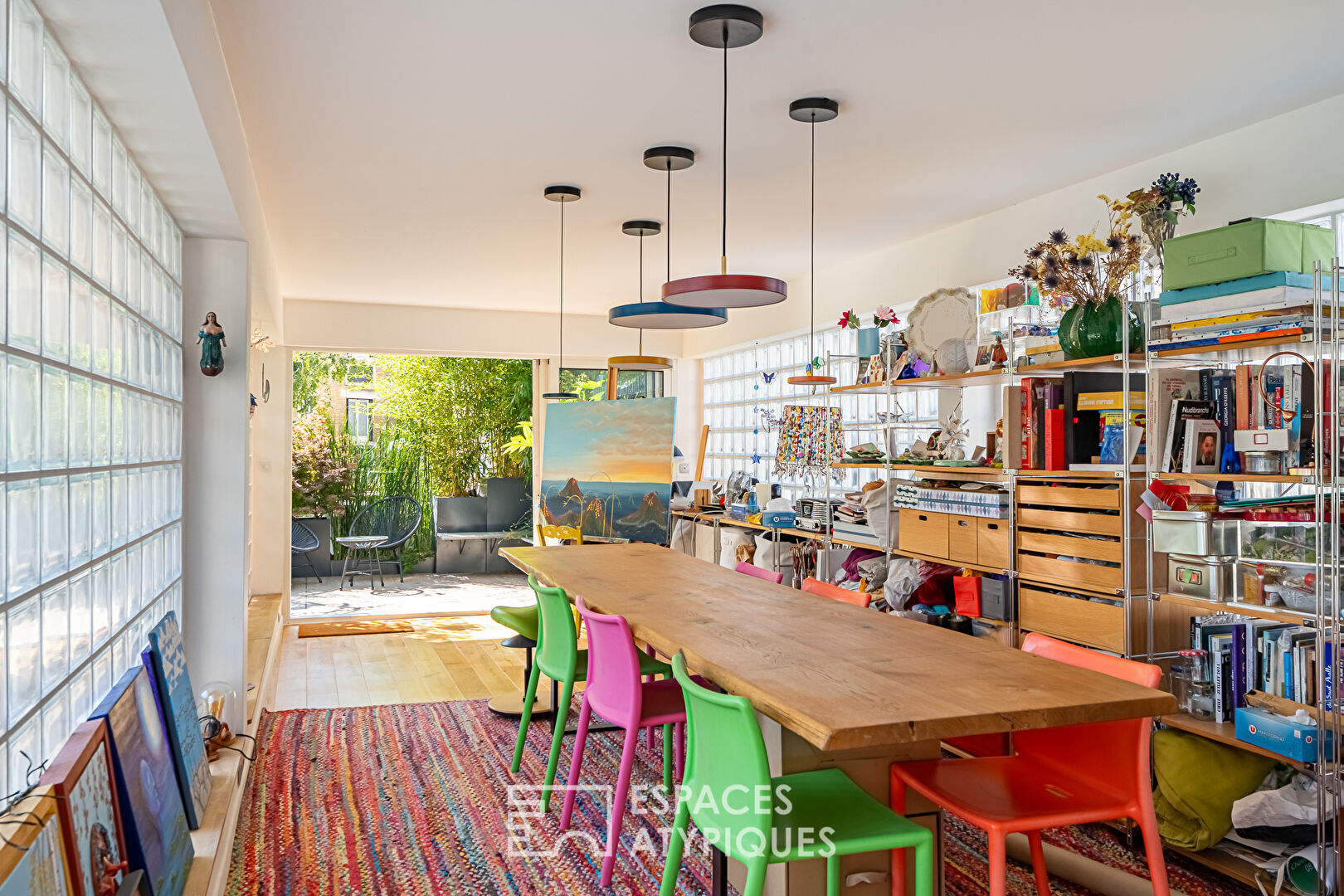 Nichée à l'abri des regards, en fond de copropriété, cette maison d'inspiration moderniste évoque les lignes épurées et l'élan avant-gardiste de l'architecte Robert Mallet-Stevens, figure emblématique de l'architecture du XXe siècle. Lovée dans un écrin de verdure, à deux pas de la gare de Clamart et de toutes les commodités, elle déploie une silhouette aux accents géométriques, jouant avec la lumière et les volumes. Construite en 1995 puis agrandie en 2023 dans le respect de l'architecture d'origine, cette propriété singulière se compose de deux bâtis indépendants : une maison principale de 125 m² et une dépendance de 35 m², le tout organisé autour d'un agréable jardin au calme. Dès l'entrée, le ton est donné. Une cour privative arborée précède une grille en fer forgé, derrière laquelle se révèle une façade aux tons bleutés ponctuée de briques de verre, qui diffusent une lumière douce tout en soulignant les lignes géométriques de l'ensemble. Le rez-de-chaussée accueille une superbe pièce de vie de 38 m² à la belle hauteur sous plafond, baignée de lumière par de larges ouvertures qui cadrent la végétation extérieure comme des oeuvres graphiques. L'espace se structure naturellement en plusieurs ambiances : un salon chaleureux autour de la cheminée contemporaine s'ouvrant sur la terrasse et le jardin, un coin repas convivial, et un espace lecture ou bibliothèque plus intime. Une agréable cuisine indépendante complète ce niveau. Un escalier en courbe, sculptural et aérien, structure l'espace et conduit à l'étage supérieur. Ce dernier comprend une chambre de 13 m² bénéficiant d'une double exposition, une salle de bains, des WC séparés, ainsi qu'une seconde chambre de 12 m2 prolongée d'un espace bureau en enfilade, baigné de lumière naturelle. Au dernier niveau, un vaste atelier, entouré de briques de verre, capte la lumière tout au long de la journée. Conçu comme un véritable atelier d'artiste, ce volume inspire par sa clarté, ses volumes, et son atmosphère hors du temps. Propice à la création, il peut aussi être aménagé en suite parentale ou en quatrième chambre. Il s'ouvre sur une terrasse suspendue, un jardin secret perché à l'abri des regards. En complément, une dépendance indépendante de 35 m² avec chambre et salle d'eau permet d'accueillir confortablement amis ou famille, ou d'imaginer un espace de travail au calme. Une cave complète les prestations de ce bien. Ce lieu rare et confidentiel séduira les amateurs d'architecture expressive et d'espaces lumineux, en quête d'un cadre de vie inspirant, entre nature, art et modernité, à seulement quelques minutes de Paris et à proximité de toutes les commodités. Gare de Clamart à 3 min à pied : ligne N (accès Montparnasse en 7 min) - Métro Ligne 15 à venir. Marché de La Fourche à 3 min à pied. CLASSE ENERGIE : C / CLASSE CLIMAT : C Montant moyen estimé des dépenses annuelles d'énergie pour un usage standard, établi à partir des prix moyens des énergies indexés sur les années 2021, 2022, 2024 : entre 1 760 euros et 2 420 euros. Les informations sur les risques auxquels ce bien est exposé sont disponibles sur le site Géorisques : https://www.georisques.gouv.fr Contact : Philippine - 07 85 61 67 26 - EI - Agent Commercial - RSAC : 853 886 992 - Versailles. Copropriété de 9 lots - dont 9 lots habitation. (Pas de procédure en cours). Charges annuelles : 1968 euros. Philippine CHARLET (EI) Agent Commercial - Numéro RSAC : 853886992 - Versailles.