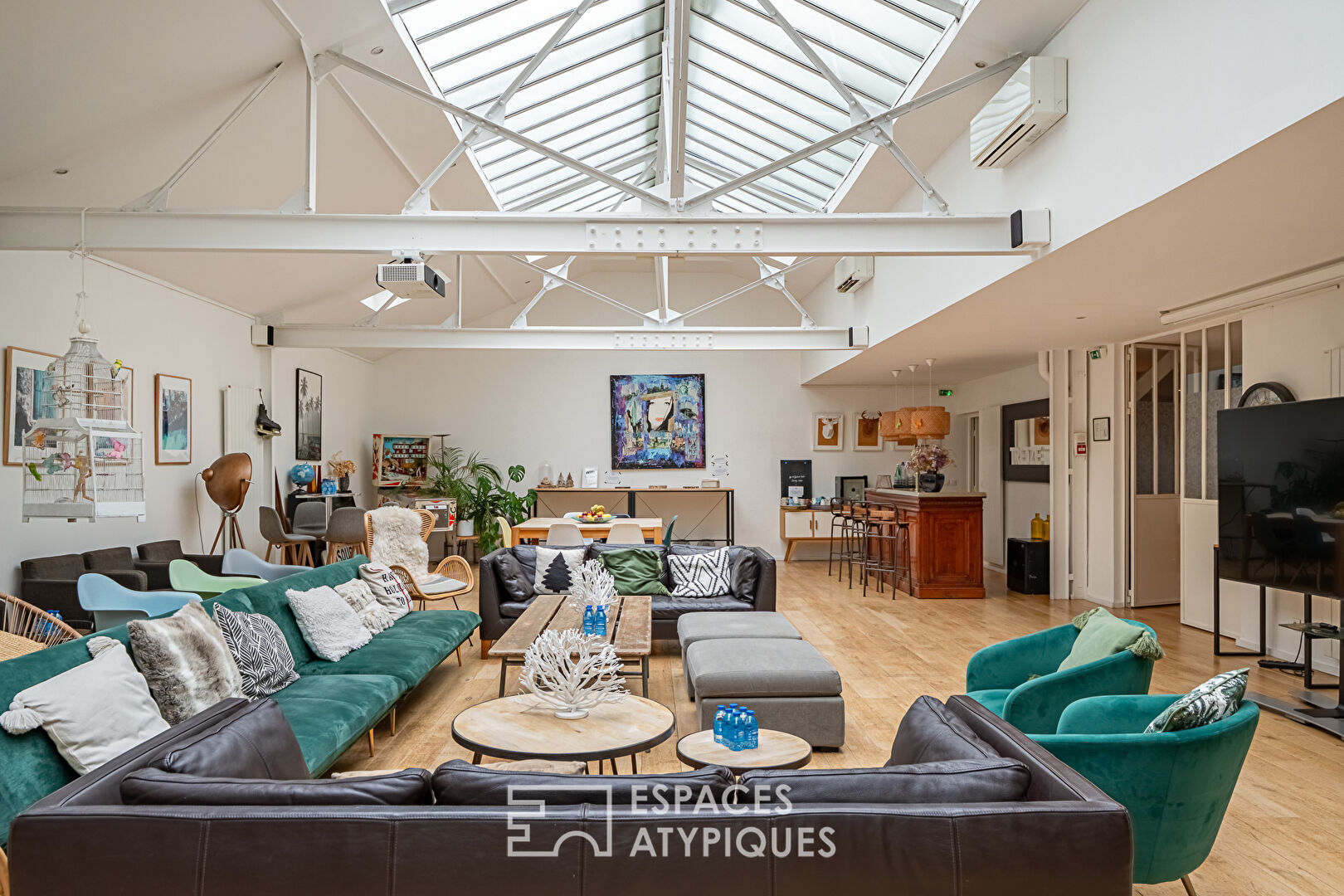 Au coeur de Clichy, à proximité immédiate des Allées Gambetta et du siège de L'Oréal, cet ancien atelier de métaux séduit par sa rénovation complète et la qualité de ses prestations. Développé sur deux niveaux indépendants (R+1), il déploie 410 m² habitables répartis entre un vaste espace professionnel et un loft résidentiel lumineux, avec entrées distinctes sur rue. Un bien rare sur le marché immobilier Clichois, idéal pour un projet de vie et d'activité réunis au même endroit. Le rez-de-chaussée, d'une surface généreuse de 260 m², s'organise autour d'un hall d'accueil élégant menant à un open-space de 43 m² et deux bureaux fermés. En son centre, un spectaculaire espace événementiel de 130 m², baigné de lumière grâce à une verrière type Eiffel et à une hauteur sous plafond de plus de 5 mètres, crée une atmosphère unique. Cet espace modulable s'adapte parfaitement à une activité tertiaire, libérale ou créative. Un office traiteur indépendant et une cave complètent ce niveau, pensé pour la fonctionnalité et le confort professionnel. L'étage accueille un loft de 151 m² (141 m² Carrez), où la remarquable hauteur sous plafond, la structure en bois apparente et les grands volumes ouverts composent un espace lumineux au caractère unique. La pièce de vie de 72 m², revêtue d'un parquet massif et ouverte sur une cuisine équipée haut de gamme, se prolonge vers une terrasse de 37 m² orientée plein ciel. La charpente apparente et la double exposition confèrent à cet espace une atmosphère à la fois chaleureuse et lumineuse. La partie nuit comprend une suite parentale avec dressing et salle de bain, deux chambres, une salle d'eau et une buanderie. Situé à 300 m du métro Mairie de Clichy (ligne 13) et à 800 m de Porte de Clichy (ligne 14), ce bien bénéficie d'un environnement urbain recherché, vivant et commerçant. La possibilité d'extension jusqu'à R+5 et la polyvalence des espaces en font un investissement immobilier à fort potentiel, alliant caractère, fonctionnalité et élégance atypique. LOFT : CLASSE ENERGIE : C / CLASSE CLIMAT : A. Montant moyen estimé des dépenses annuelles d'énergie pour un usage standard, établi à partir prix moyens des énergies indexés sur les années 2021, 2022, 2023 (abonnements compris) : entre 1500 euros et 2120 euros. BUREAUX : CLASSE ENERGIE : C / CLASSE CLIMAT : A. Montant moyen estimé des dépenses annuelles d'énergie pour un usage standard, établi à partir prix moyens des énergies indexés sur les années 2021, 2022, 2023 (abonnements compris) : entre 6000 euros et 8130 euros. Les informations sur les risques auxquels ce bien est exposé sont disponibles sur le site Géorisques : https://www.georisques.gouv.fr Contact : Sophie YON- 06 18 36 65 84 - EI - Agent Commercial - RSAC : 837 580 166 Nanterre. Copropriété de 2 lots - dont 1 lots habitation. (Pas de procédure en cours). Charges annuelles : 2400 euros. Sophie YON (EI) Agent Commercial - Numéro RSAC : 837 580 166 - Nanterre.
