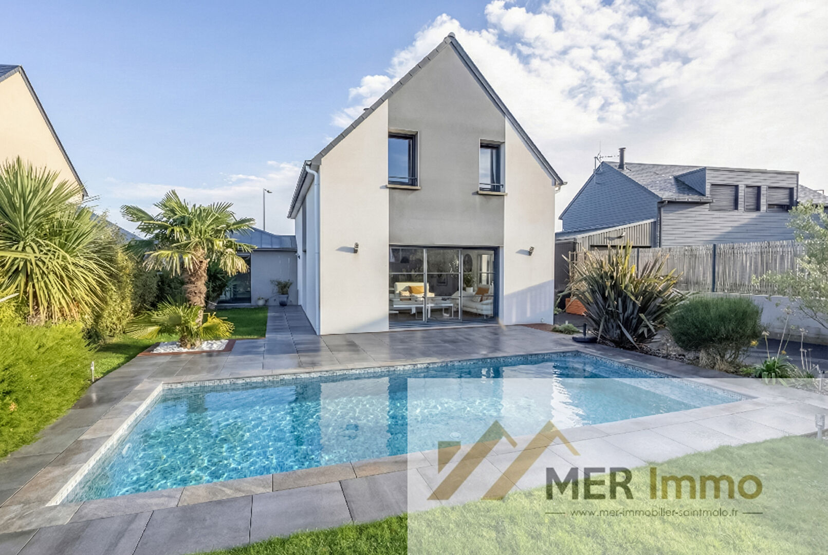 SAINT-MALO SAINT-IDEUC- EXCLUSIVITÉ MER Immobilier : Maison contemporaine de 2018 d'environ 140 m2 avec piscine et garage à proximité des plages et des commodités Située à Saint-Malo dans le quartier recherché de Saint-Ideuc, cette maison récente d'environ 140 m² séduit par son environnement calme et résidentiel, tout en étant proche des plages et des commodités. Au rez-de-chaussée, l'entrée s'ouvre sur un vaste salon-séjour lumineux exposé plein sud, avec accès direct à une grande terrasse. La cuisine ouverte, entièrement aménagée et équipée, offre un espace convivial et fonctionnel. Une suite parentale avec dressing, salle d'eau et accès à la terrasse complète ce niveau, ainsi qu'un bureau ouvert sur patio et des WC indépendants. A l'étage, un dégagement dessert trois chambres, une salle d'eau et des WC séparés. A l'extérieur, la maison bénéficie d'un jardin clos et arboré, d'une piscine et d'un garage, réunissant tout le confort recherché pour une maison familiale. La plage du Pont et le centre de Paramé sont accessibles en quelques minutes (environ 1,5 km) faisant de ce bien une opportunité rare sur le secteur. (3.96 % honoraires TTC à la charge de l'acquéreur.)
