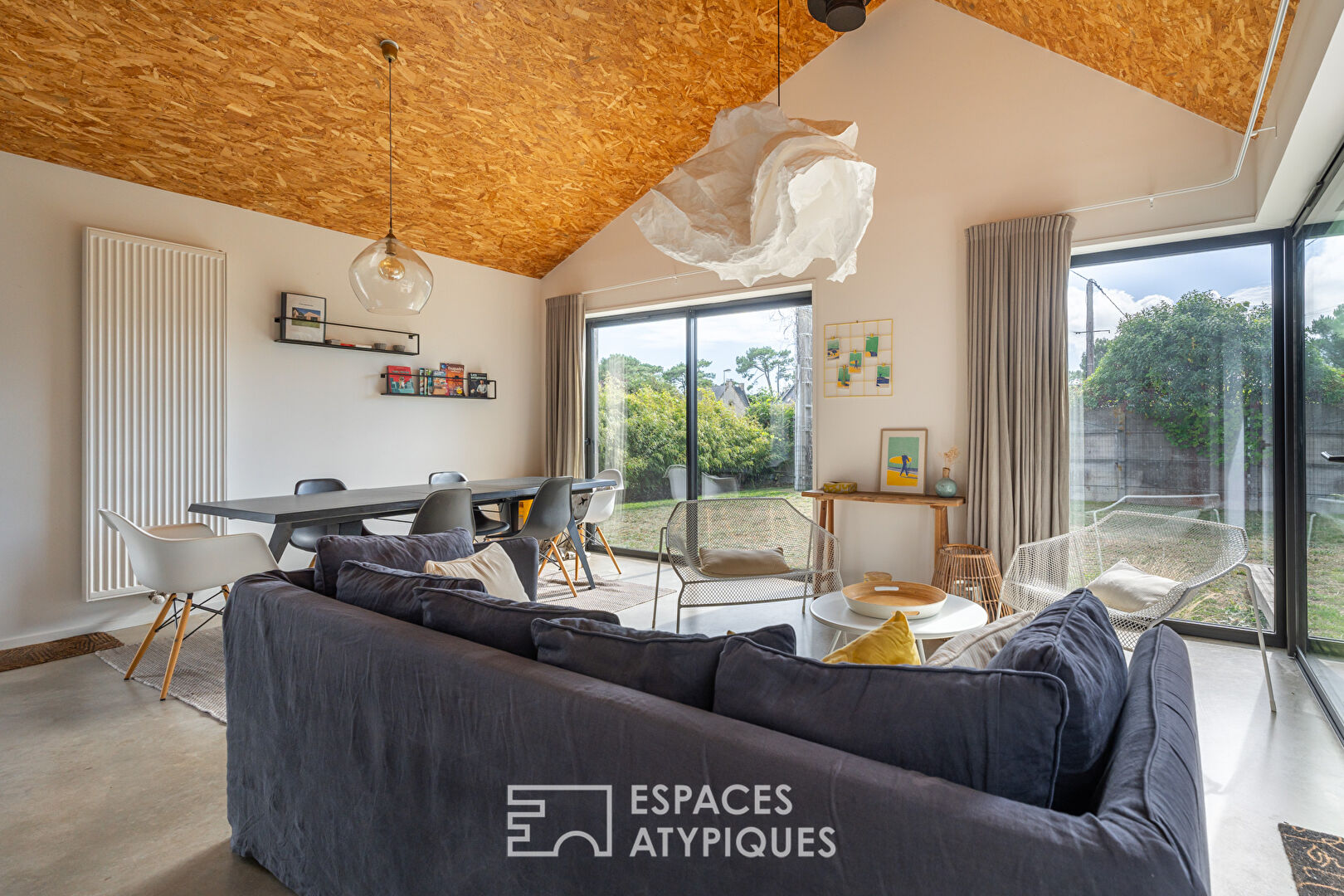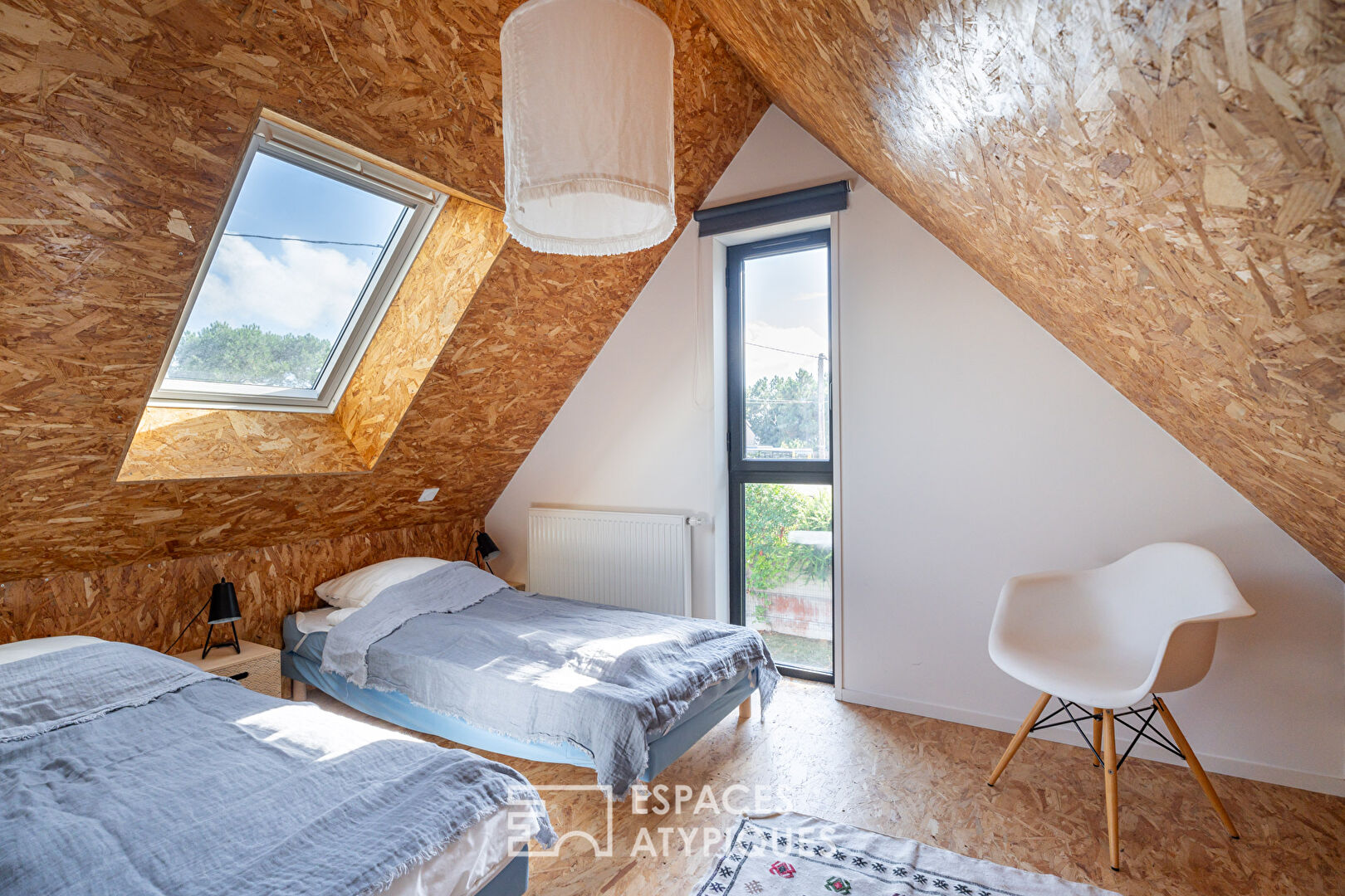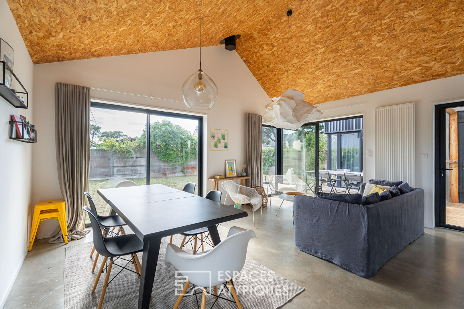 EXCLUSIVITÉ ESPACES ATYPIQUES A seulement cinq minutes à pied des plages dorées sur les hauteurs de PÉNESTIN et des sentiers côtiers, cette maison d'architecte en ossature bois d'environ 90 m² surface au sol allie charme et modernité. Nichée au calme, elle offre une accessibilité à pied ou à vélo des commerces. Cette habitation lumineuse évoque l'esprit des cabanes de surfeurs, un véritable havre de paix propice à la déconnexion. Dès l'entrée, vous serez transportés par l'ambiance chaleureuse. Le rez-de-chaussée s'ouvre sur un séjour lumineux, où la salle à manger et la cuisine équipée se rejoignent harmonieusement, créant un espace convivial pour partager de précieux moments. Une buanderie et un WC complètent ce niveau. Un passage vous mène vers deux chambres, chacune dotée de sa propre salle d'eau, dont l'une disposant également d'un WC pour plus de confort. A l'étage, les combles proposent un espace nuit supplémentaire Bercés par le doux murmure des vagues, le jardin et sa terrasse plein sud invitent à la sérénité Un abri de jardin permet également de stocker vélos, matériel de plage ou autres. Un stationnement extérieur privé fait également partie intégrante de la propriété. CLASSE ENERGIE : A / CLASSE CLIMAT : A Montant moyen estimé des dépenses annuelles d'énergie pour un usage standard, établi à partir des prix moyens des énergies indexés sur les années 2021, 2022, 2023 : entre 430 euros et 620 euros/an Les informations sur les risques auxquels ce bien est exposé sont disponibles sur le site géorisques : www.georisques.gouv.fr Denise Muteau RSAC Vannes 503 556 045 Contact : 06 12 71 52 43 Denise Muteau (EI) Agent Commercial - Numéro RSAC : 503 556 045 - VANNES.