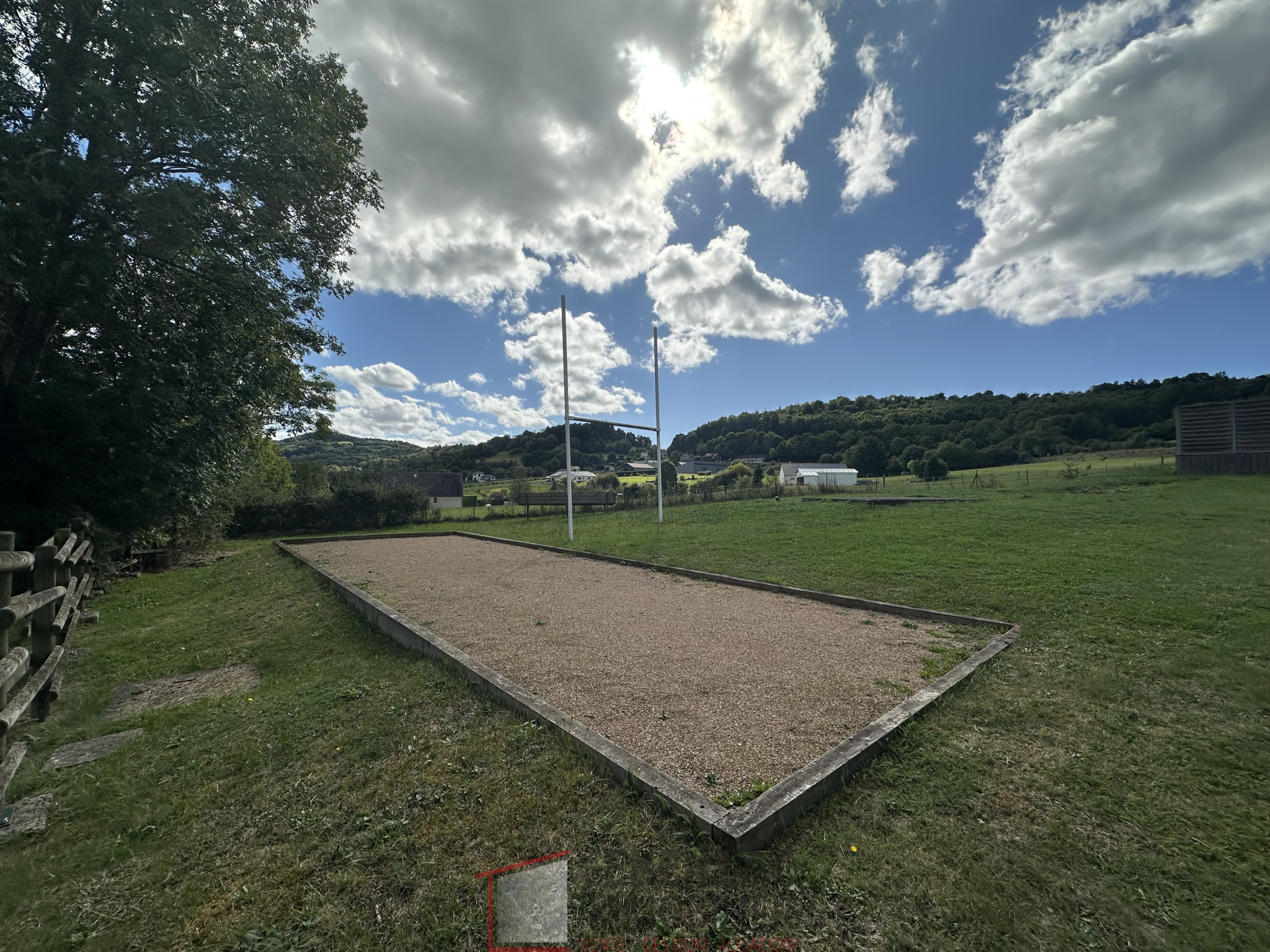 A l'extérieur : Une piscine hors-sol et une terrasse en bois exposée plein sud accessible depuis le séjour, un terrain de pétanque entretenu et des poteaux de rugby