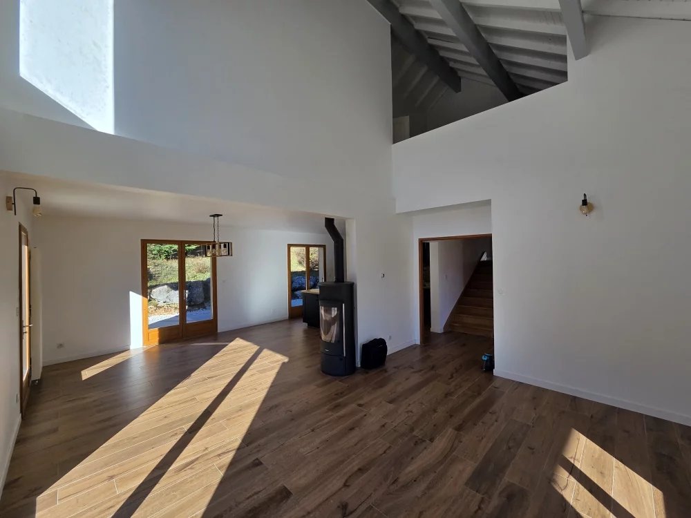 Se compose au rdc d'une belle pièce de vie cuisine meublée - salle à manger - salon, spacieuse et lumineuse d'une surface de 50m² avec poêle à bois,