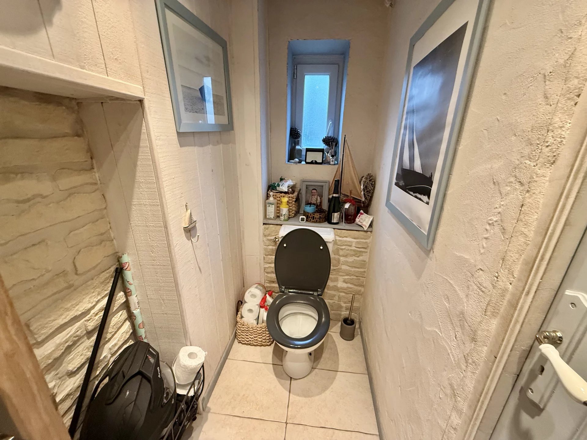 Au rez-de-chaussée : une double entrée avec rangement, un séjour, une cuisine aménagée et équipée avec un espace de réserve, un WC et une petite cave.