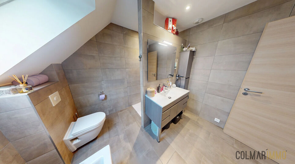 A Turckheim, au coeur du célèbre village viticole de la route des vins et à deux pas de toutes les commodités, laissez-vous séduire par cette maison récente construite en 2016. Le rez-de-chaussée s'ouvre sur une entrée avec placards, puis révèle un espace de vie lumineux et convivial avec cuisine ouverte sur le salon-séjour, offrant un accès direct à sa terrasse. Vous y trouverez également un toilette et un accès au garage. A l'étage, un dégagement mène à une salle de bains complète avec toilette, baignoire et douche, ainsi qu'à trois chambres. En annexes : un grenier, un garage. Ses atouts : proche de toutes commodités, facilité d'accès aux axes routiers , une terrasse équipée d'une pergola bioclimatique et aucun travaux à prévoir dans la maison. Le prix indiqué inclut l'ensemble des honoraires d'agence.