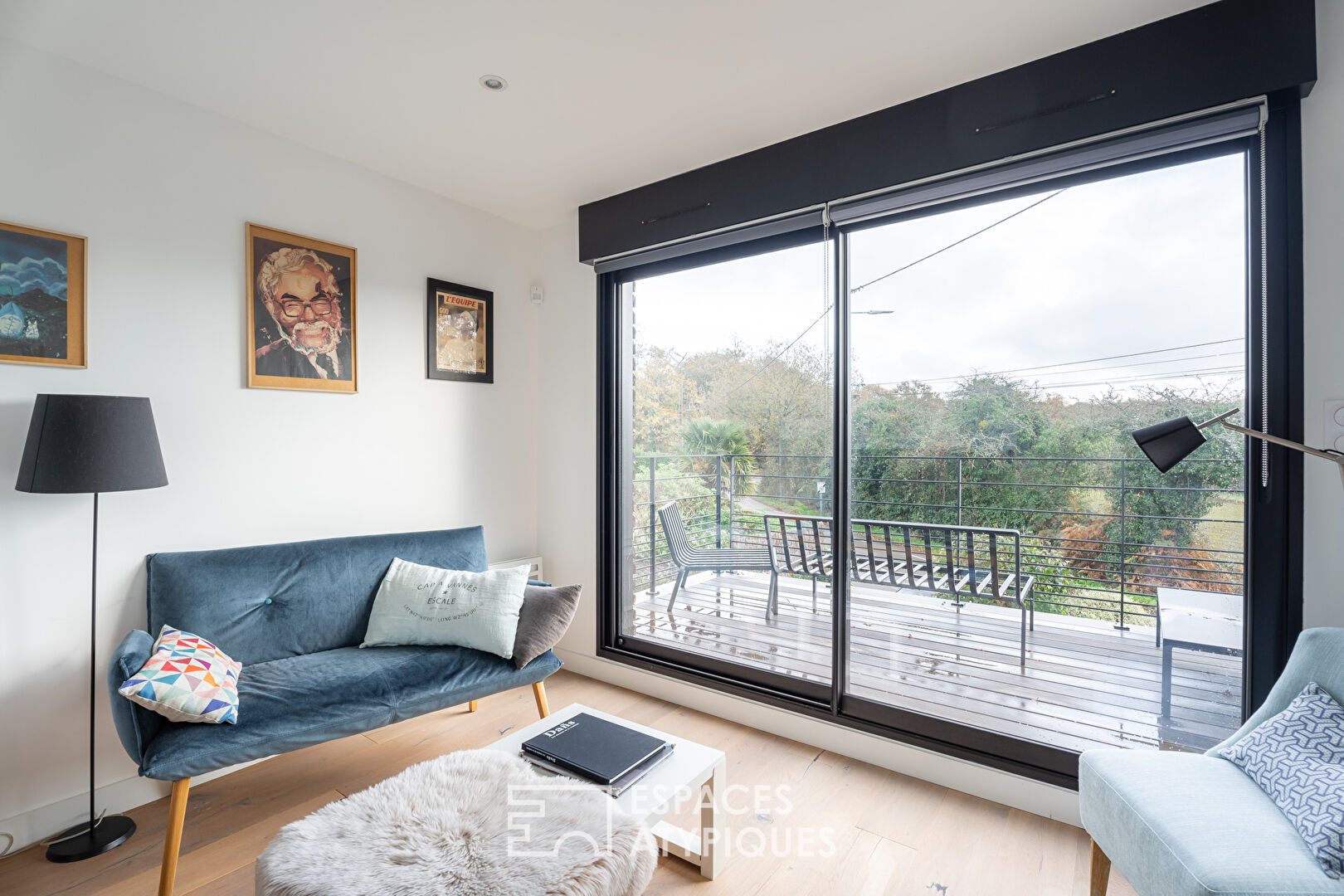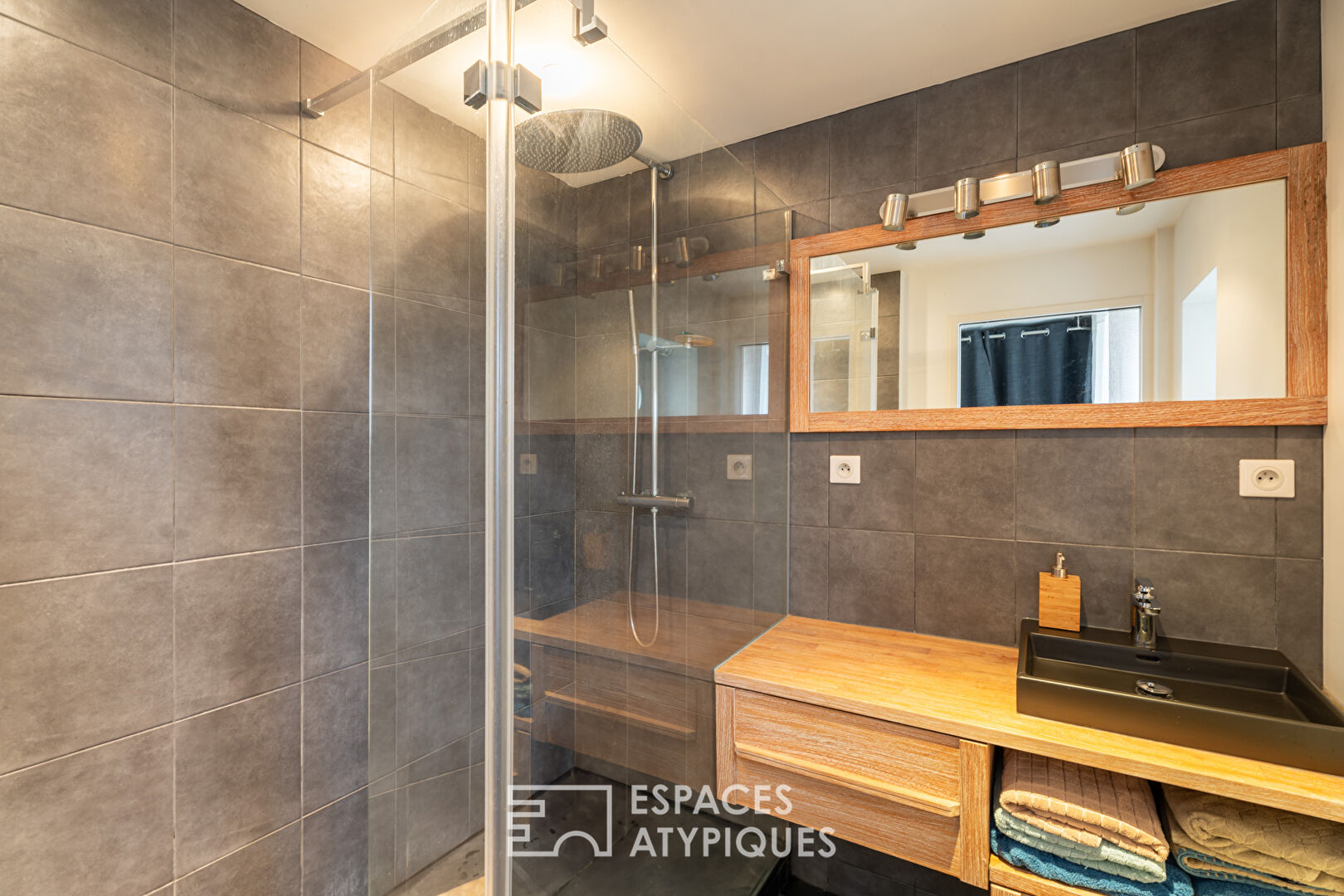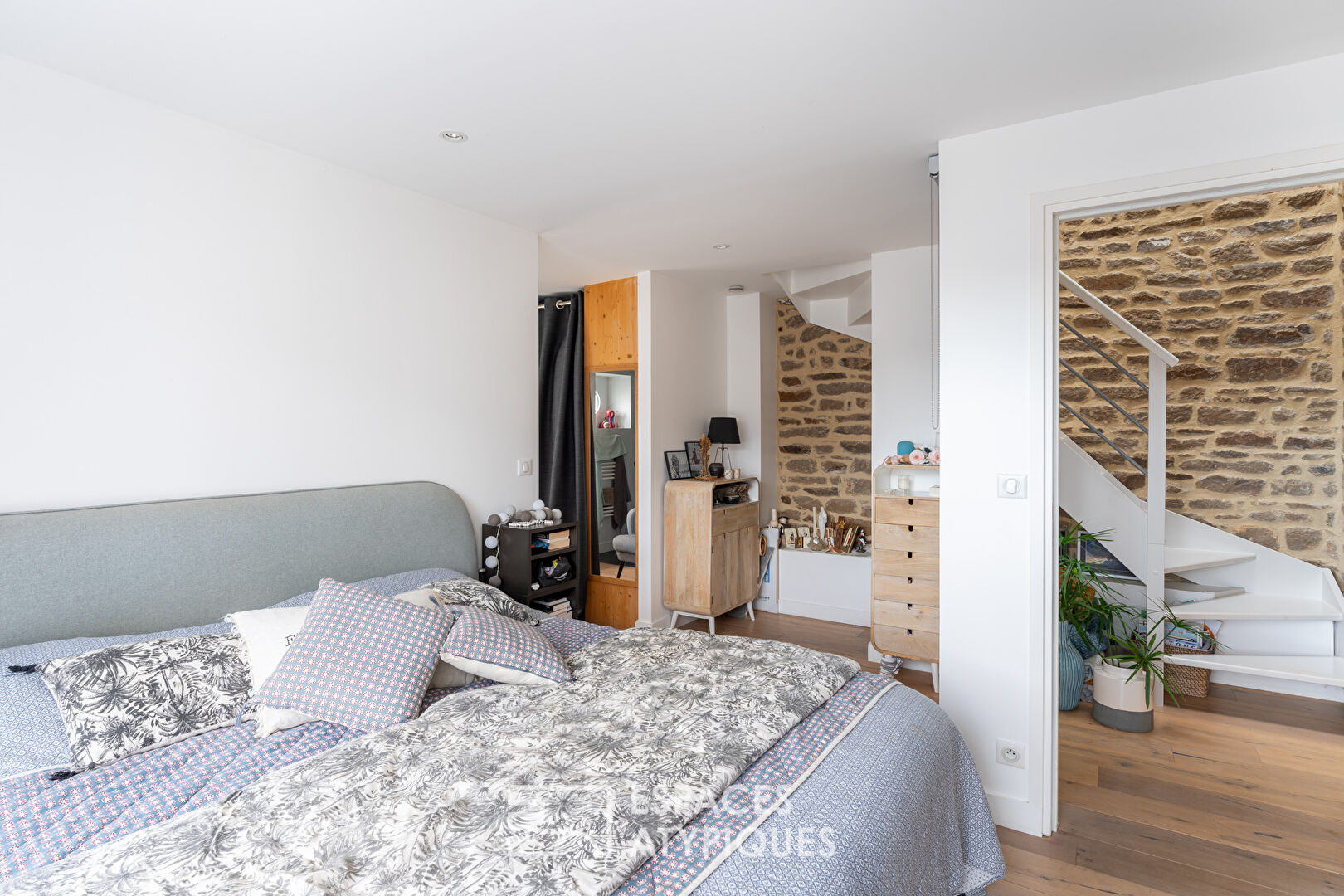 EXCLUSIVITÉ ESPACES ATYPIQUES A Arradon, à quelques minutes à pied des sentiers côtiers, cette maison de 151 m² est le fruit d'une rénovation récente, mariant le charme de l'ancien, grâce à ses pierres apparentes d'origine, et l'esthétique contemporaine du bois qui compose son extension. La pièce à vivre s'organise autour d'un élégant poêle à bois, offrant un espace de réception chaleureux ouvert sur le jardin. La cuisine ouverte, aménagée et équipée, profite d'un puits de lumière grâce à un plancher de verre. Elle est complétée par une arrière-cuisine et une remise. Le rez-de-chaussée accueille également une chambre parentale avec salle d'eau privative, idéale pour une vie de plain-pied. L'étage dessert une ingénieuse mezzanine, qui mène à quatre chambres, dont une chambre équipée d'un lit double superposé, réalisé sur mesure. Les trois autres chambres bénéficient d'un balcon avec une vue dégagée. Une salle de bains, une salle d'eau et un dressing complètent l'ensemble. L'aménagement intérieur a été pensé dans les moindres détails avec des réalisations sur mesure, du mobilier aux rangements, dans le cadre d'une rénovation réalisée avec des matériaux de qualité. A l'extérieur, le jardin clos et paysager est soigneusement entretenu. L'espace se prolonge naturellement par la terrasse exposée Sud et Est, idéale pour profiter du soleil. Un abri de jardin offre un espace de rangement bienvenu. Le bien se trouve dans un quartier calme, à 3km environ du bourg. Un lieu singulier, pensé avec soin, prêt à révéler son potentiel à ceux qui recherchent un bien rare. CLASSE ÉNERGIE : C / CLASSE CLIMAT : A Montant moyen estimé des dépenses annuelles d'énergie pour un usage standard, établi à partir des prix moyens des énergies indexés sur les années 2021, 2022 et 2023 : entre 1 320 euros et 1840 euros/an Les informations sur les risques auxquels ce bien est exposé sont disponibles sur le site Géorisques : www.georisques.gouv.fr Marion TONIN Tél: 06 08 36 10 99 RSAC Vannes 822 590 345 Marion Tonin (EI) Agent Commercial - Numéro RSAC : 822 590 345 - VANNES.