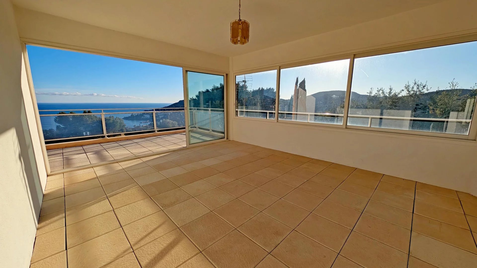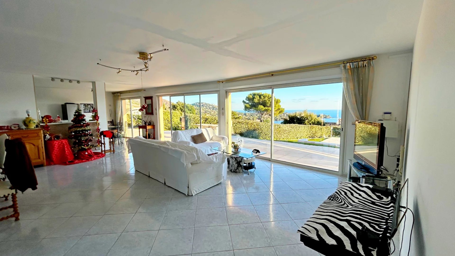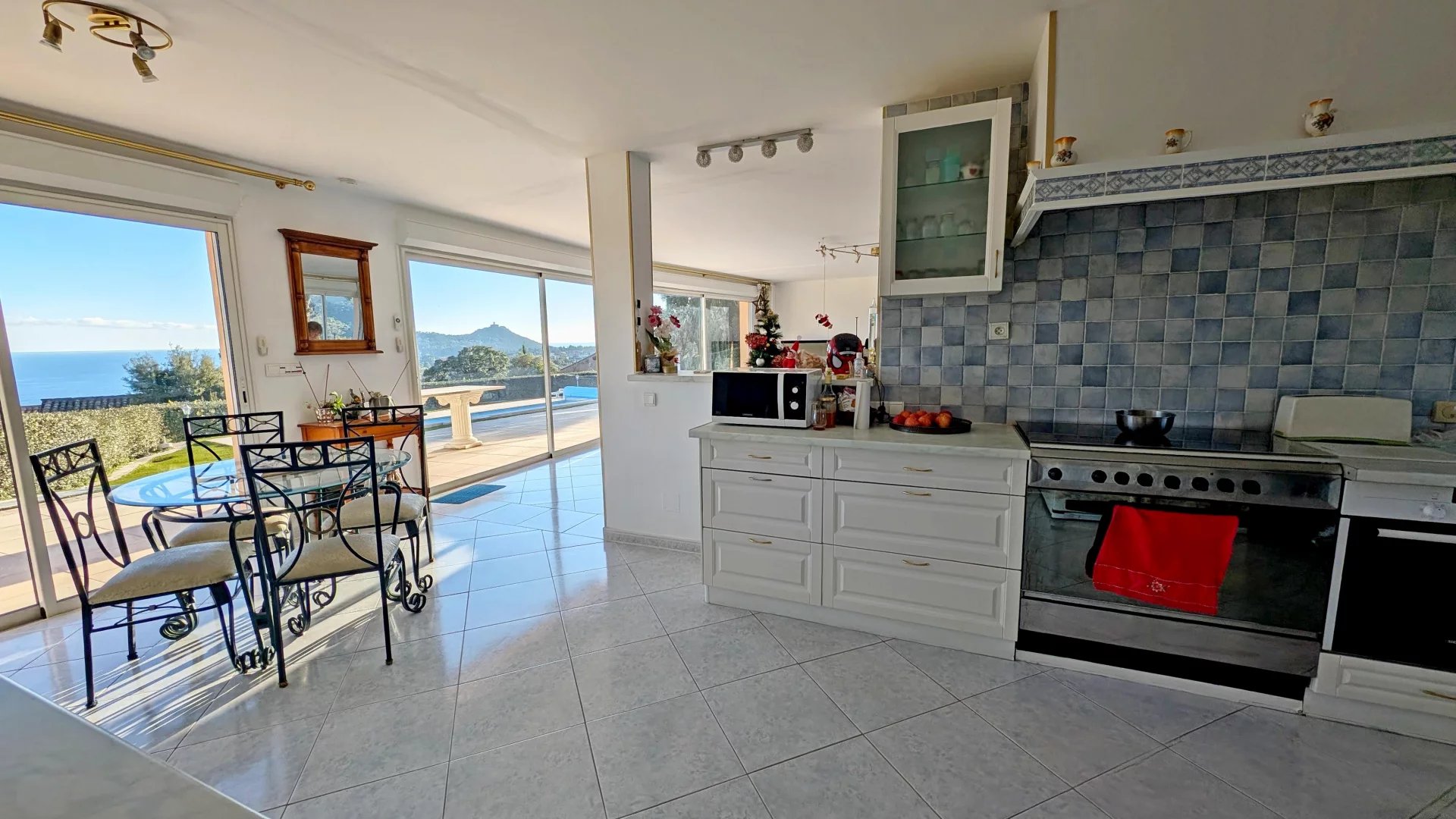 Un séjour à l’étage avec cuisine équipée, entièrement vitré, prolonge le plaisir de la vue et mène à une véranda panoramique à 180°, spectaculaire, qui devient un lieu de vie à part entière en toute saison. De là, la terrasse s’étire face à la mer, offrant un panorama rare sur la baie d’Agay.