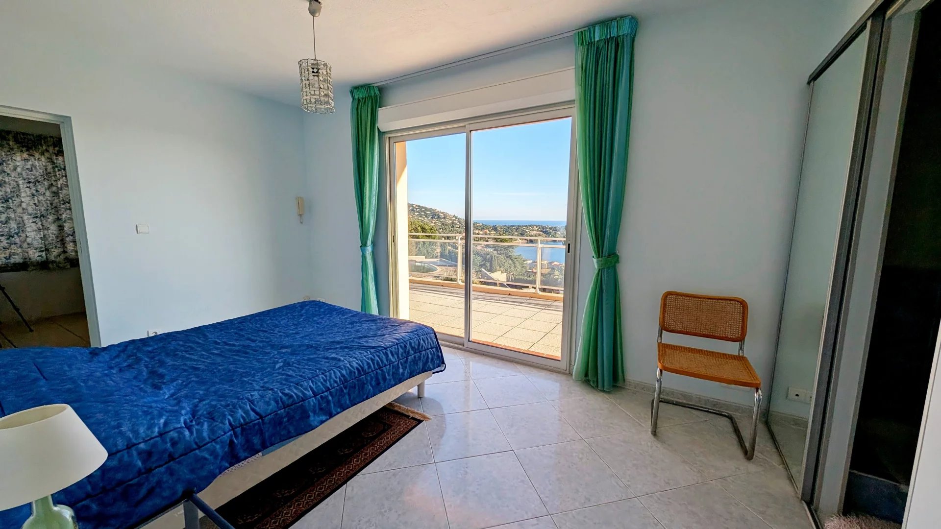 À l’étage supérieur, l’atmosphère devient encore plus spectaculaire. Deux chambres supplémentaires, chacune avec sa salle de bain privative, s’ouvrent directement sur une grande terrasse surplombant la piscine, le massif de l’Esterel et la baie d’Agay. L’une d’elles bénéficie en plus d’un accès à une véranda, véritable cocon baigné de lumière.