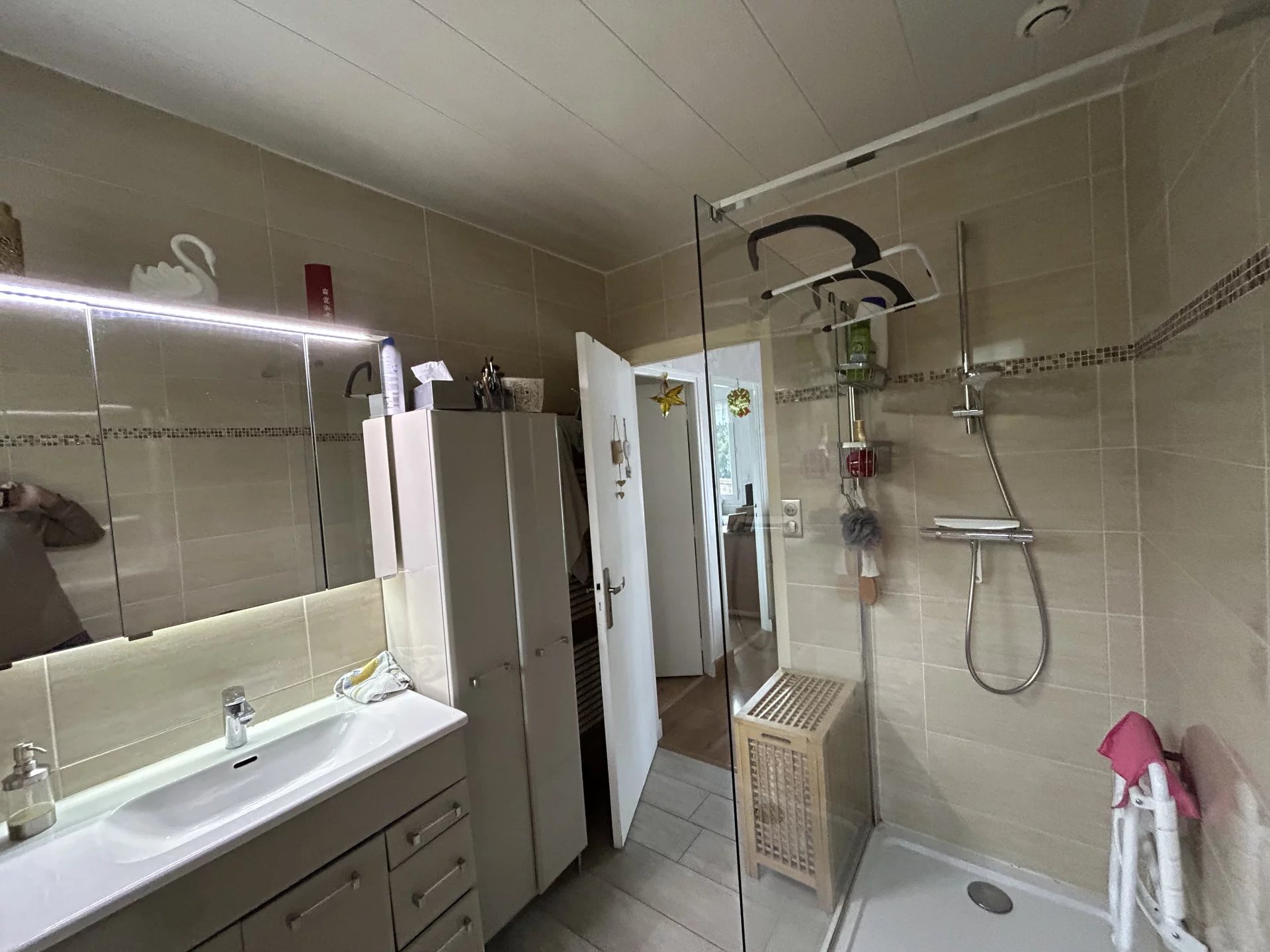 A VENDRE - Dans un secteur calme et agréable, proche transports, Beau PAVILLON Individuel de plain pied de 61.93 m2 + 12 m2 de pièce possible en sous-sol, en très bon état général comprenant entrée, cuisine aménagée et équipée, beau séjour salon, 2 chambres, salle de douche, chauffage central au gaz de ville, sur sous-sol complet avec garage + 1 pièce (chambre possible), beau jardin clos de 547 m2.